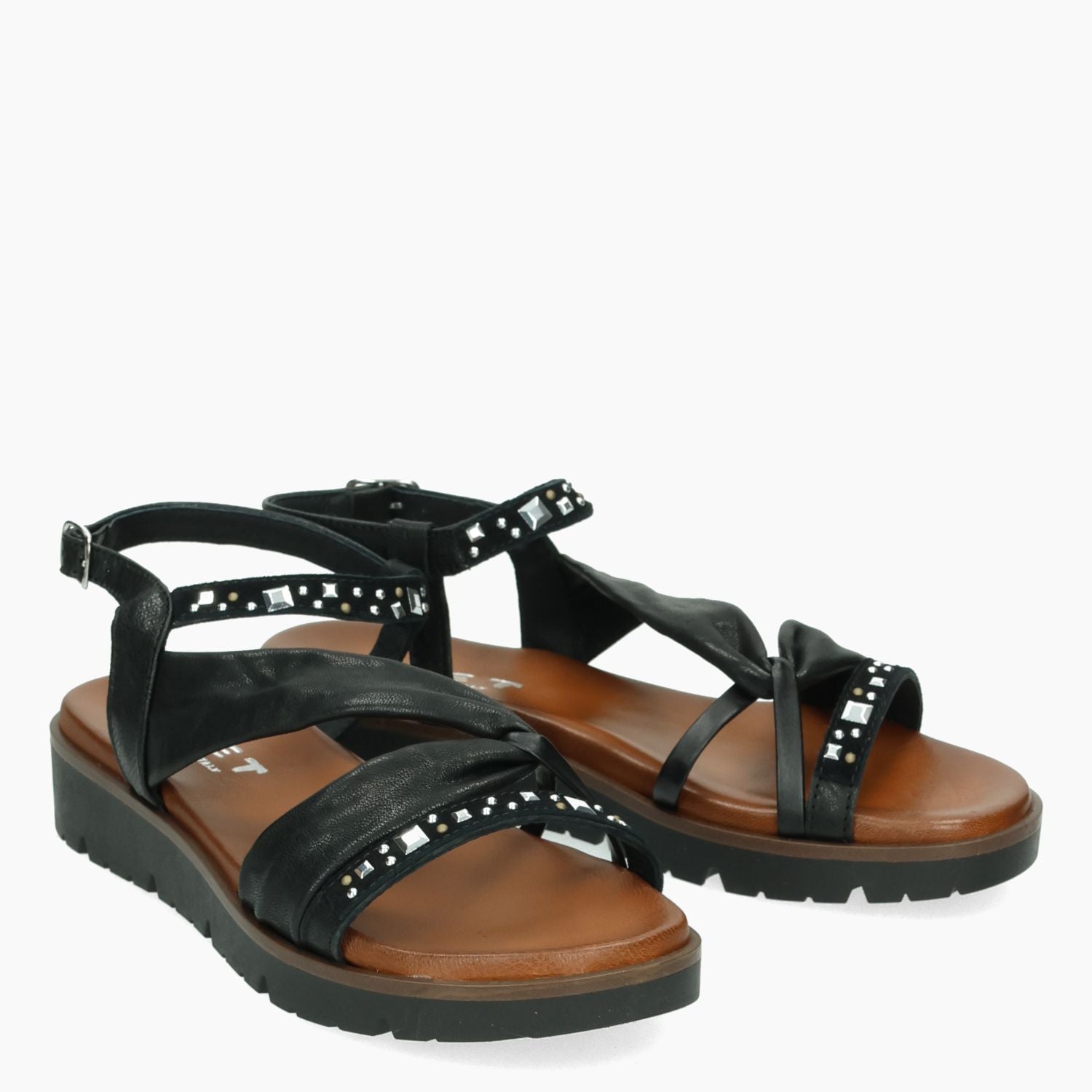 Tre T Sandale mit schwarzem Leder-Obermaterial und silbernen Nieten. Riemenverschluss. Lederfutter mit gepolsterter Innensohle. Gummisohle mit 3,5 cm hohem Keilabsatz. Tre T Damen-Frühjahr/Sommer-Kollektion.
