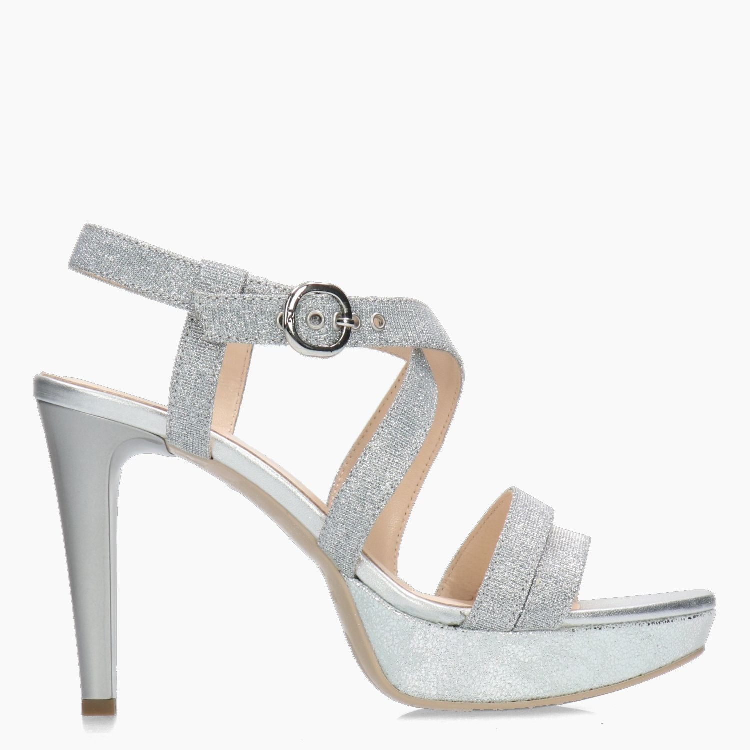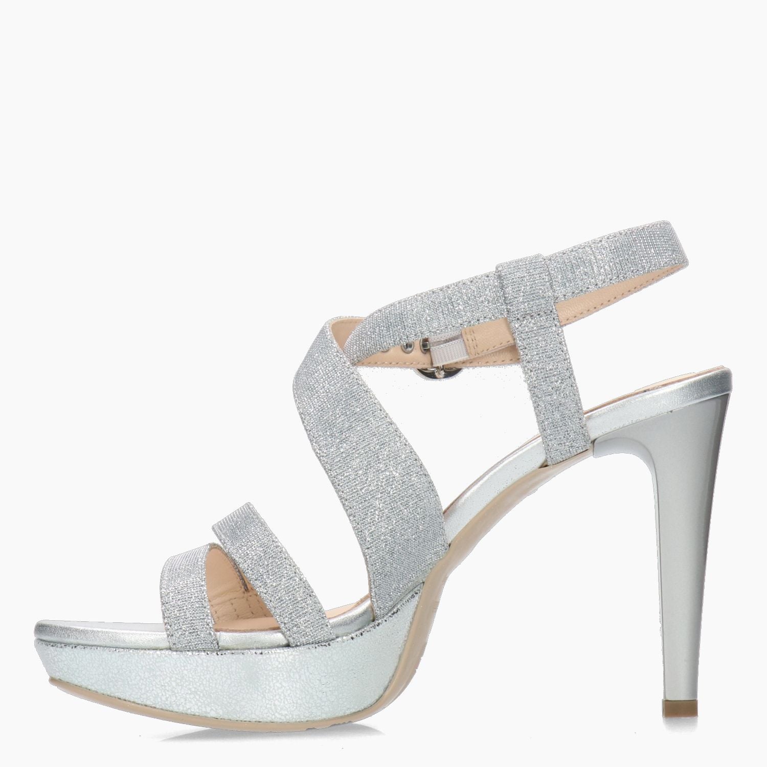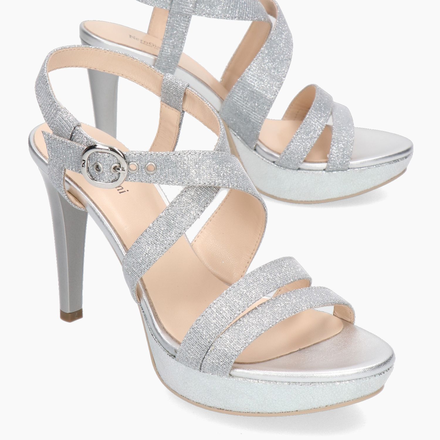 Sandale aus silberfarbenem, laminiertem Stoff. Gekreuzter Riemen mit verstellbarer Logoschnalle. Lederfutter. Gummisohle mit 9,5 cm Absatz und 2,5 cm hohem, silberfarbenem Plateau. Aus der Damen-Frühjahr/Sommer-Kollektion von Nero Giardini.