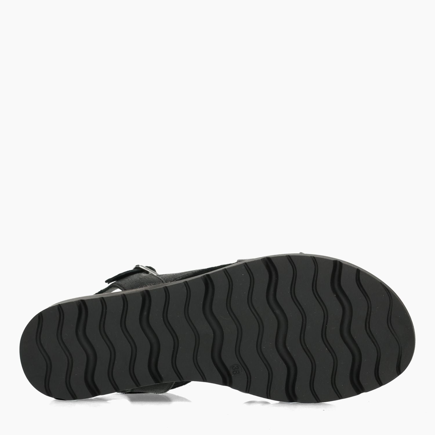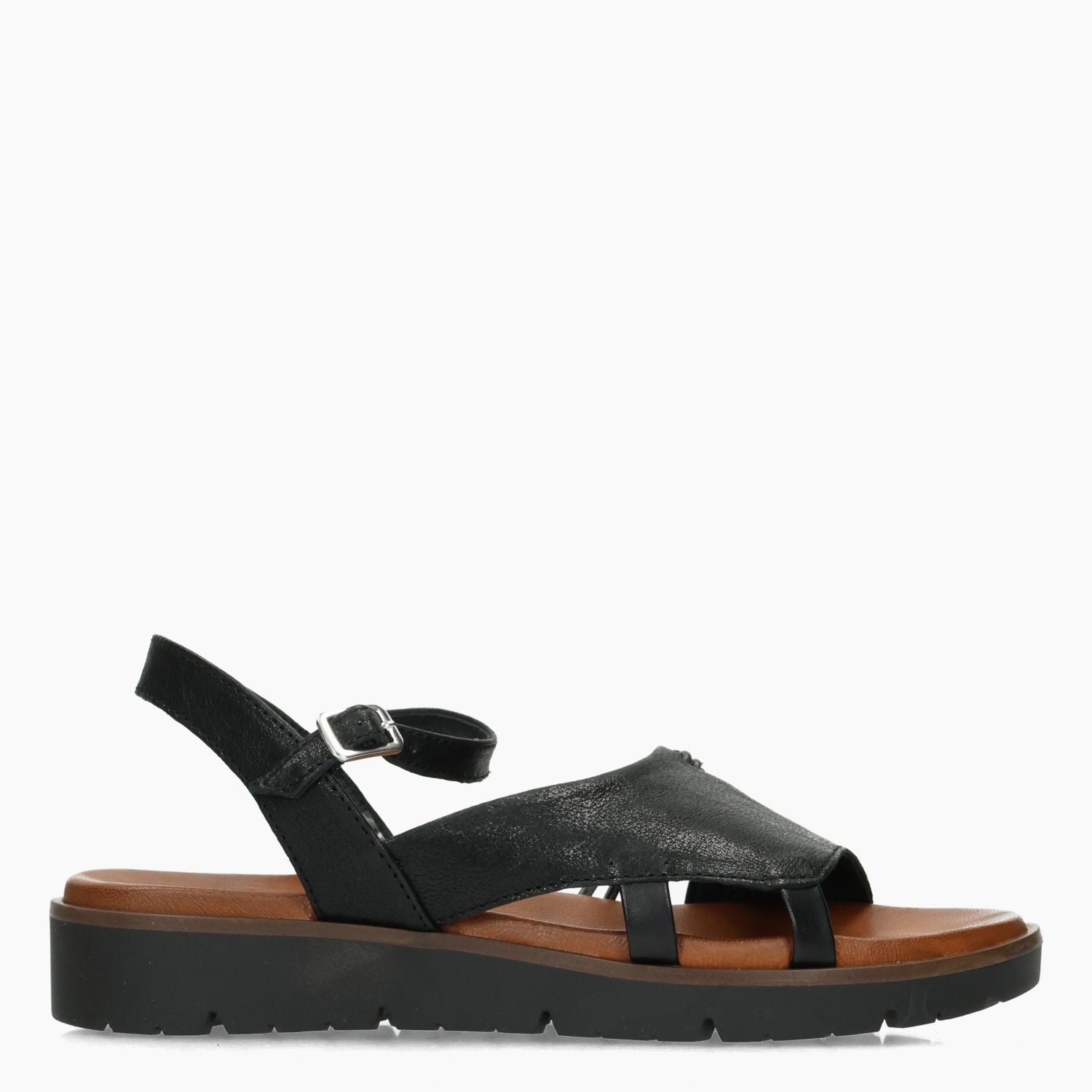 Tre T Sandale mit schwarzem Leder-Obermaterial. Riemenverschluss. Lederfutter mit gepolsterter Innensohle. Gummisohle mit 3,5 cm hohem Keilabsatz. Tre T Damen-Frühjahr/Sommer-Kollektion.