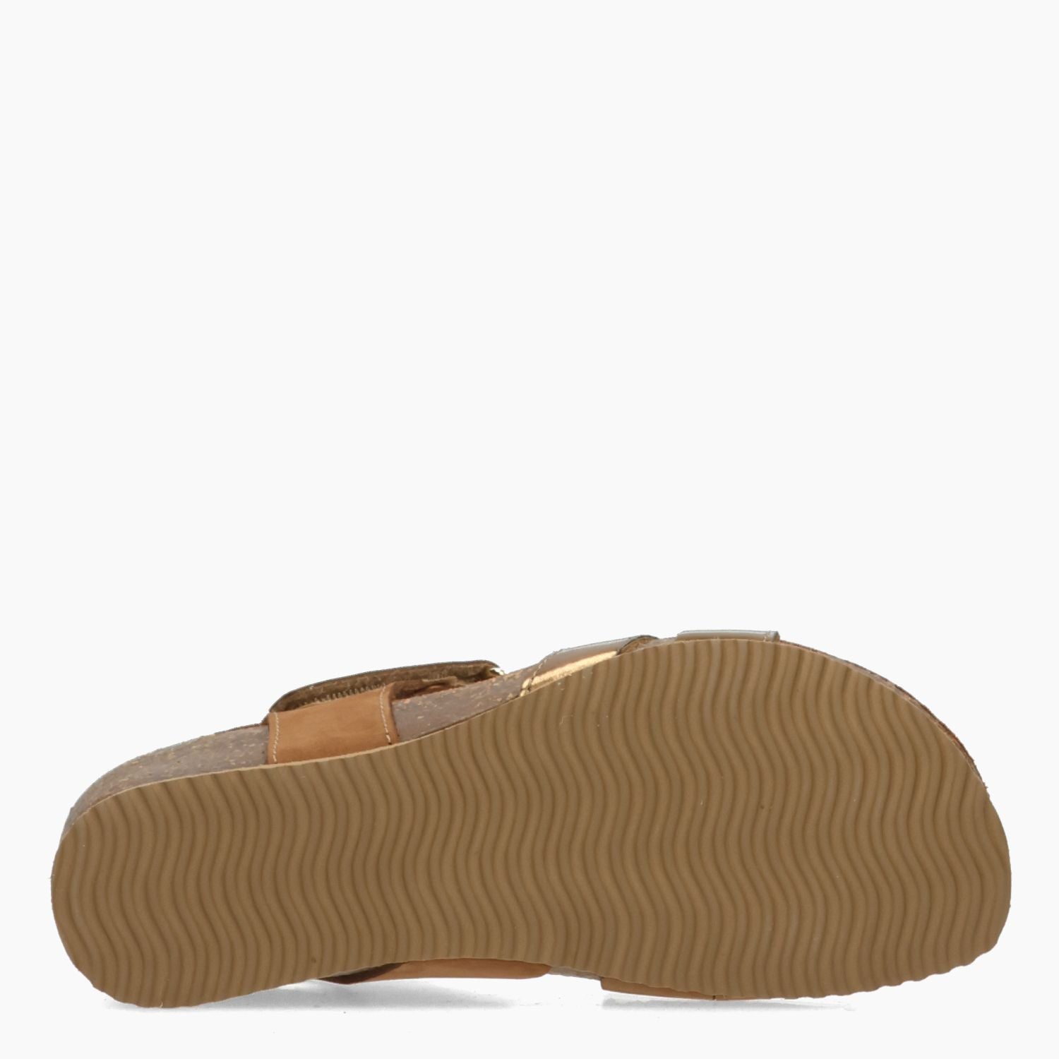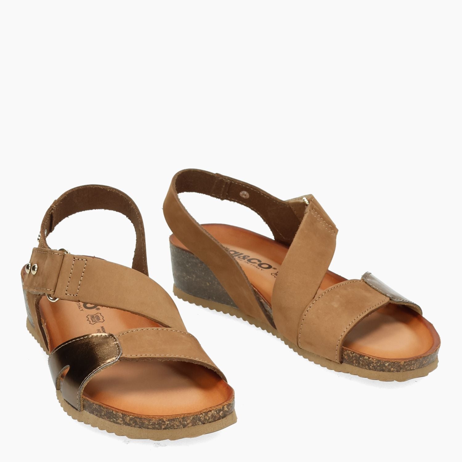 Sandale aus hellbraunem Nubukleder und bronzefarbenem Laminatleder. Verstellbarer Klettverschluss. Lederfutter mit Memory-Schaum-Innensohle aus Leder. Gummisohle mit 3 cm hohem Keilabsatz. Igi&Co Damen-Frühjahr/Sommer-Kollektion.