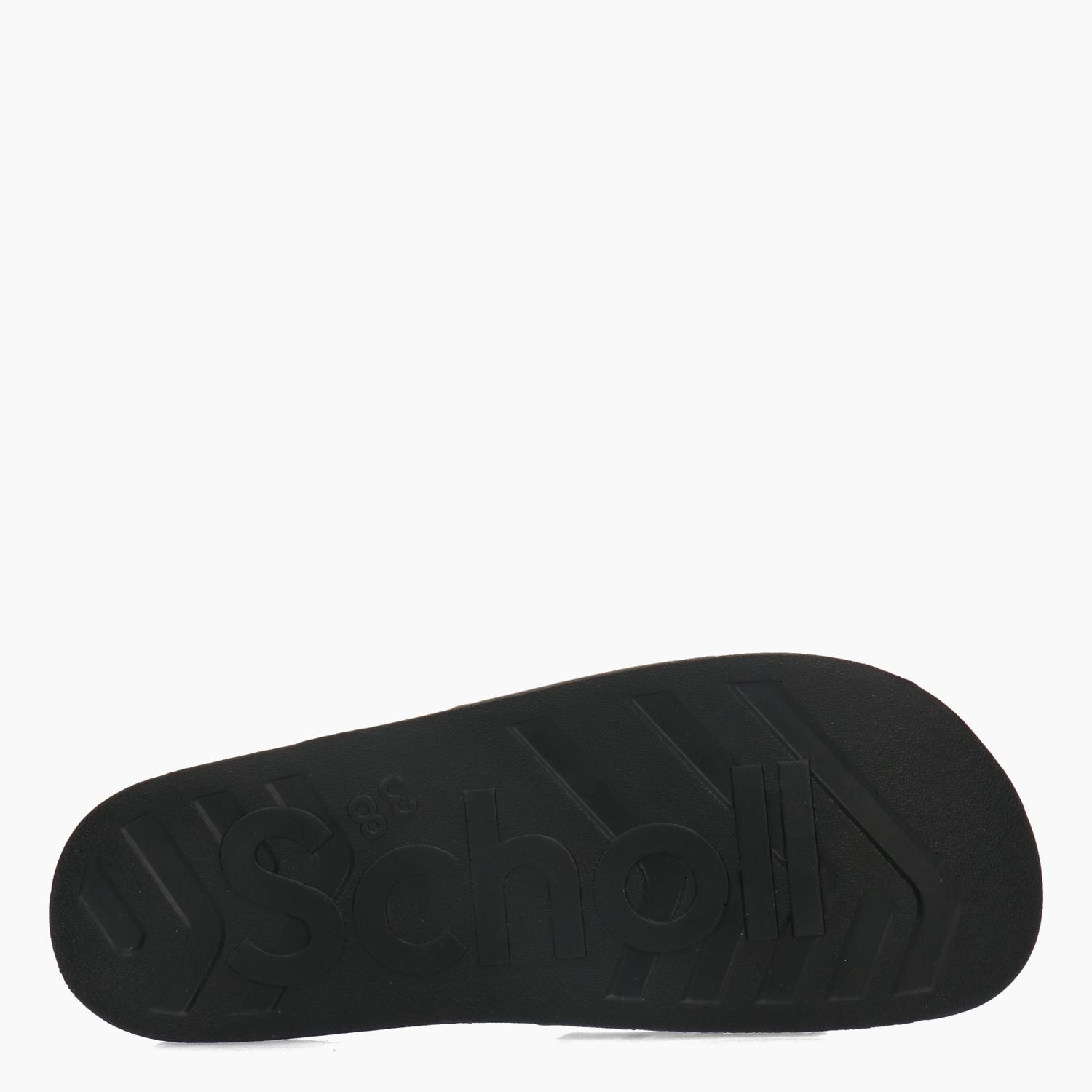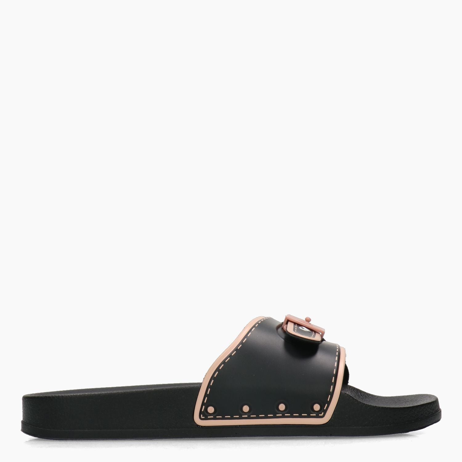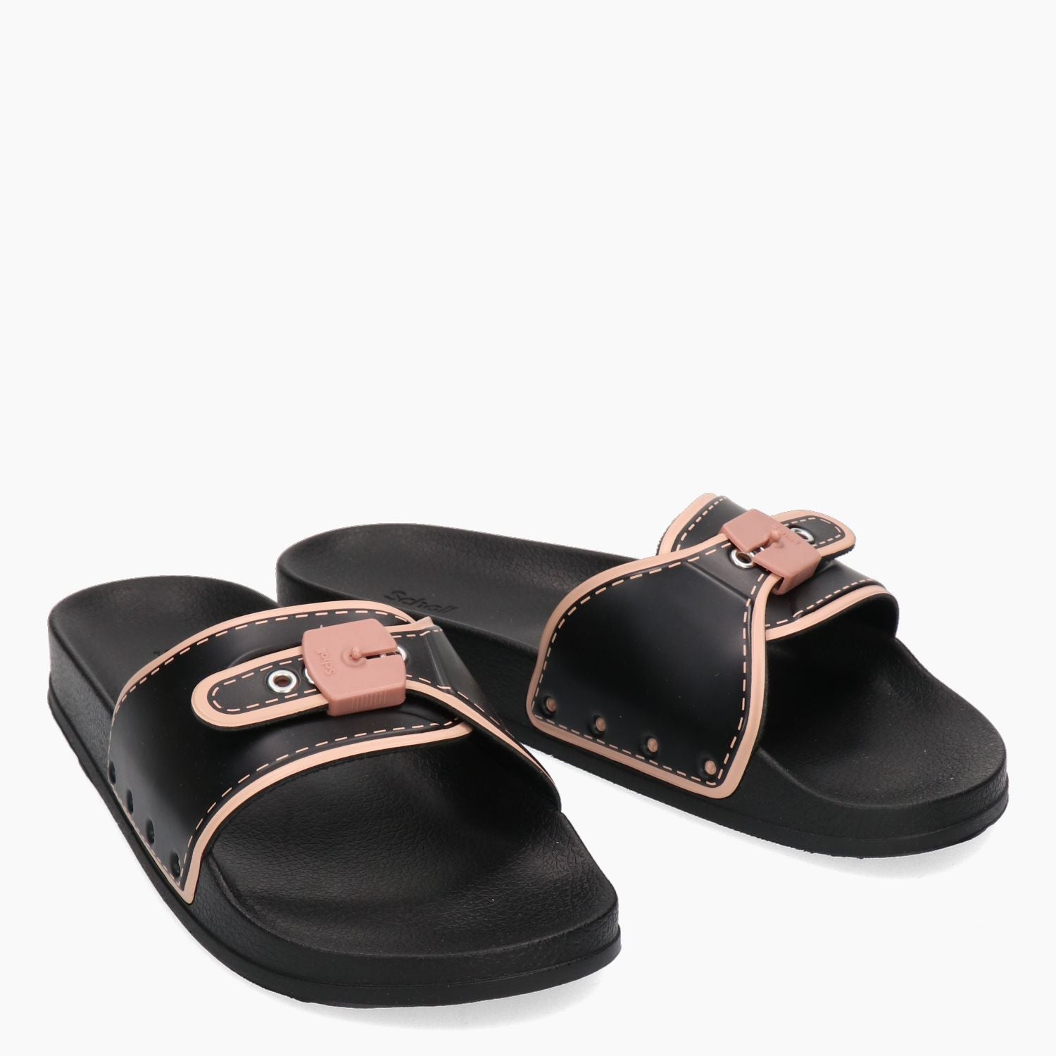 Schwarzer Gummipantoffel mit rosa Zierstreifen und verstellbarer Schnalle. Anatomisch geformte Innensohle. 2 cm hohe Gummisohle. Aus der Sholl Damenkollektion.