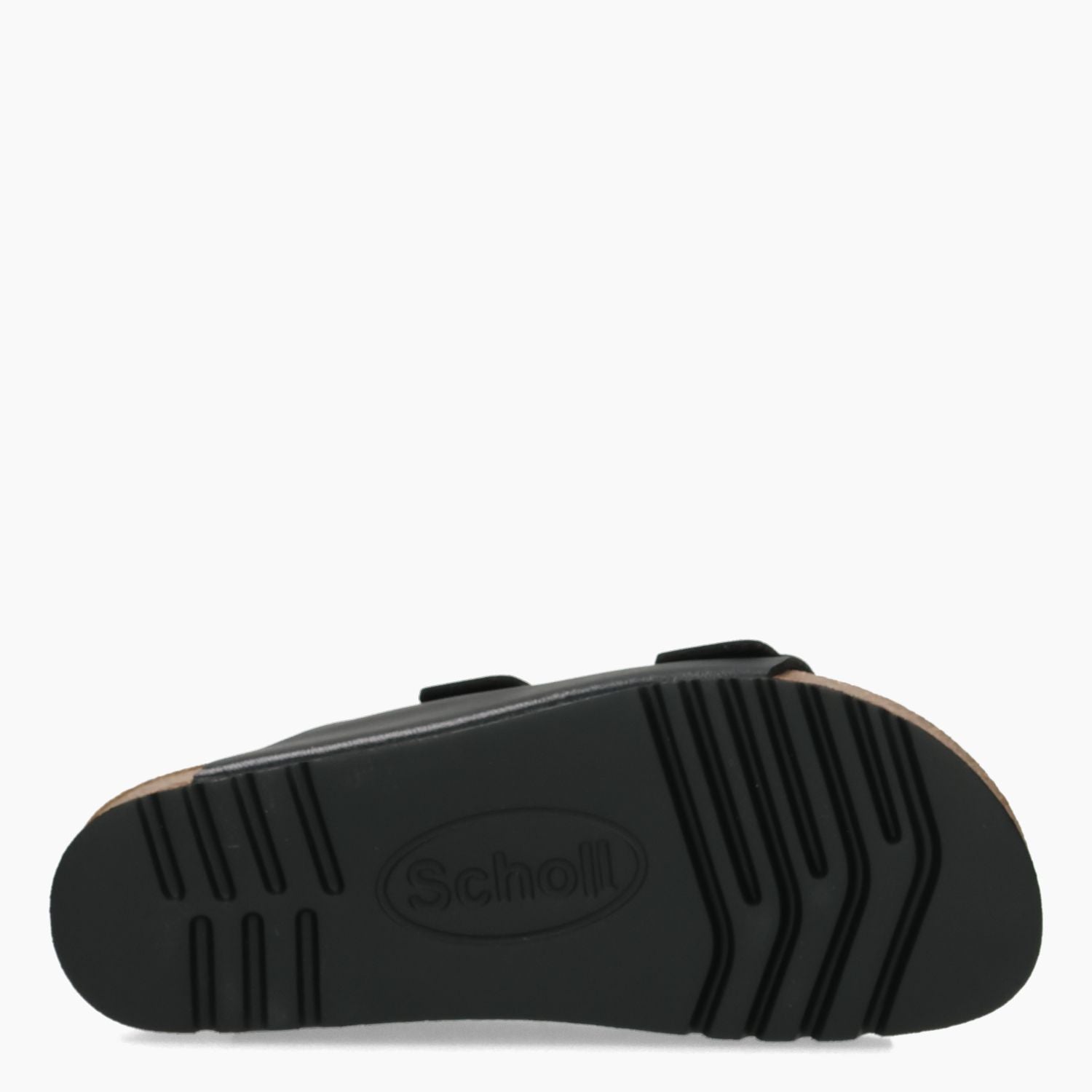 Schwarzer Pantoffel aus Kunstleder mit doppelter Schnalle. Verstellbar mit goldenen Schnallen. Anatomisch geformte Lederinnensohle mit Mikrofaserfutter. 2 cm hohe Gummisohle. Damenkollektion Sholl.