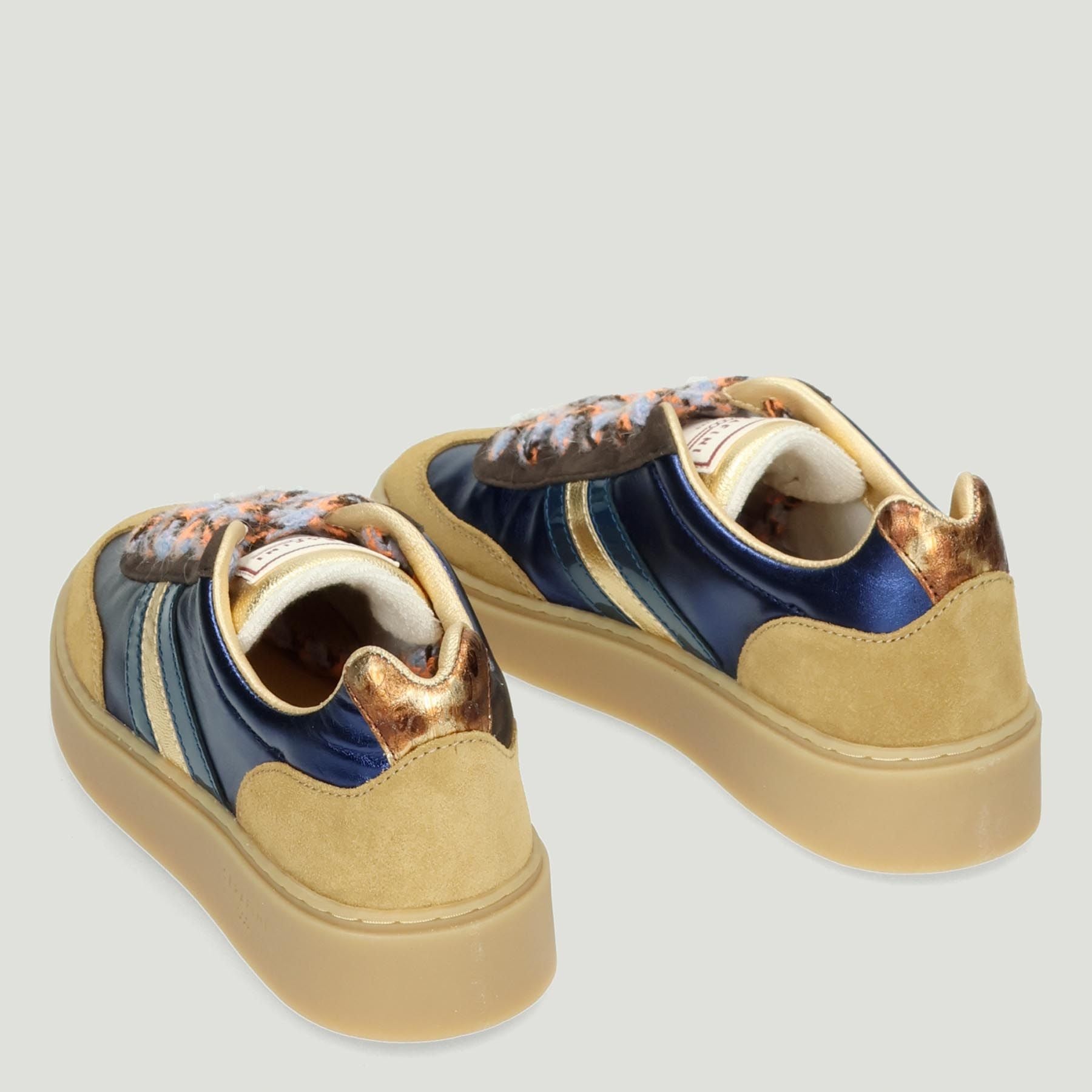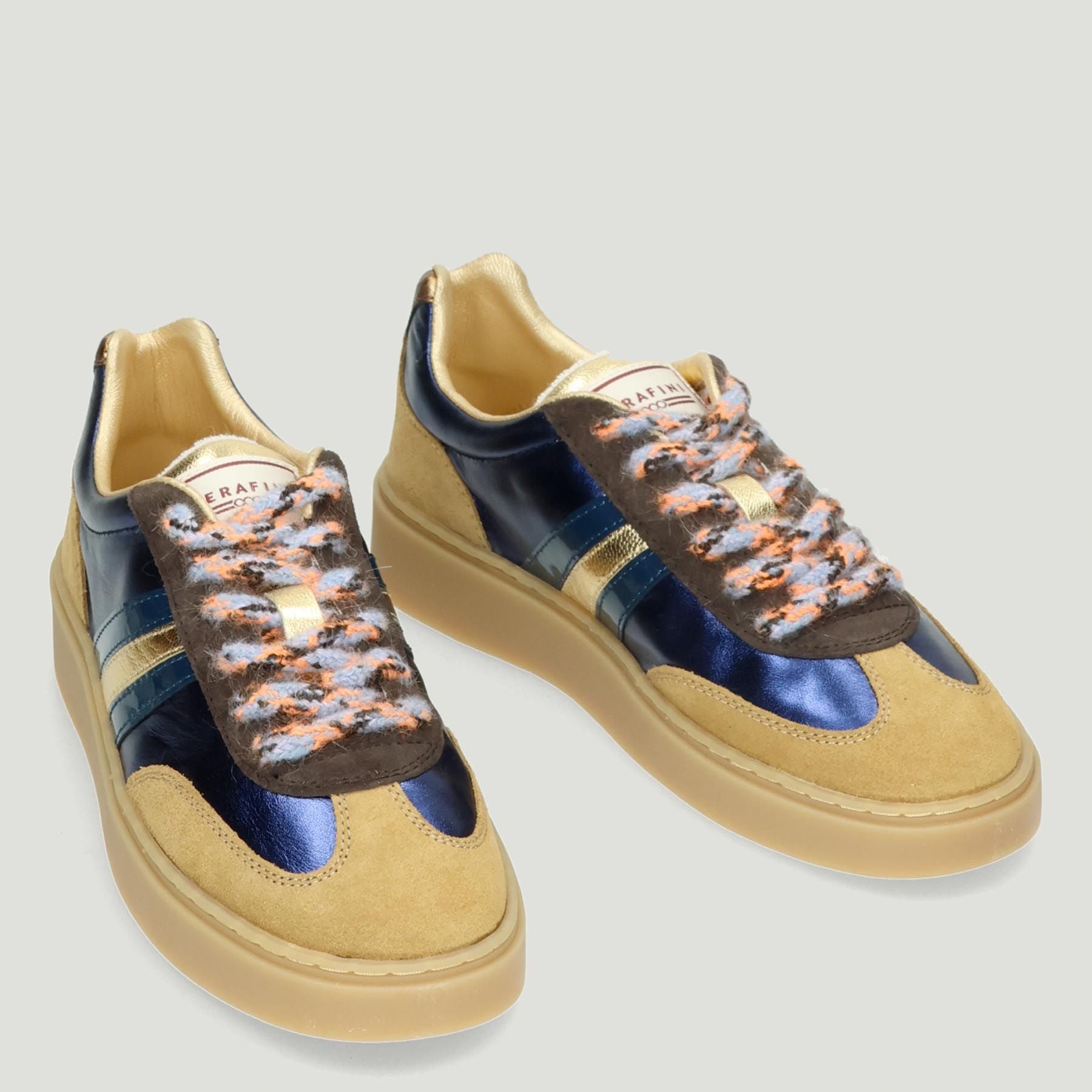 Perlmuttblaue Ledersneaker mit kamelfarbenem Velourslederbesatz. Schnürverschluss mit gemusterter Wolloptik. Ein bordeauxroter Baumwollschnürsenkel ist im Lieferumfang enthalten. Leder- und Textilfutter mit herausnehmbarer Innensohle. 3 cm hohe Sohle aus Mastixgummi. Serafini Damenkollektion.