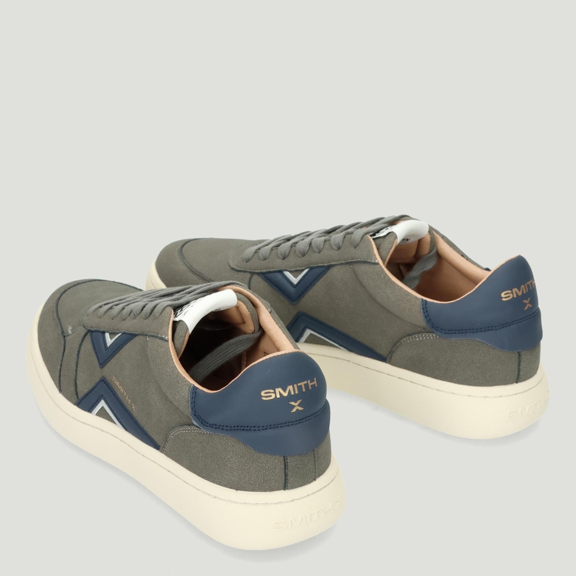 Ocean Sneaker mit taubengrauem Obermaterial aus Velourslederimitat. Blaue Fersenkappe aus Kunstleder mit Logo. Herausnehmbare Innensohle aus Kunstleder mit Textilfutter. Baumwollschnürsenkel. Logo-Zunge. 3 cm hohe Gummisohle. Smith X Herrenkollektion.