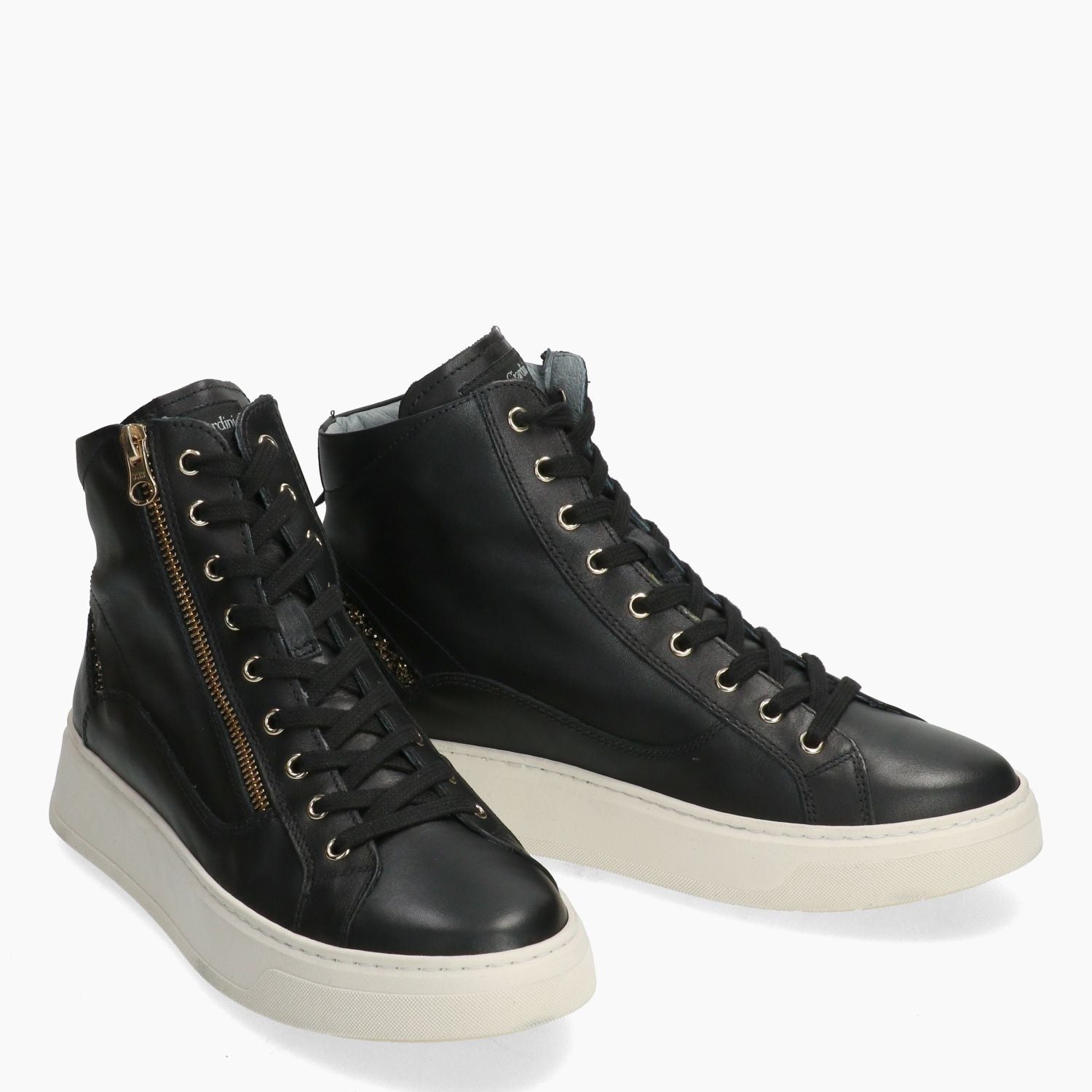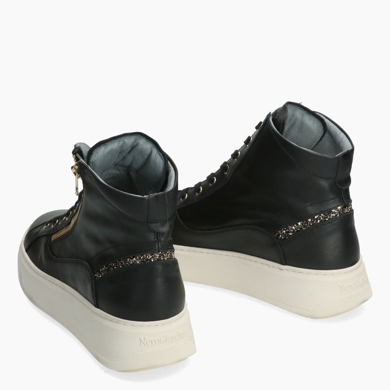 Schwarzer High-Top-Sneaker aus Leder. Schnürverschluss mit goldfarbenem Seitenreißverschluss. Lederfutter mit herausnehmbarer Innensohle. Glitzernder Absatz. Gummisohle mit 4,5 cm hohem Keilabsatz. Aus der Herbst-/Winterkollektion von Nero Giardini für Damen.
