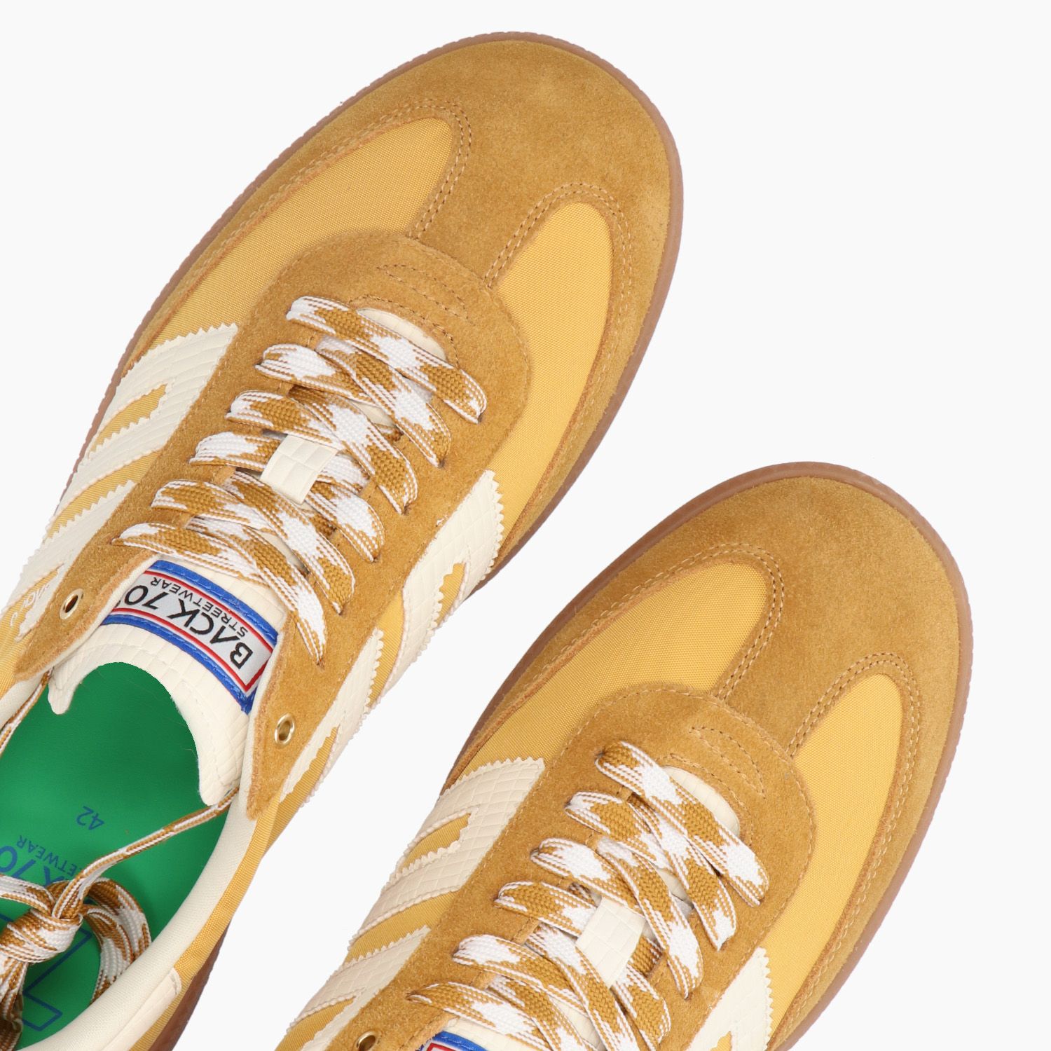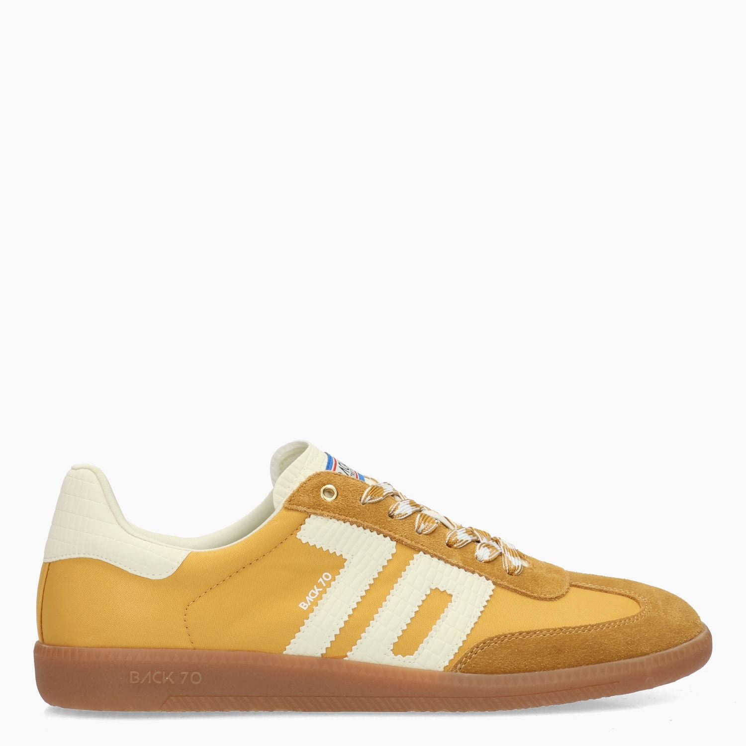 Ockergelbe Nylon-Sneaker mit passenden Wildledereinsätzen. Elfenbeinfarbenes Lederlogo an der Seite. Gemusterter Schnürverschluss mit einem zusätzlichen Paar ecrufarbener Baumwollschnürsenkel. Textilfutter mit herausnehmbarer Innensohle. Kittfarbene Gummisohle. Aus der Herren-Frühjahr/Sommer-Kollektion Back 70.