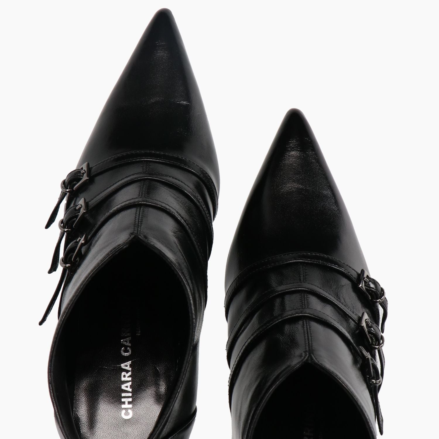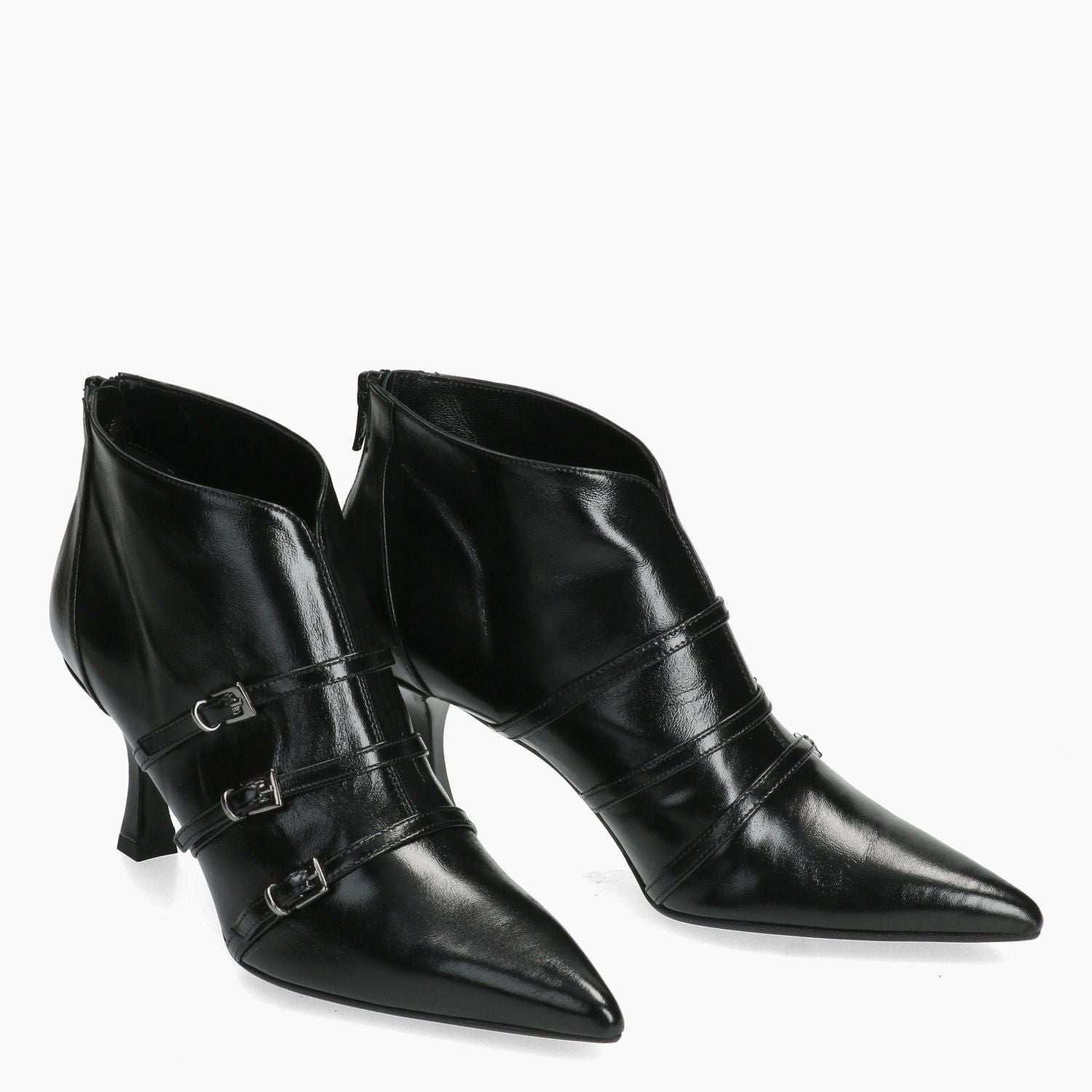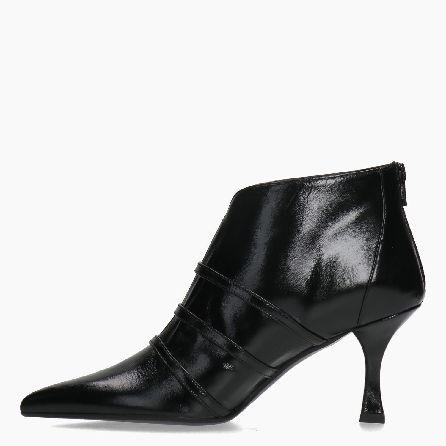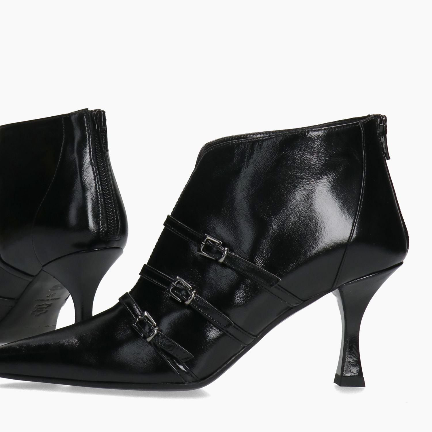 Schwarze Lackleder-Ankle-Boots mit Zierriemen. Reißverschluss hinten. Lederfutter. Sohle aus Leder und Gummi mit 6,5 cm Absatz. Chiara Carrino Damen-Herbst-/Winterkollektion.