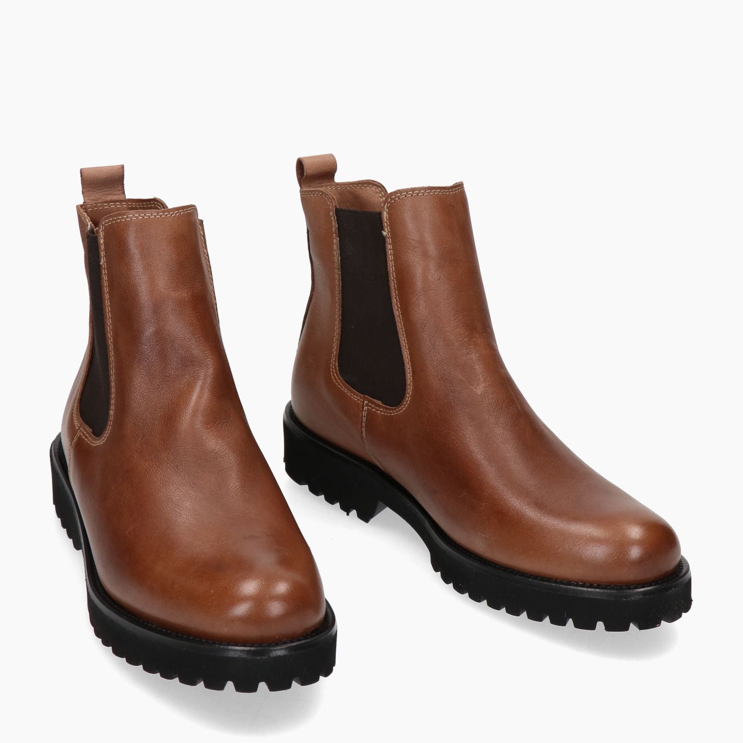 Stiefeletten mit hellbraunem Leder-Obermaterial. Runde Zehenpartie. Braune elastische Einsätze an den Seiten. Lederfutter. 3,5 cm hohe, geriffelte Gummisohle. Marco Venexia Damen-Herbst-/Winterkollektion.