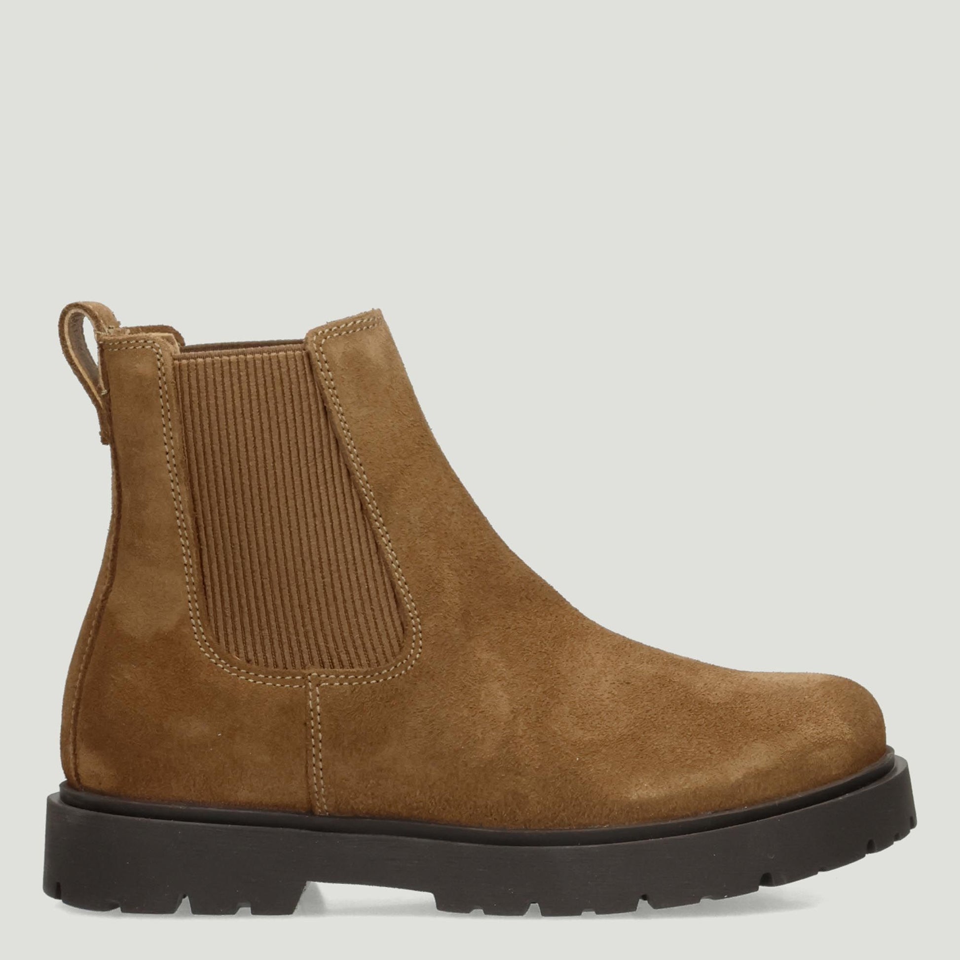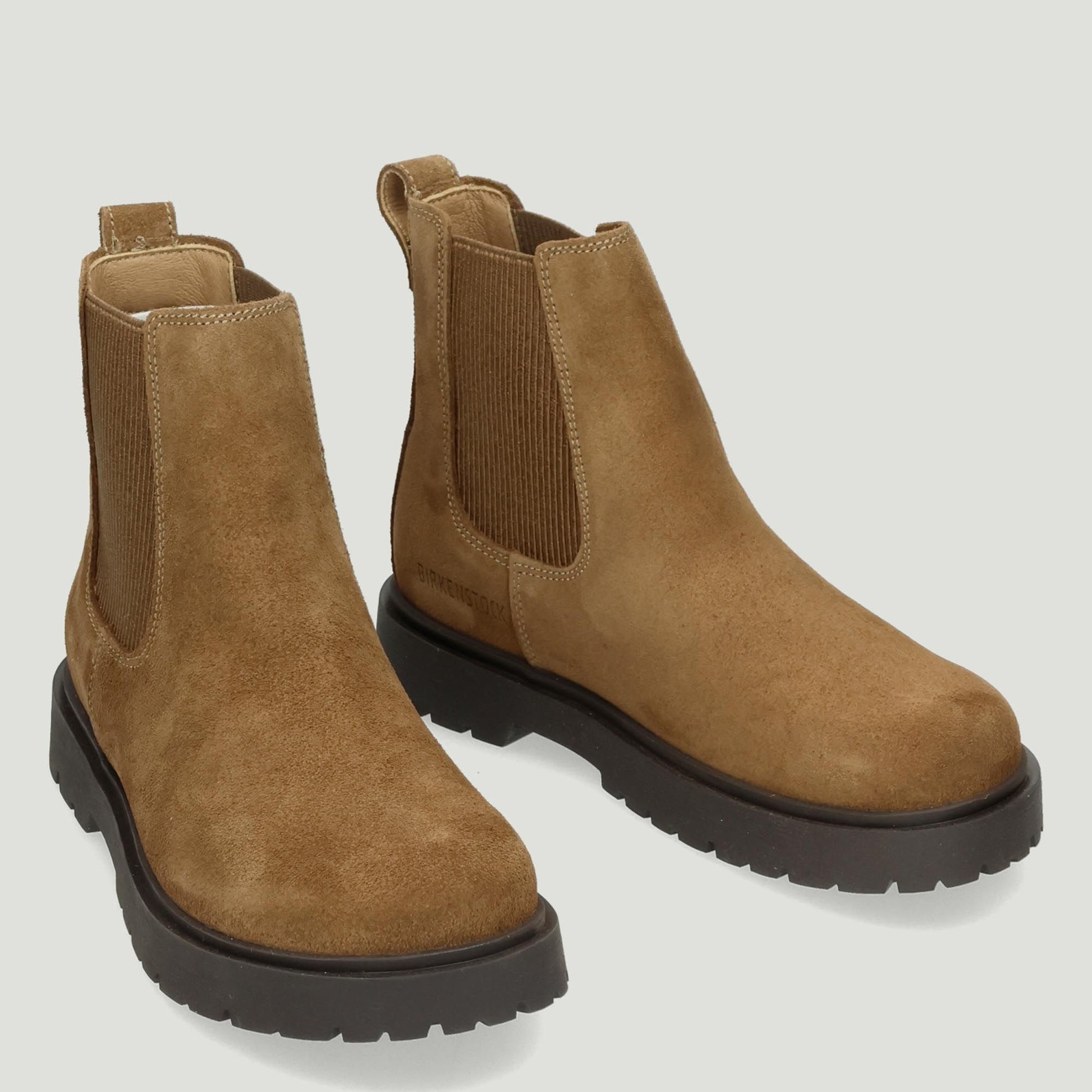 Stiefeletten mit hellbraunem Veloursleder-Obermaterial (dunkelbraun). Passende gerippte elastische Einsätze an den Seiten. Kunstlederfutter mit anatomisch geformtem, herausnehmbarem Fußbett. Schmale Passform. Gummisohle. Birkenstock Damen Herbst/Winter Kollektion.