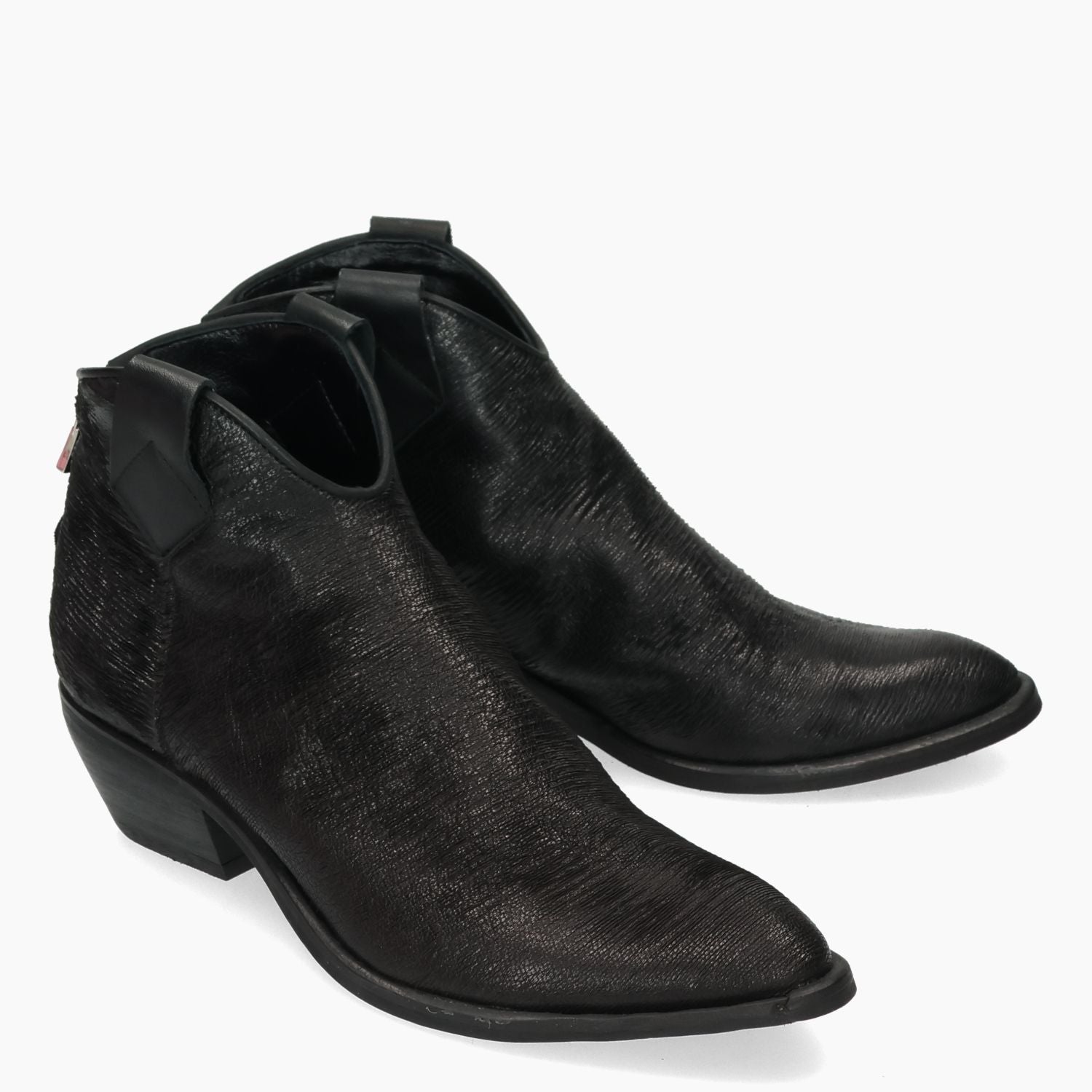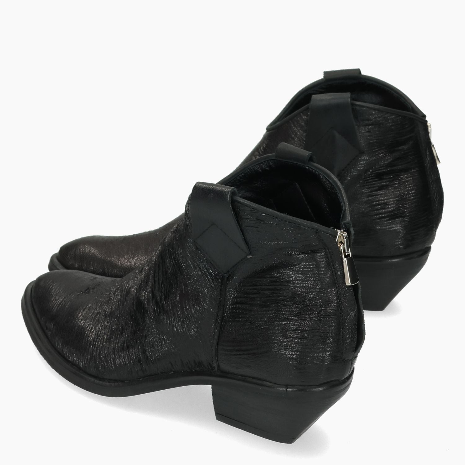 Schwarzer, genarbter Texan-Stiefel aus Leder. Reißverschluss hinten. Schwarzes Lederfutter. Feste Innensohle. Gummisohle mit 4 cm Absatz. Kobra Damenkollektion.