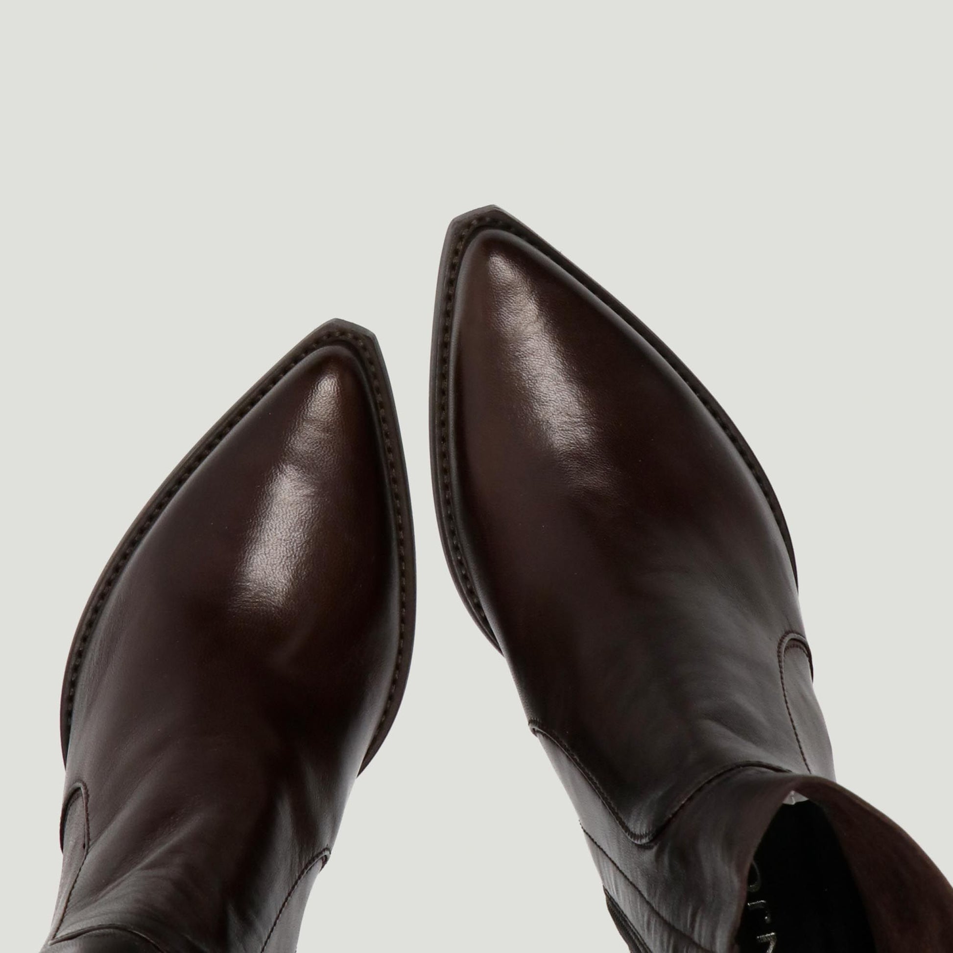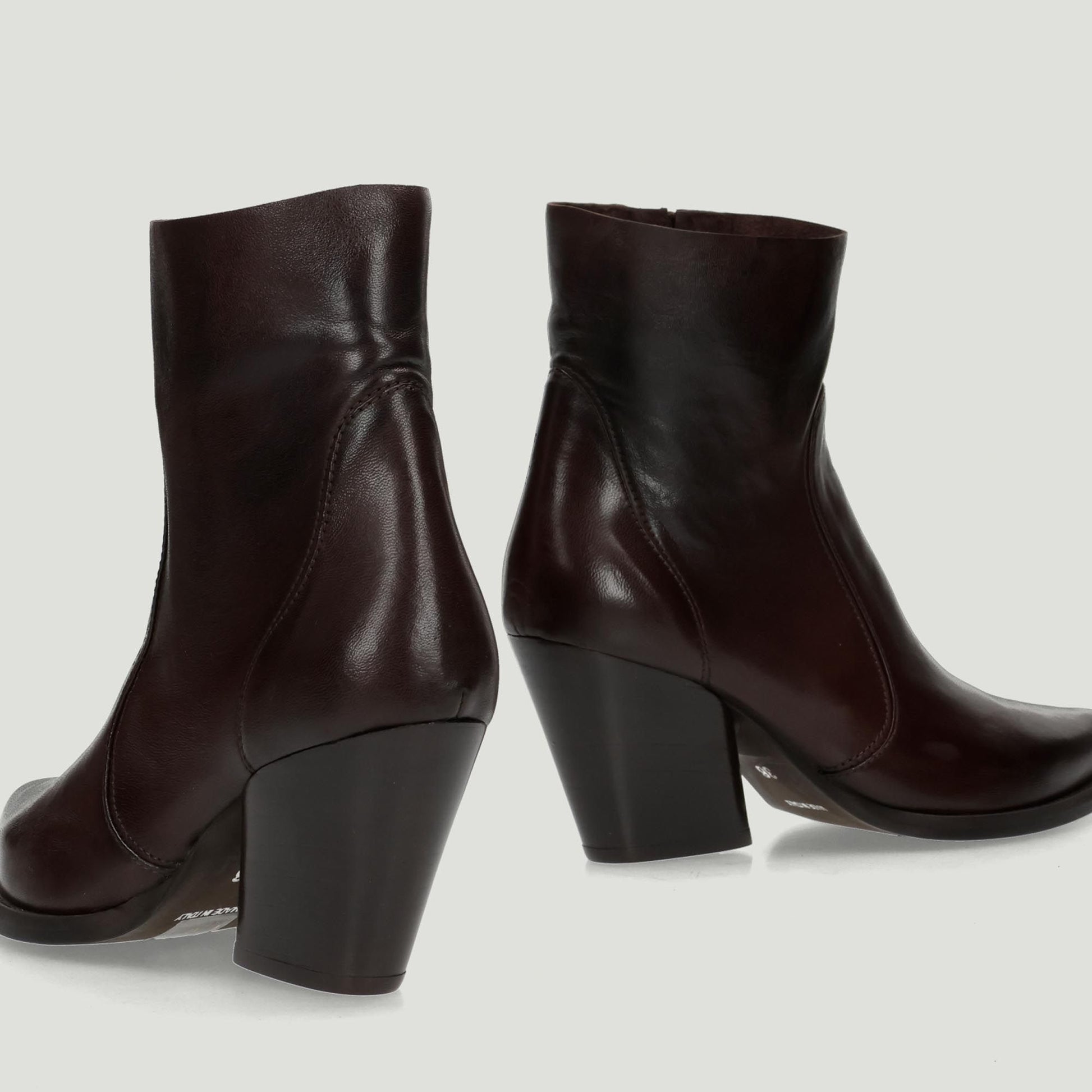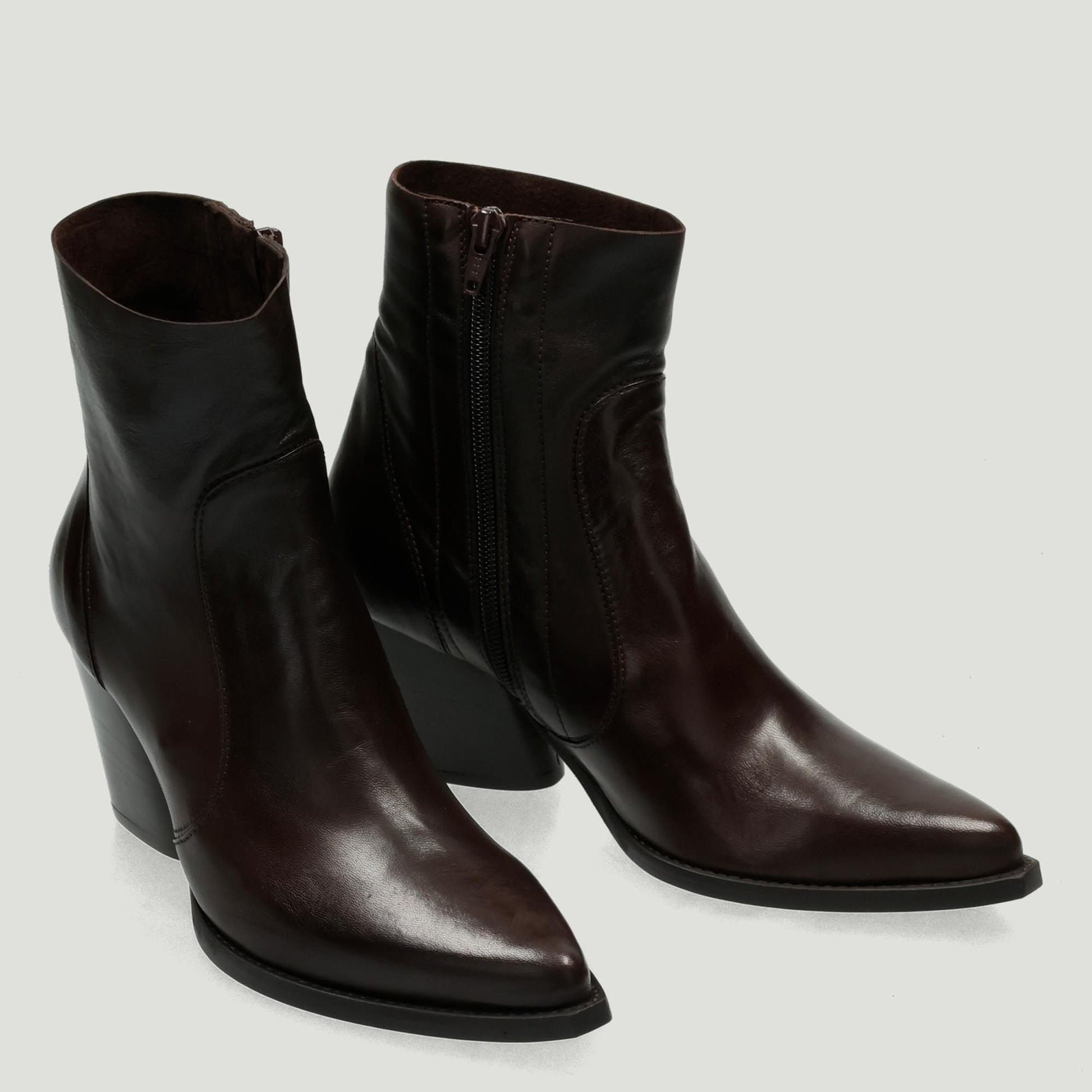 Dunkelbrauner Texan-Stiefelette aus Leder. Seitlicher Reißverschluss. Lederfutter, Schaft ungefüttert. Gummisohle mit 6,5 cm Absatz. Entdecken Sie die Damen-Herbst-/Winterkollektion.