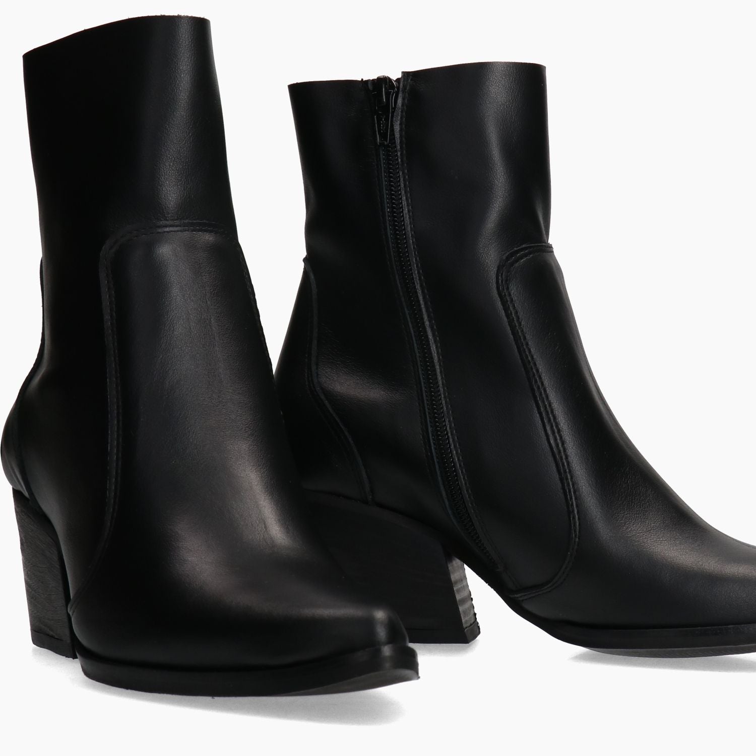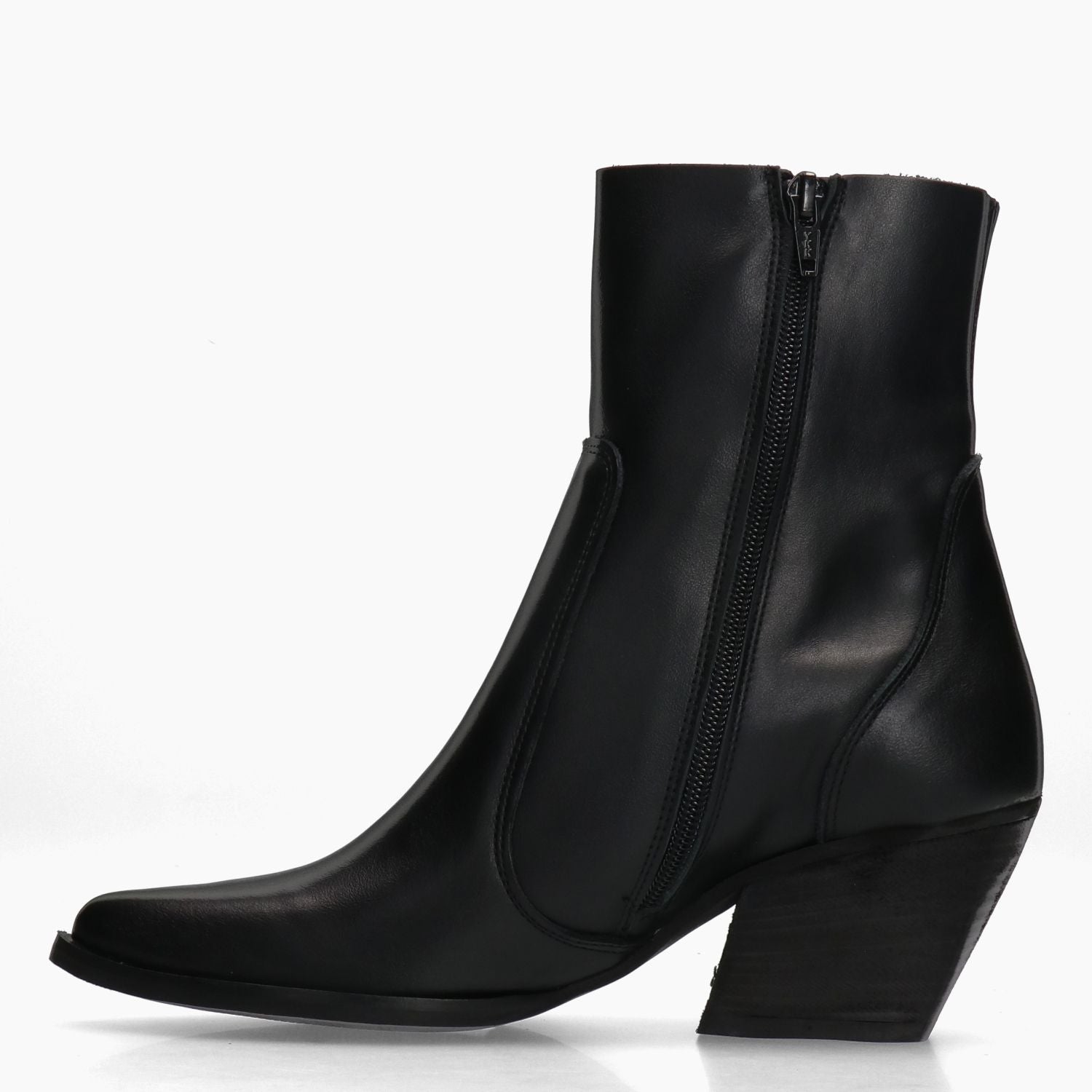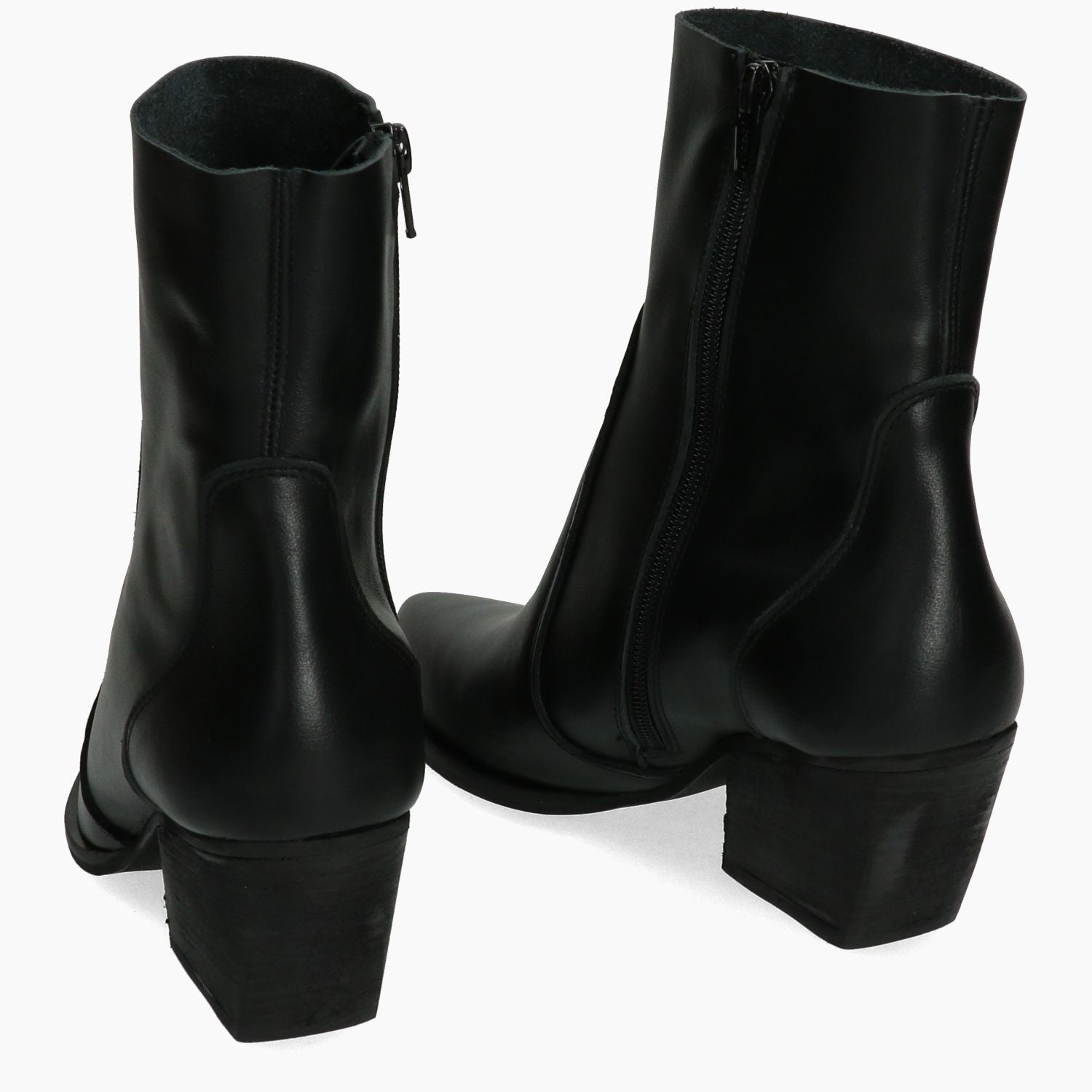 Schwarze Texan-Stiefelette aus Leder. Seitlicher Reißverschluss. Leder- und Textilfutter, Schaft ungefüttert. Gummisohle mit 5 cm Absatz. Damenkollektion AB von Alessandro Borsato.