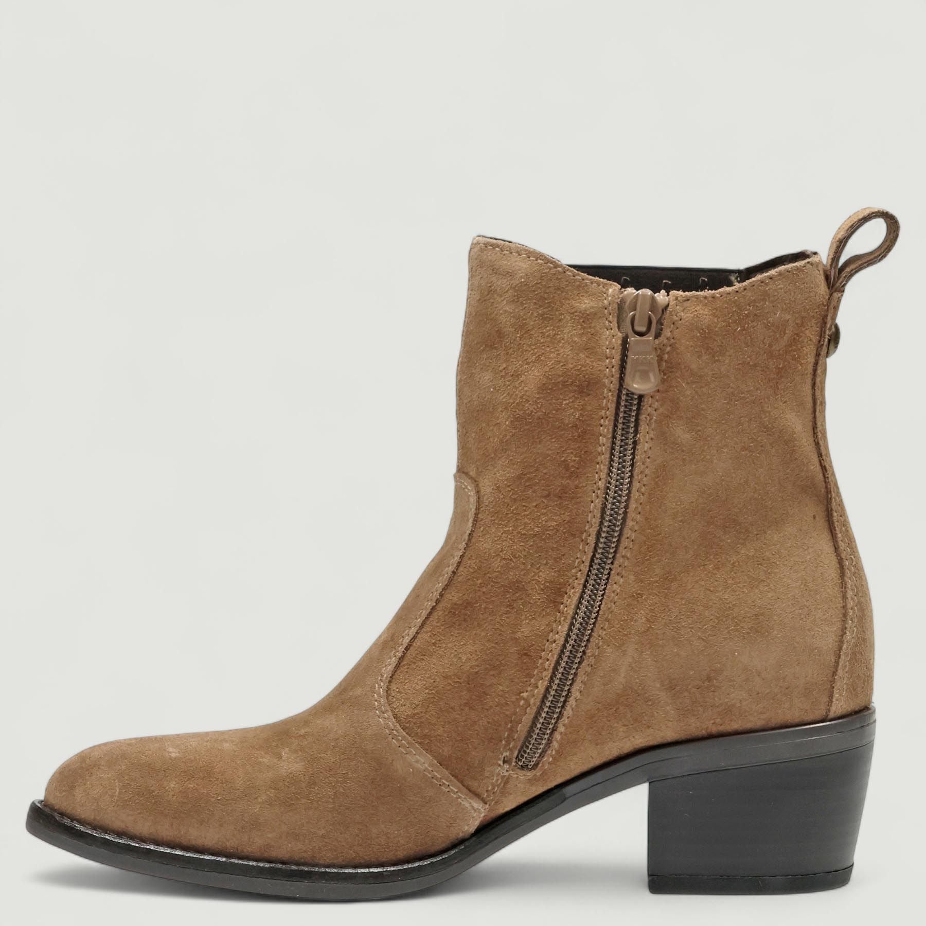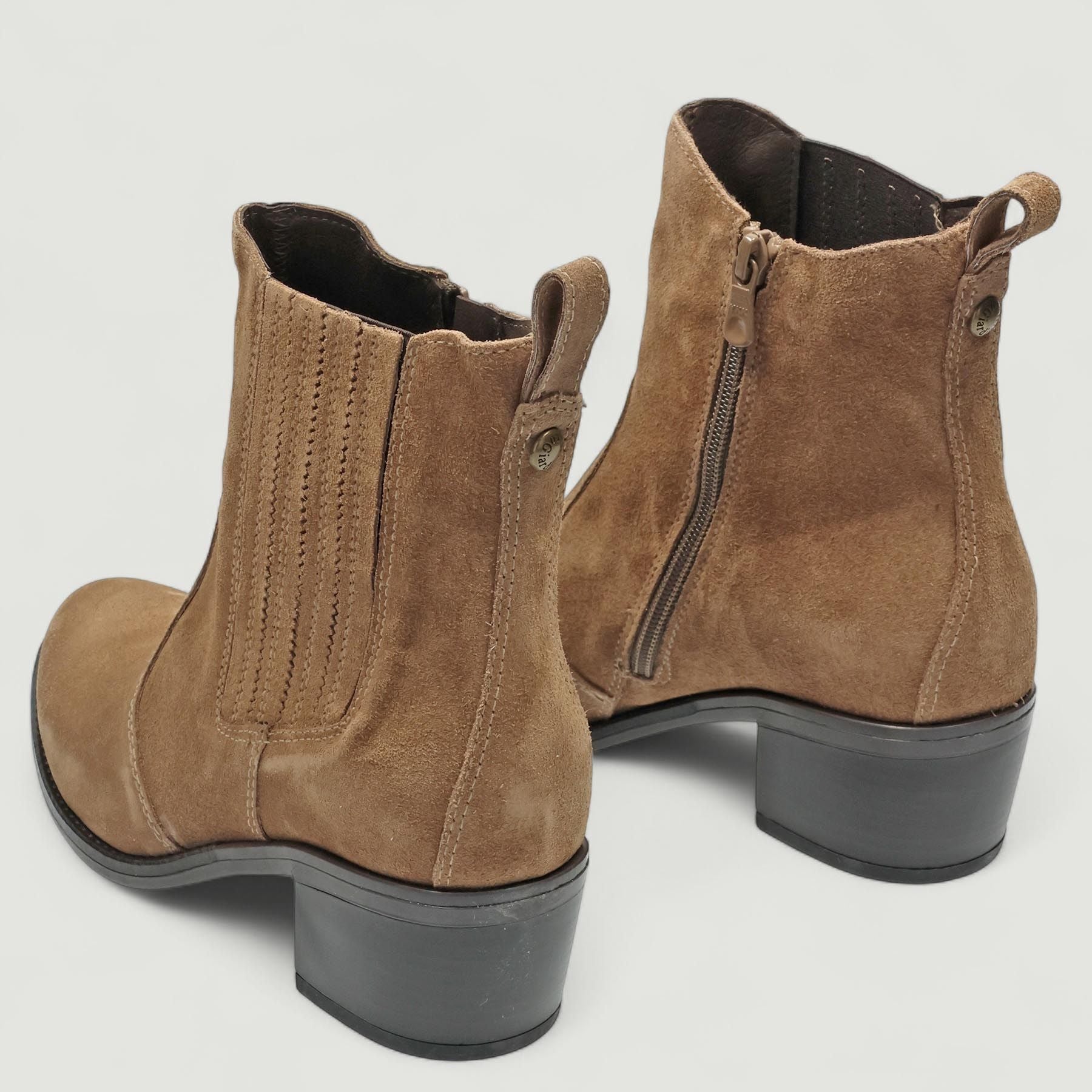 Taupefarbene Wildleder-Cowboystiefel. Elastischer Einsatz an der Seite. Reißverschluss innen. Lederfutter. Gummisohle mit 5 cm Absatz. Nero Giardini Damen-Herbst-/Winterkollektion.