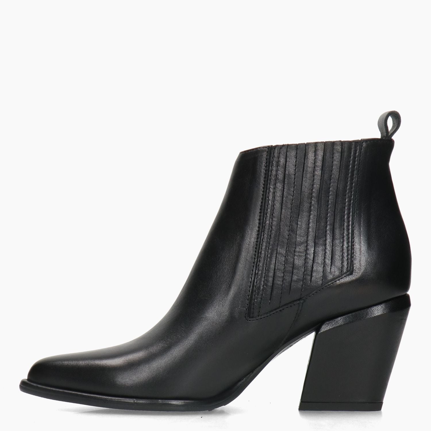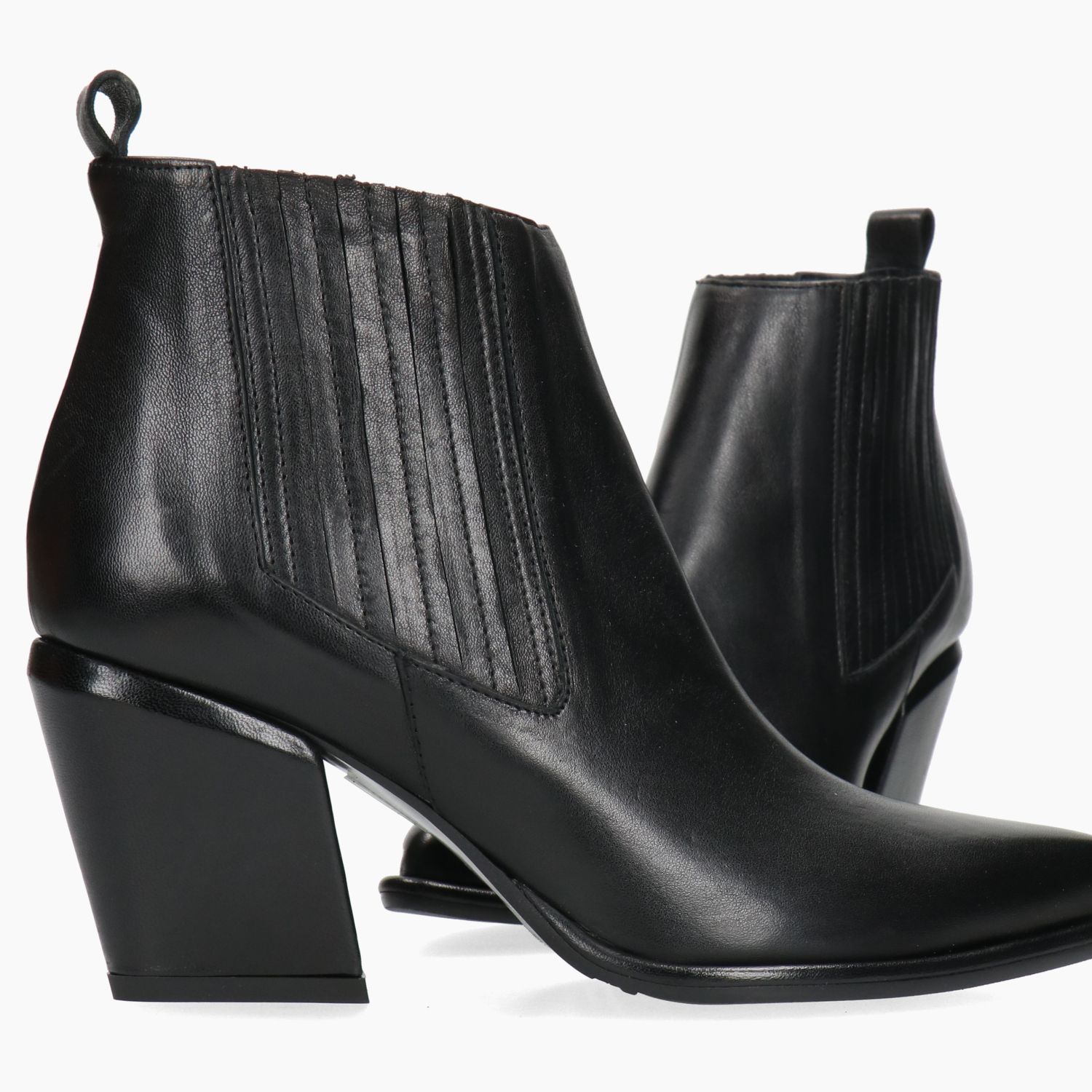 Schwarze Texan-Stiefelette aus Leder mit bezogenen elastischen Seiteneinsätzen. Lederfutter. 7 cm hoher, farblich passender Absatz. Gummisohle. Silvia Rossini Damenkollektion.