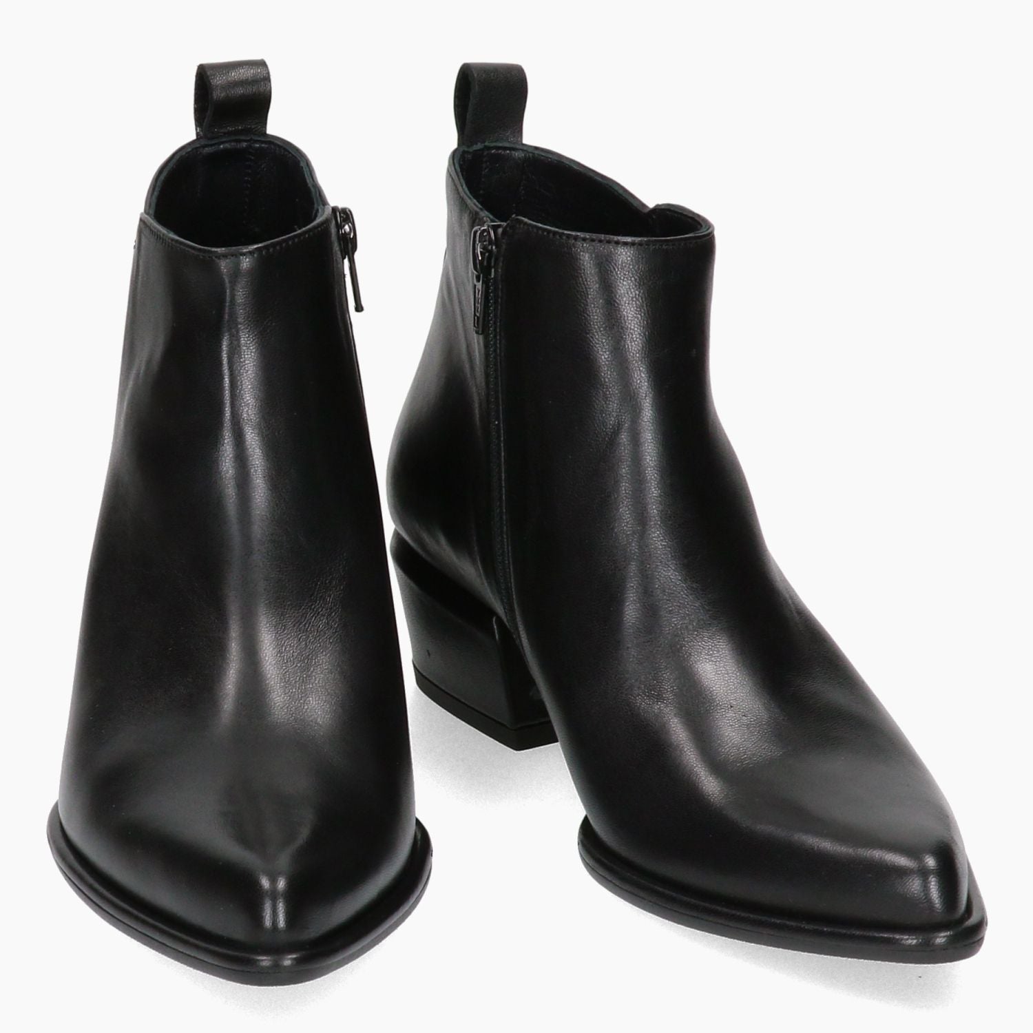 Schwarze Texan-Stiefelette aus Leder. Innenliegender Reißverschluss. Lederfutter. 4 cm hoher, farblich passender, bezogener Absatz. Gummisohle. Silvia Rossini Damenkollektion.