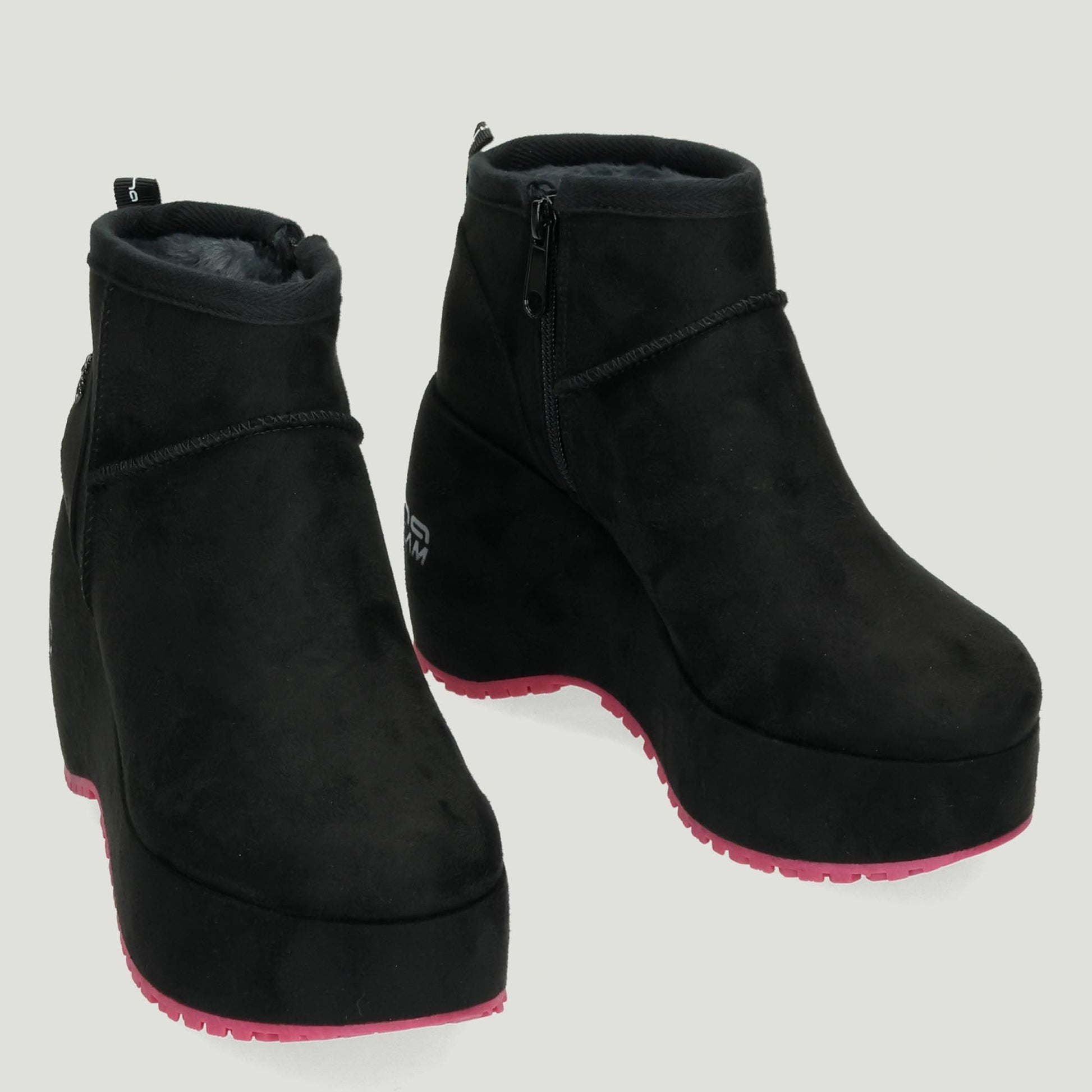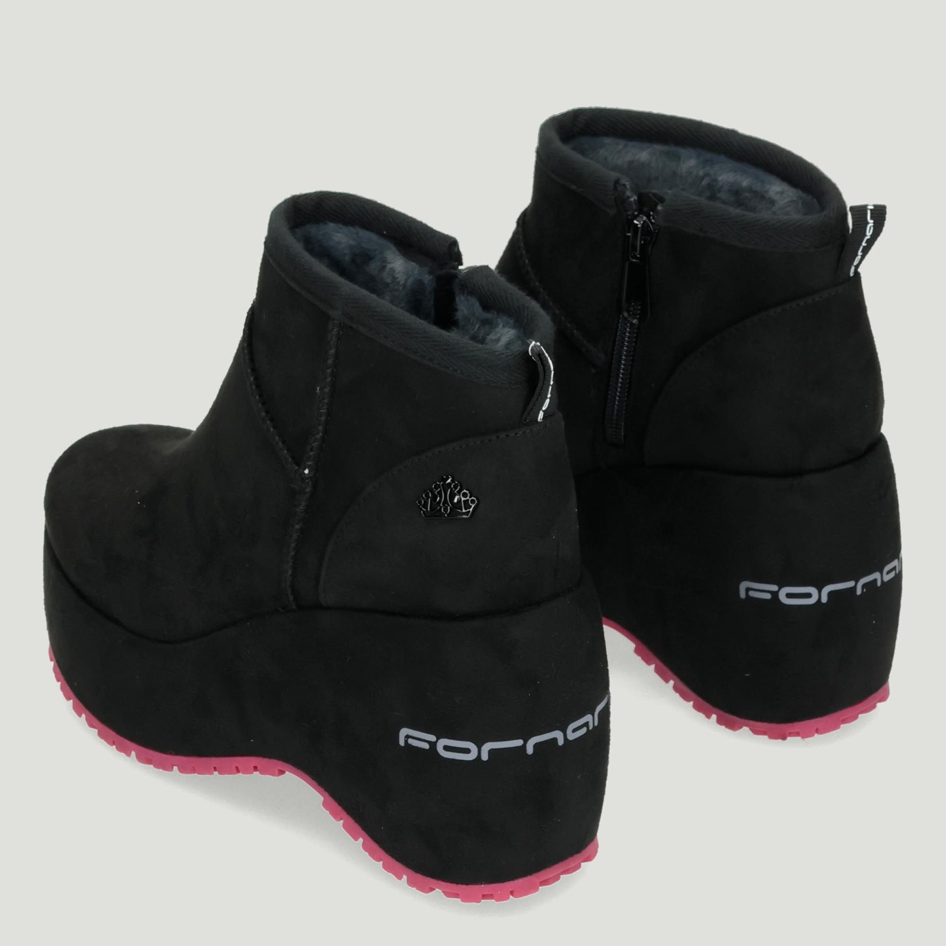 Schwarze Stiefelette aus Veloursimitat. Seitlicher Reißverschluss. Schwarzes Logo an der Ferse. Graues Kunstfellfutter. Gummisohle mit 9 cm hohem Keilabsatz und 4,5 cm hohem Plateau. Fornarina Damenkollektion.