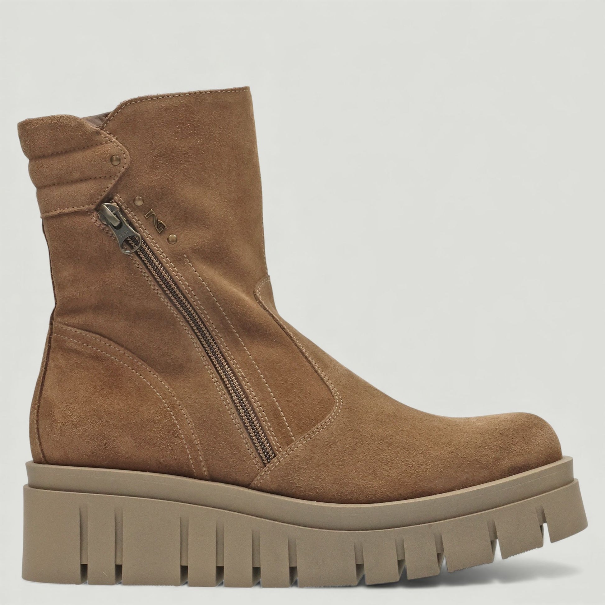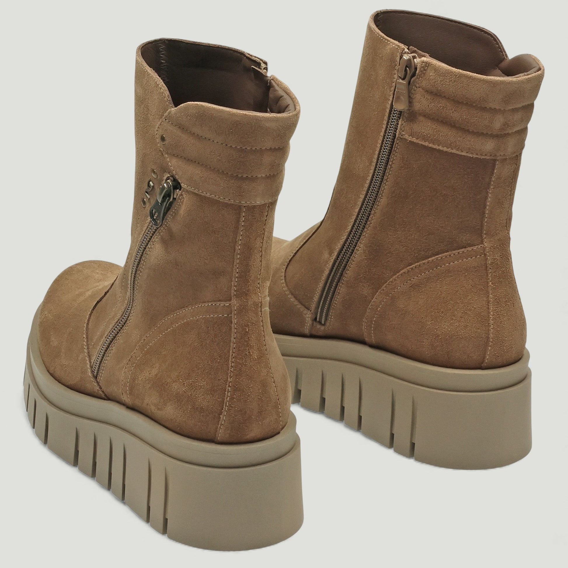 Stiefelette aus taupefarbenem Wildleder. Innenliegender Reißverschluss mit Zierreißverschluss am Schaft. Lederfutter. Gummisohle mit 5 cm hohem Keilabsatz. Aus der Damenkollektion Nero Giardini.