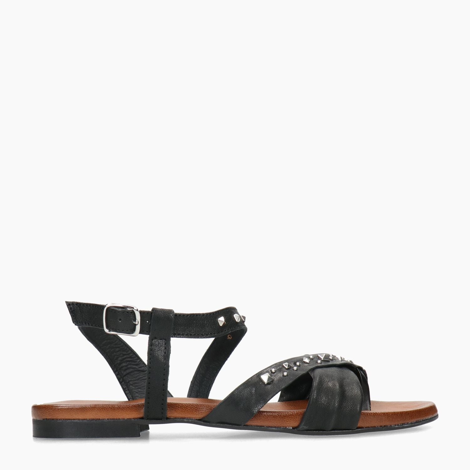 Tre T Flip-Flop-Sandale mit schwarzem Leder-Obermaterial. Silberne Ziernieten. Riemenverschluss. Lederfutter mit gepolsterter Innensohle. Gummisohle mit 1,5 cm Absatz. Tre T Damen-Frühjahr/Sommer-Kollektion.