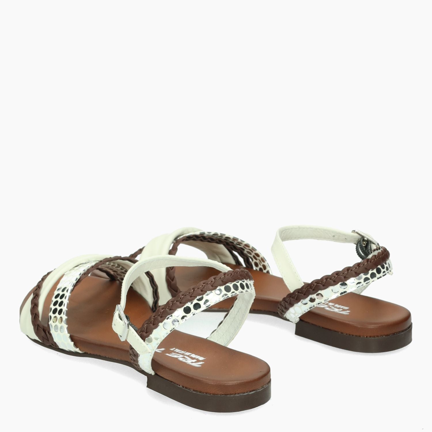 Tre T Sandale mit milchfarbenem Leder-Obermaterial und dunkelbraunen Ziernähten. Riemenverschluss. Lederfutter mit gepolsterter Innensohle. Gummisohle mit 1,5 cm Absatz. Tre T Damen-Frühjahr/Sommer-Kollektion.