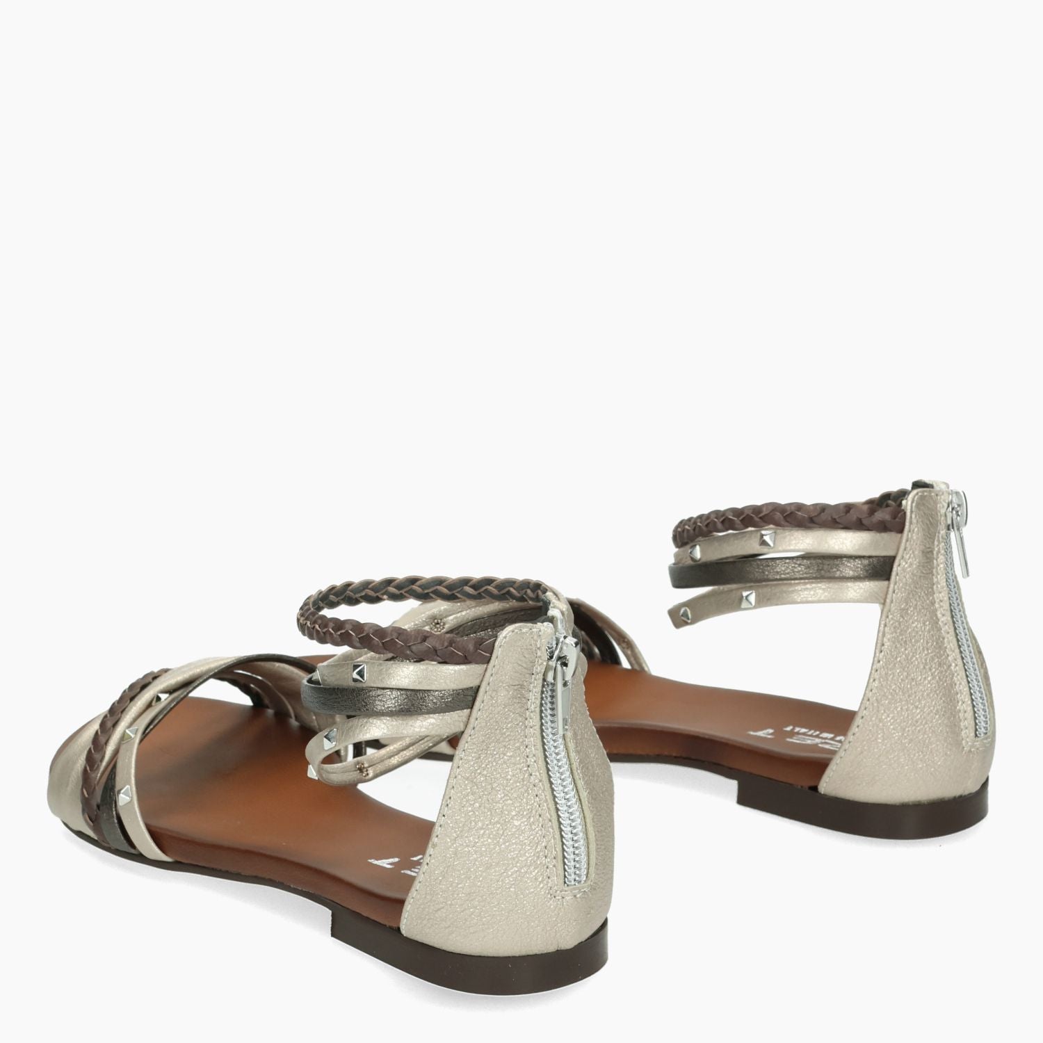 Tre T Sandale mit beigefarbenem, perlmuttfarbenem Leder-Obermaterial und dunkelbraunen Ziernähten. Reißverschluss hinten. Lederfutter mit gepolsterter Innensohle. Gummisohle mit 1,5 cm Absatz. Tre T Damen-Frühjahr/Sommer-Kollektion.