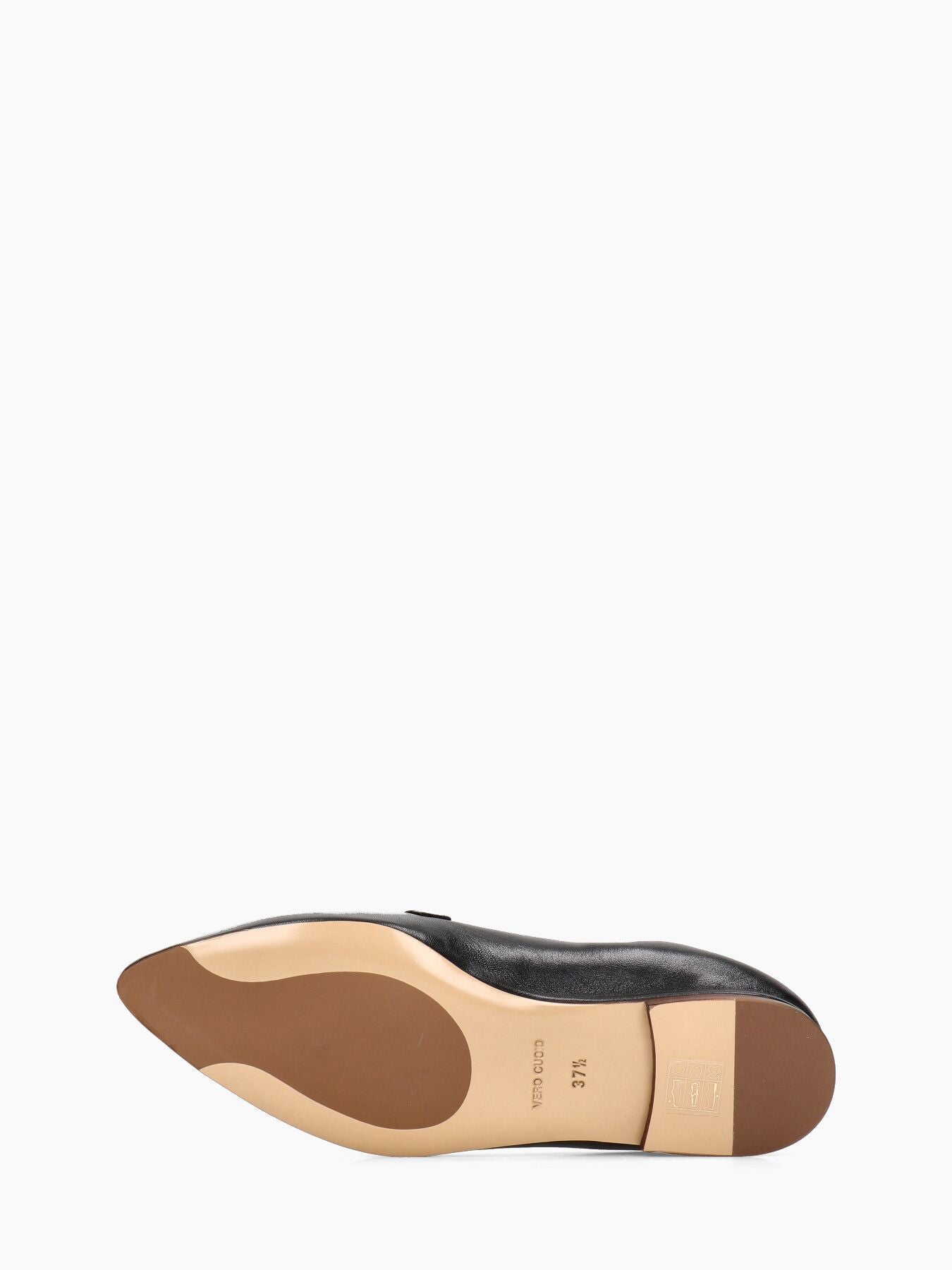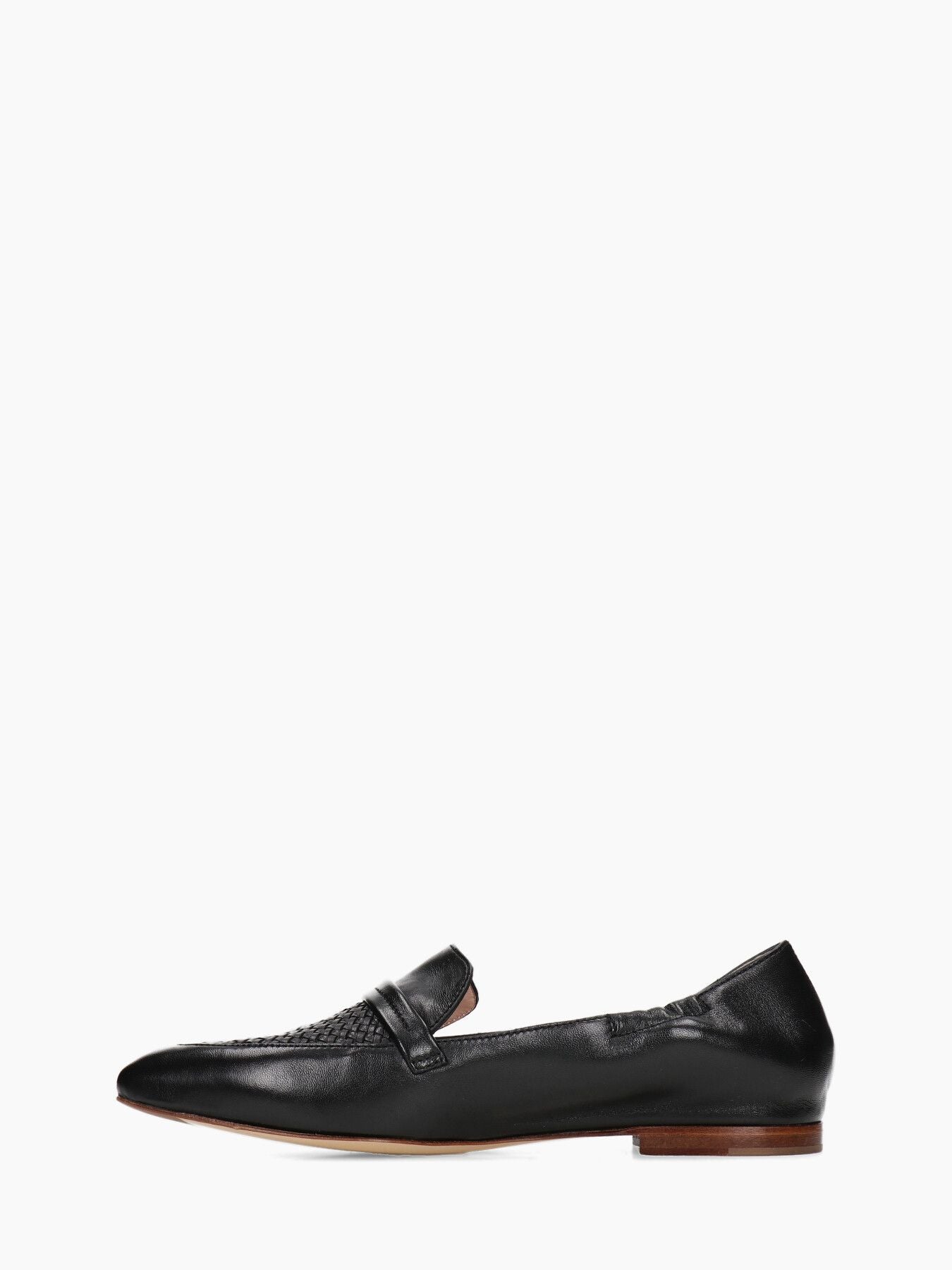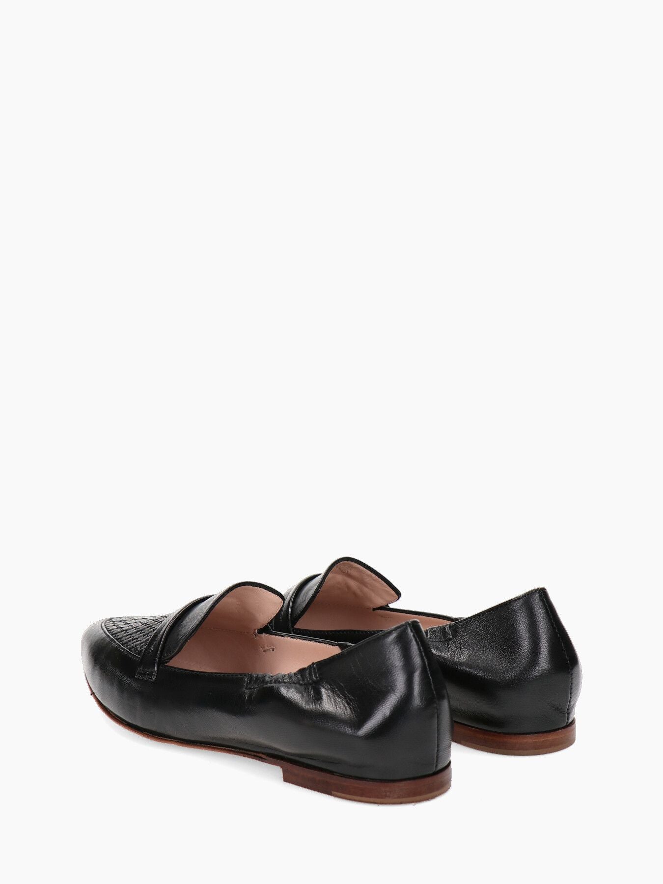 Schwarze Lederballerinas mit gewebtem Obermaterial, taschenartiger Konstruktion, 15 cm hohem Innenkeilabsatz und Ledersohle.