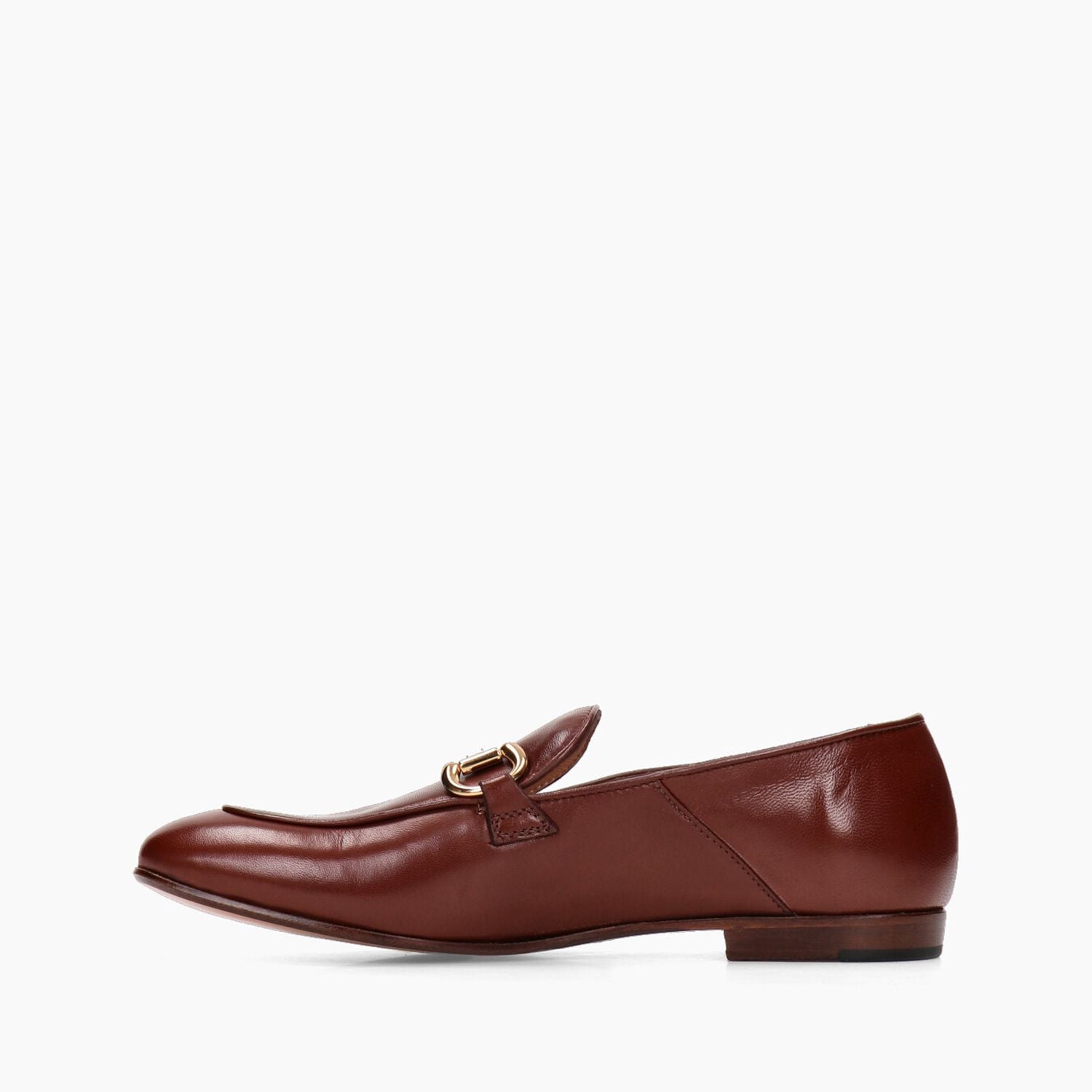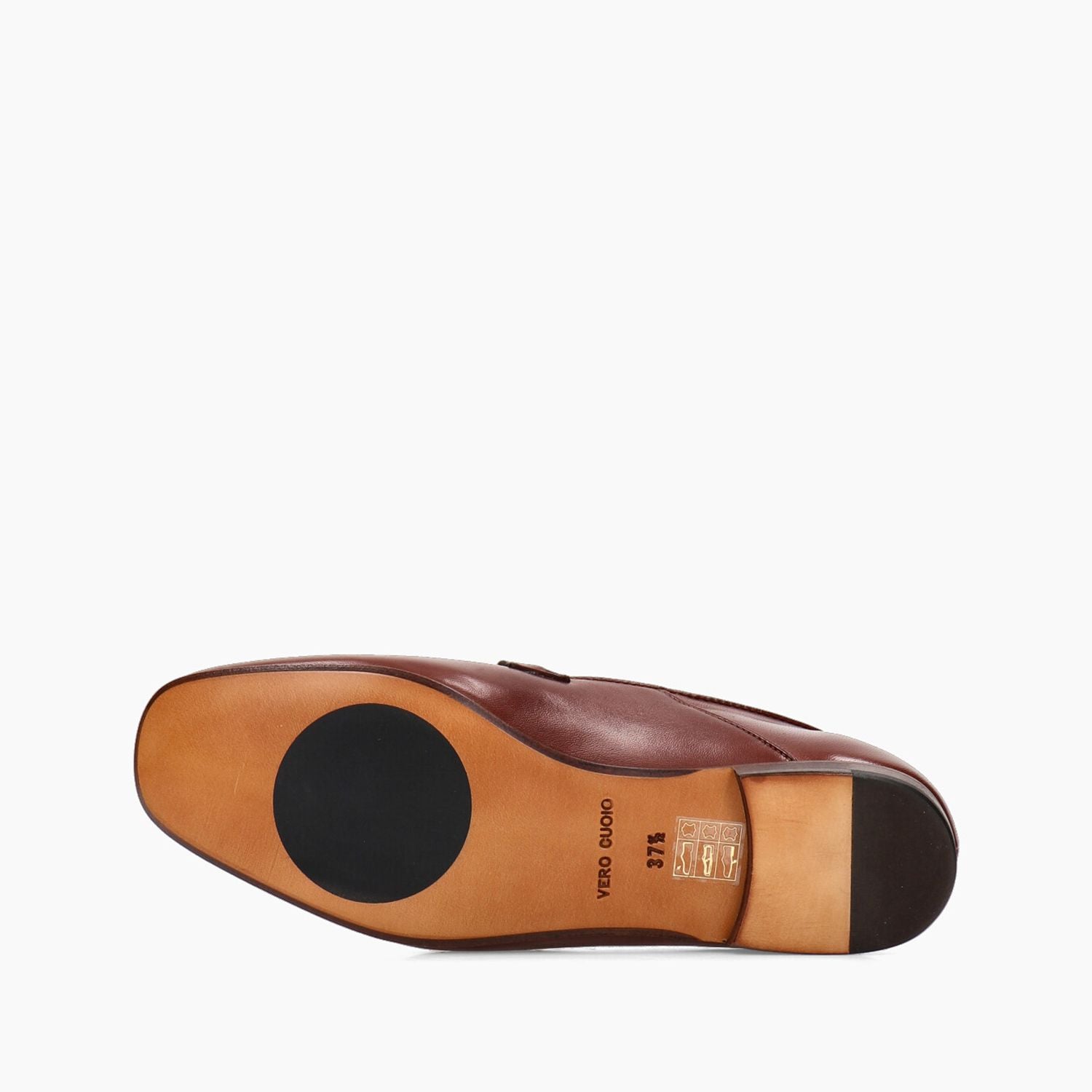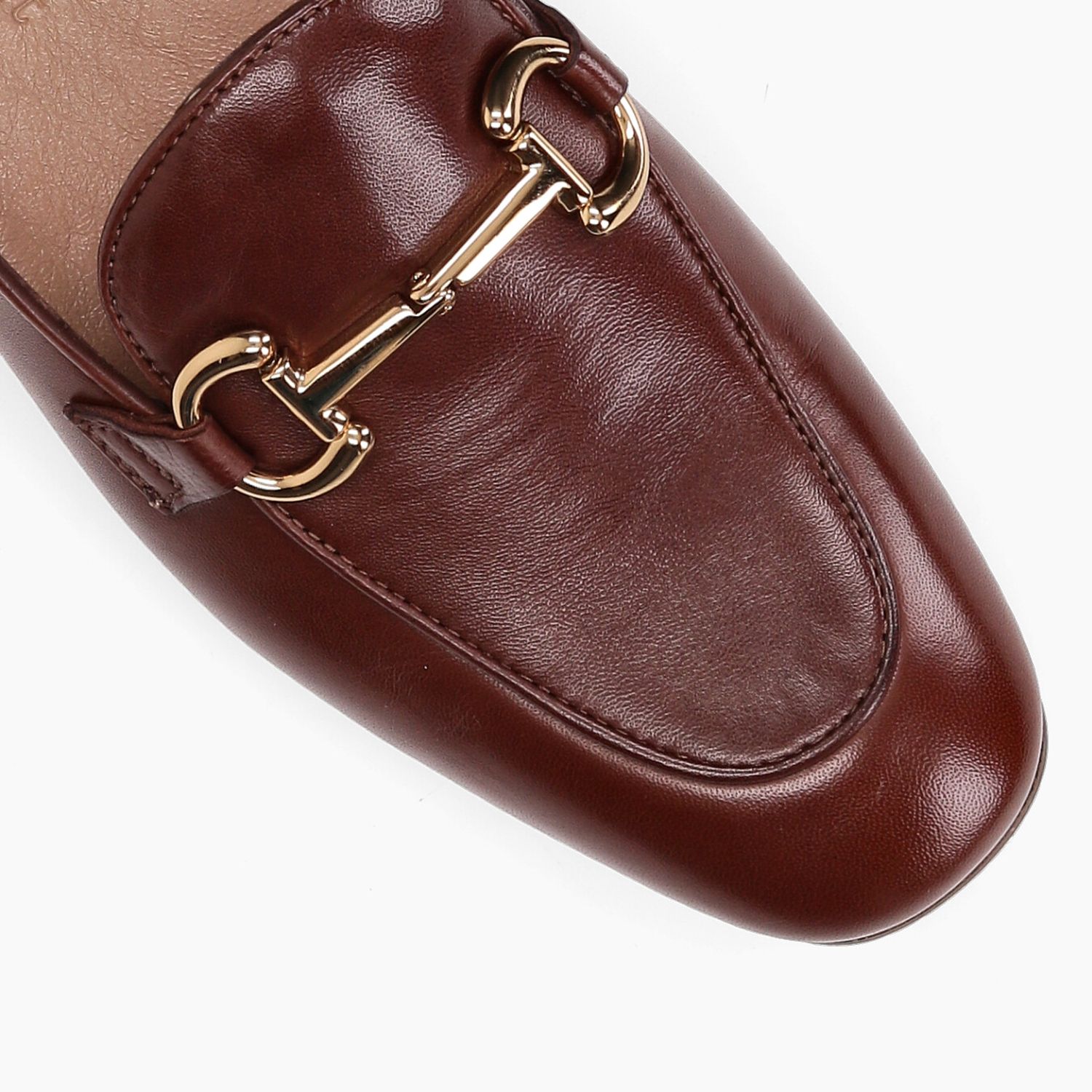 Cognacfarbene Lederslipper mit goldfarbenem Metallclip, hochwertiger Verarbeitung, 15 cm Absatz, Ledersohle.