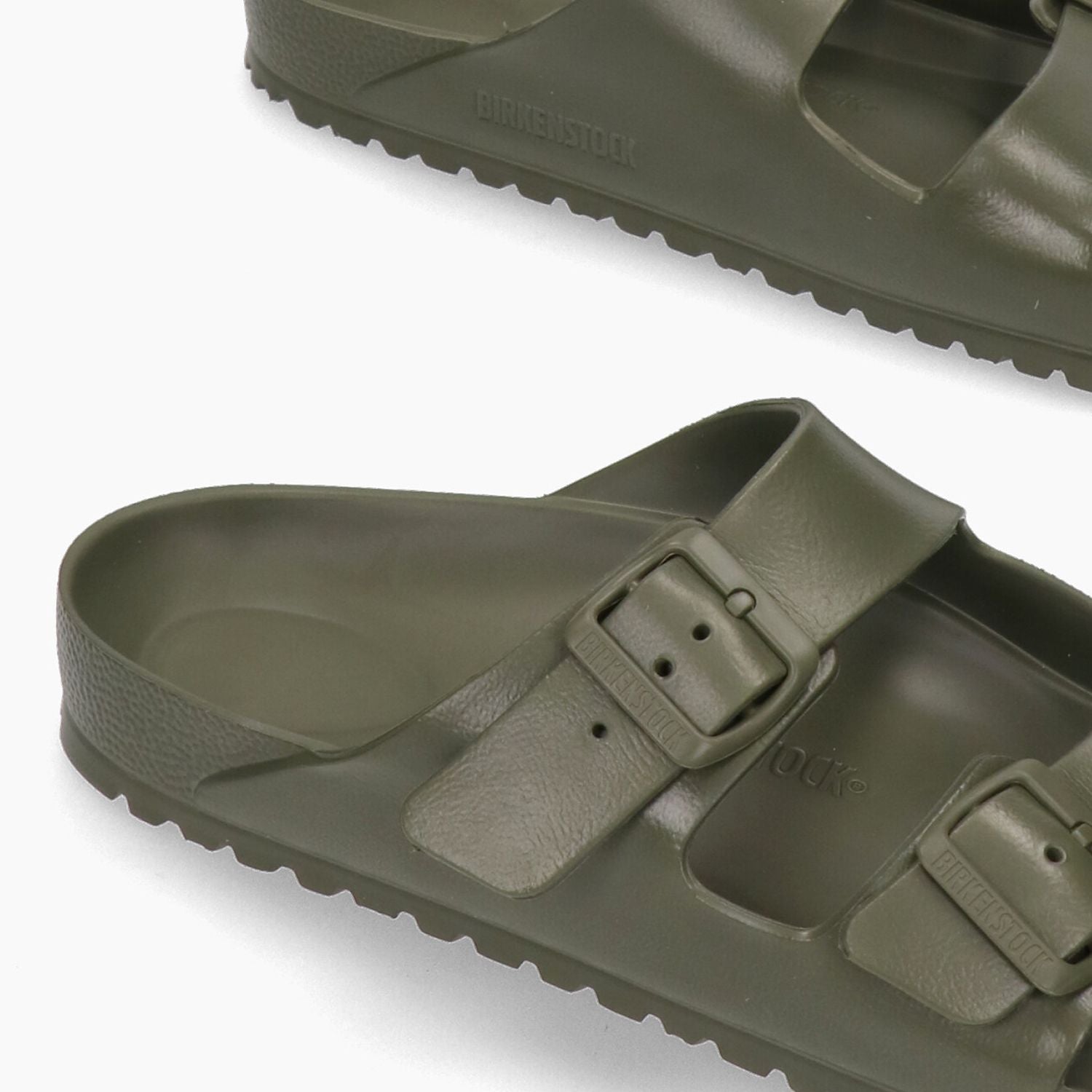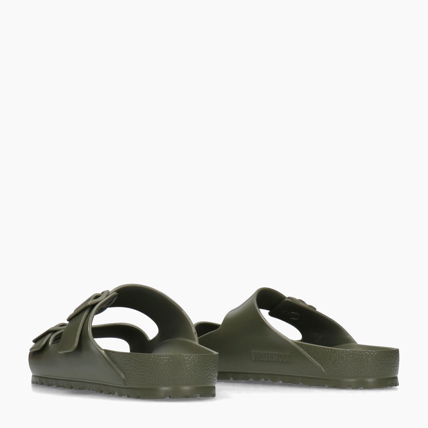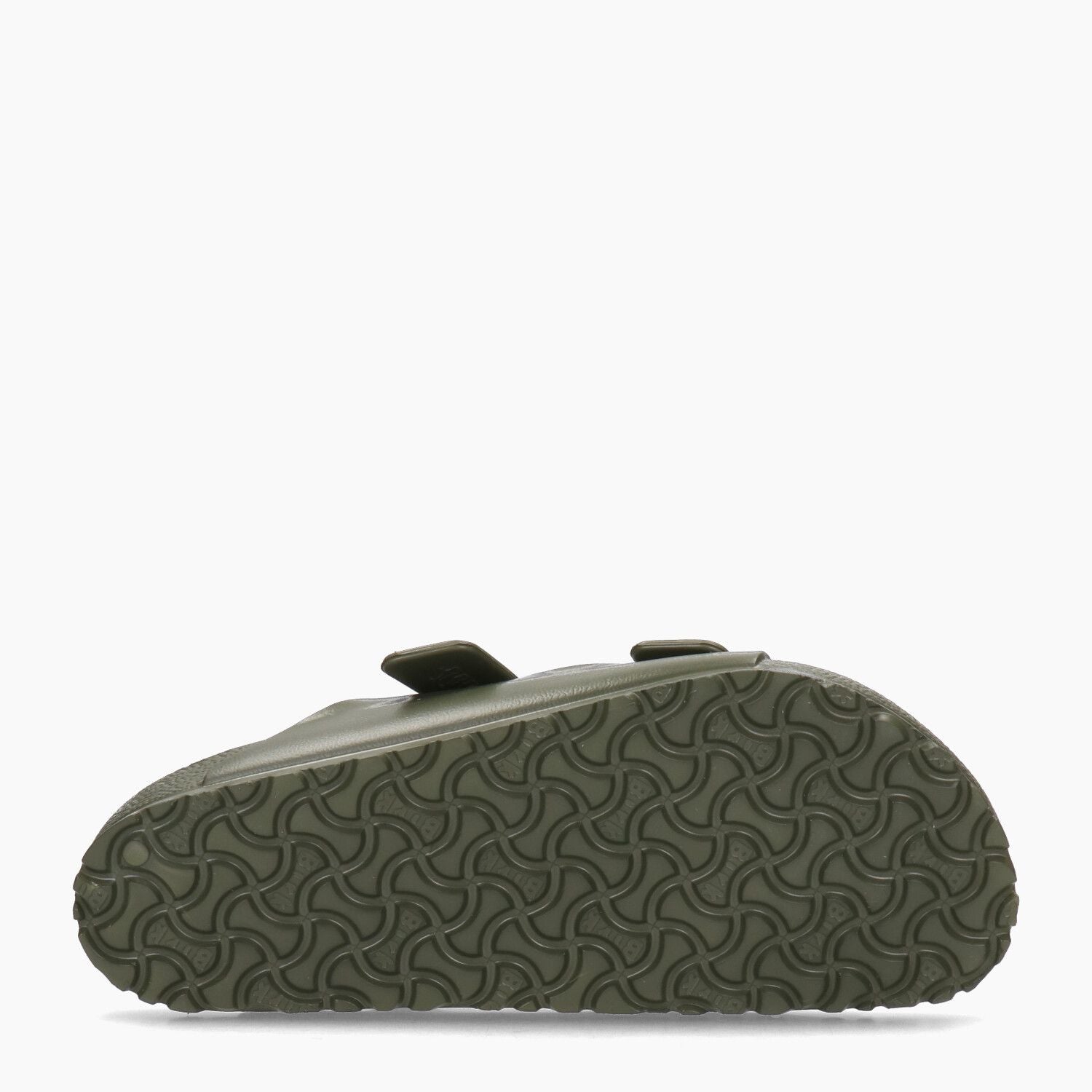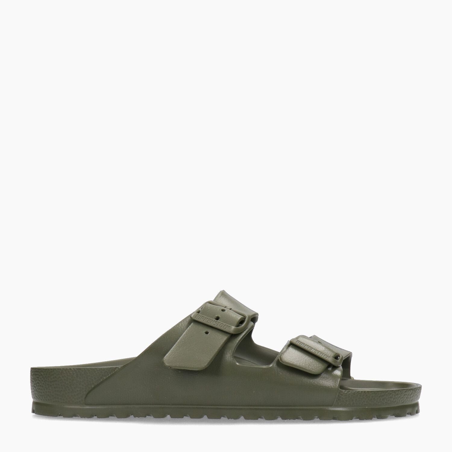 Birkenstock Arizona Eva Hausschuh mit Obermaterial aus Kunststoff in Khaki. Runde Zehenpartie. Doppelter Schnallenverschluss. Schmale Passform. Gummifutter. Gummisohle. 2 cm Sohlenhöhe. Birkenstock Herrenkollektion.