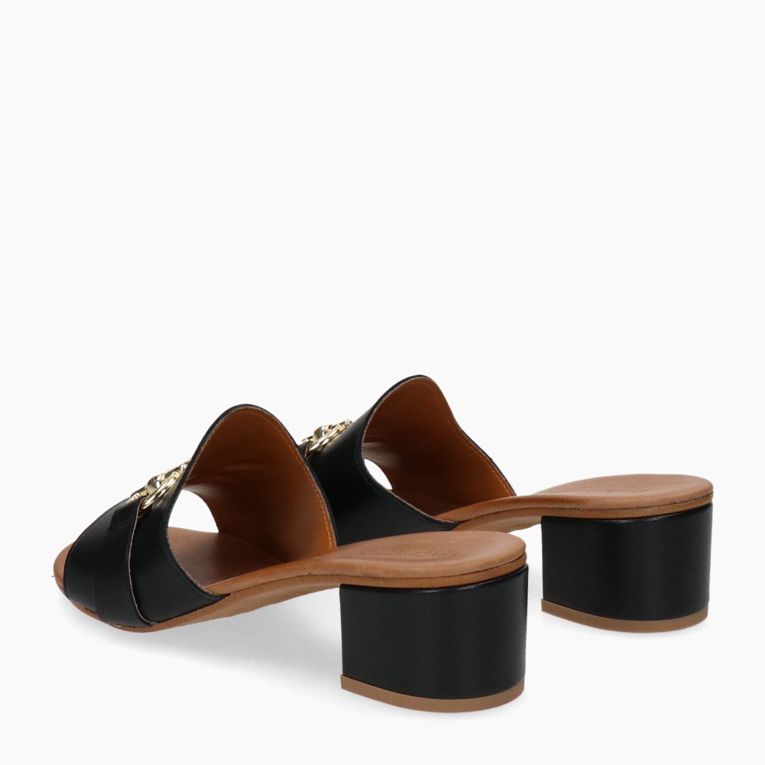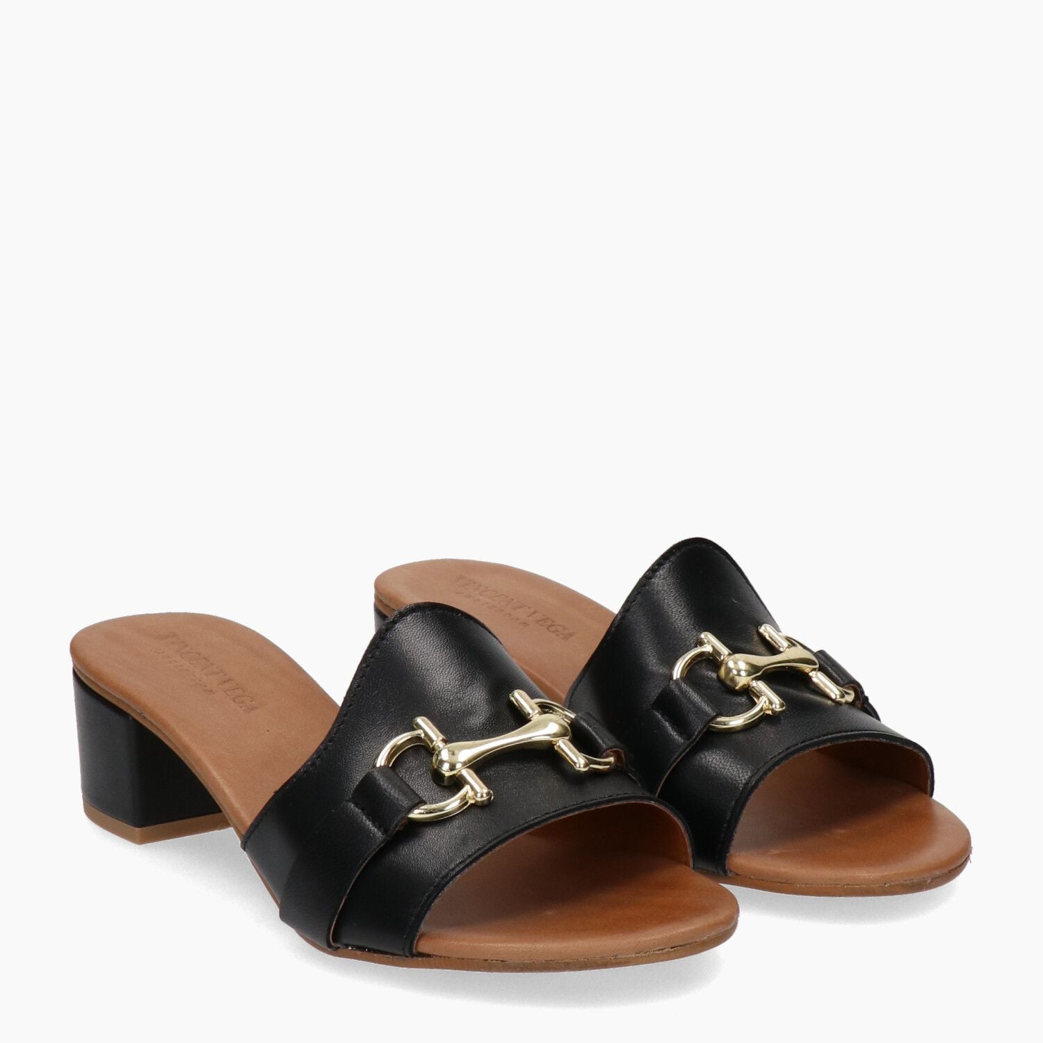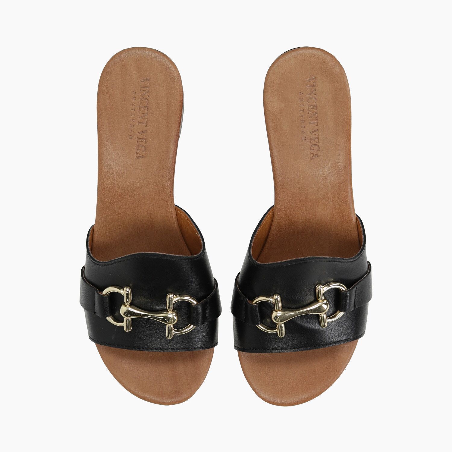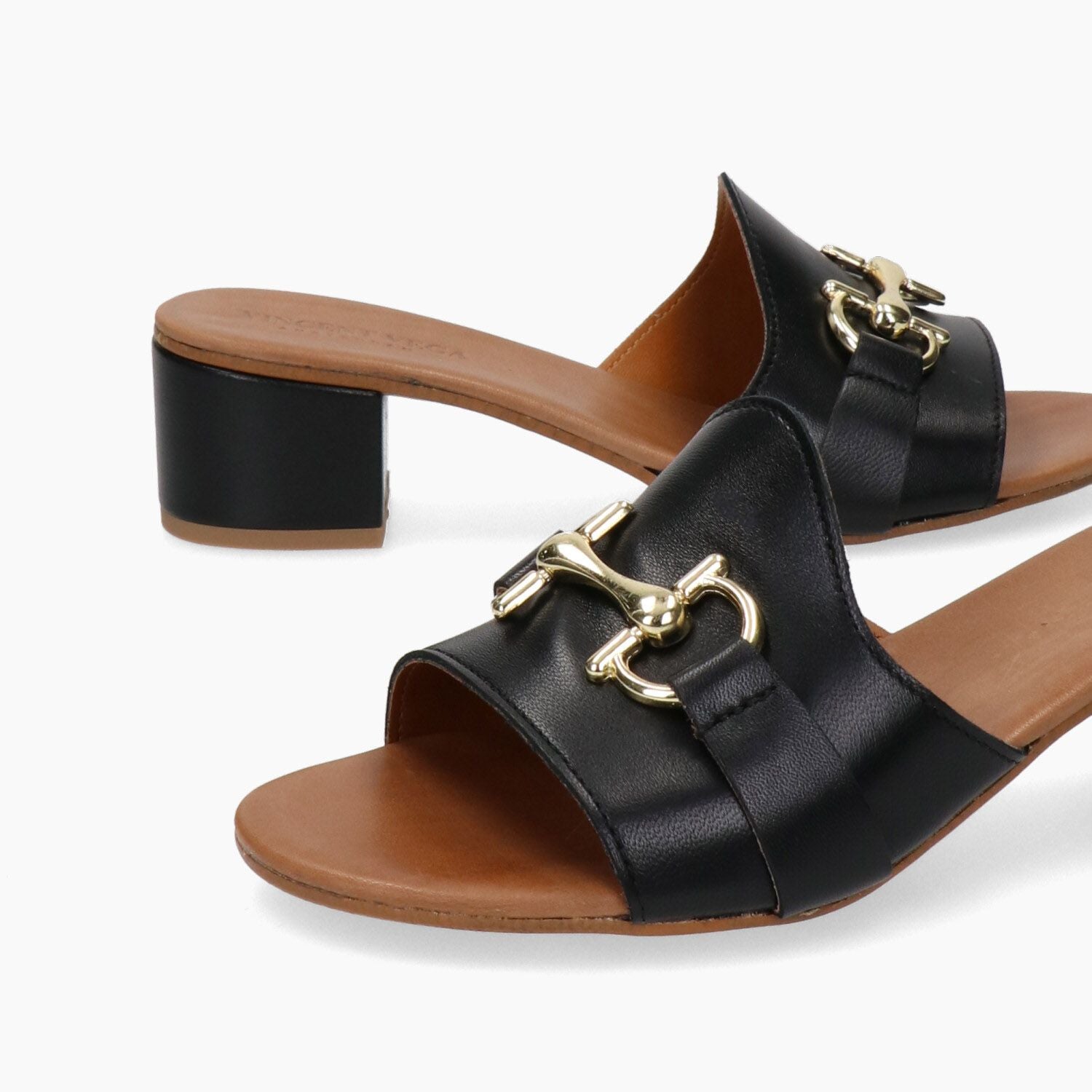 Schwarzer Lederpantoffel mit goldenem Clip und Gummisohle.