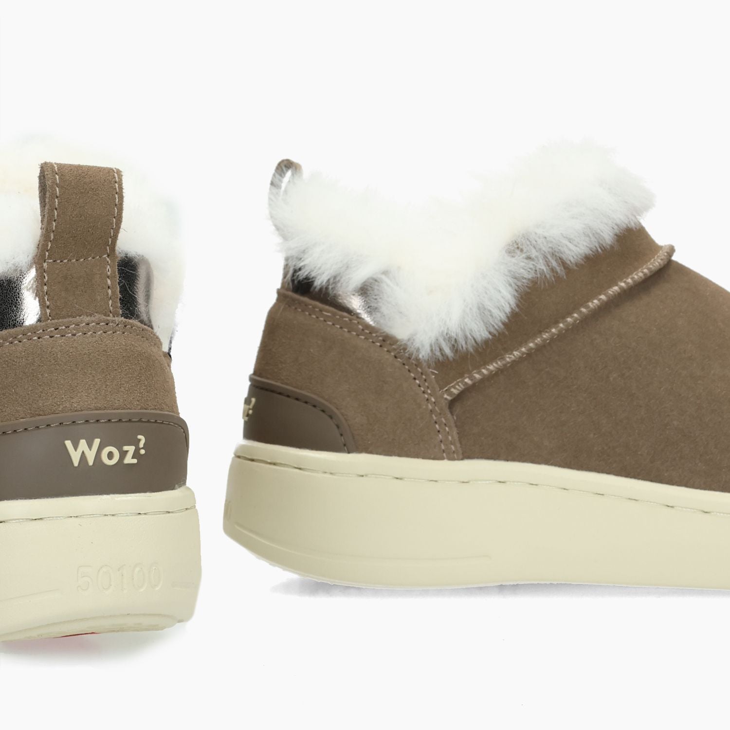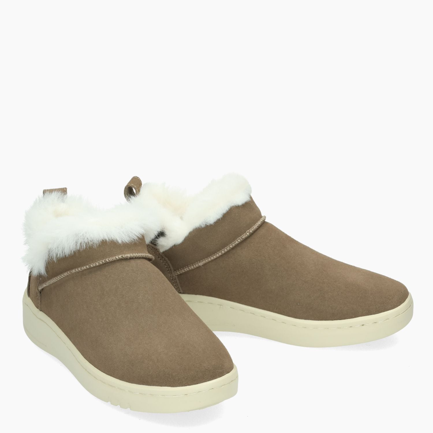 Beigefarbener Wildleder-Slipper mit mittelhohem Schaft und weißem Kunstfellfutter. Herausnehmbare Innensohle. 3,5 cm hohe Gummisohle. Woz? Damen-Herbst-/Winterkollektion.