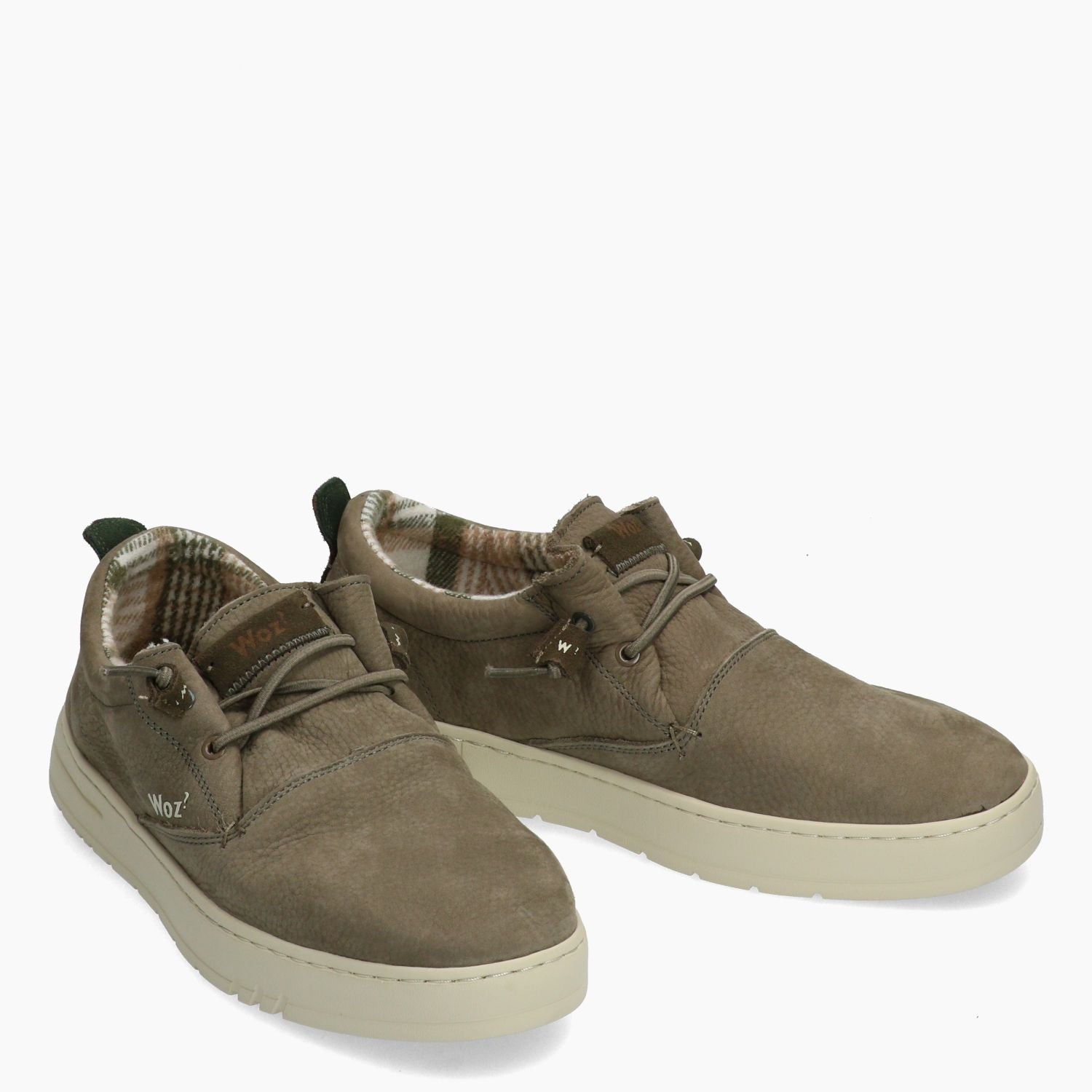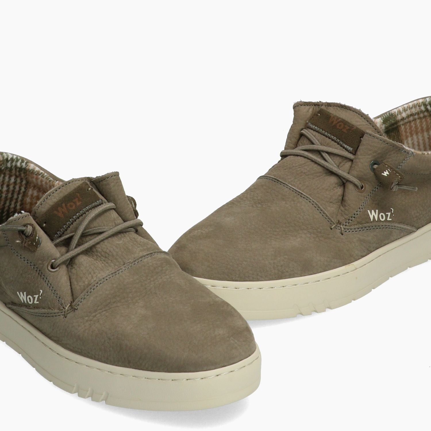 Taubengrauer Nubuk-Schnürschuh mit gemustertem Futter. Braune Seitenriemen. Elastische Schnürsenkel für bequemes Hineinschlüpfen. Herausnehmbare Innensohle. Gummisohle. Woz? Herren Herbst/Winter Kollektion.