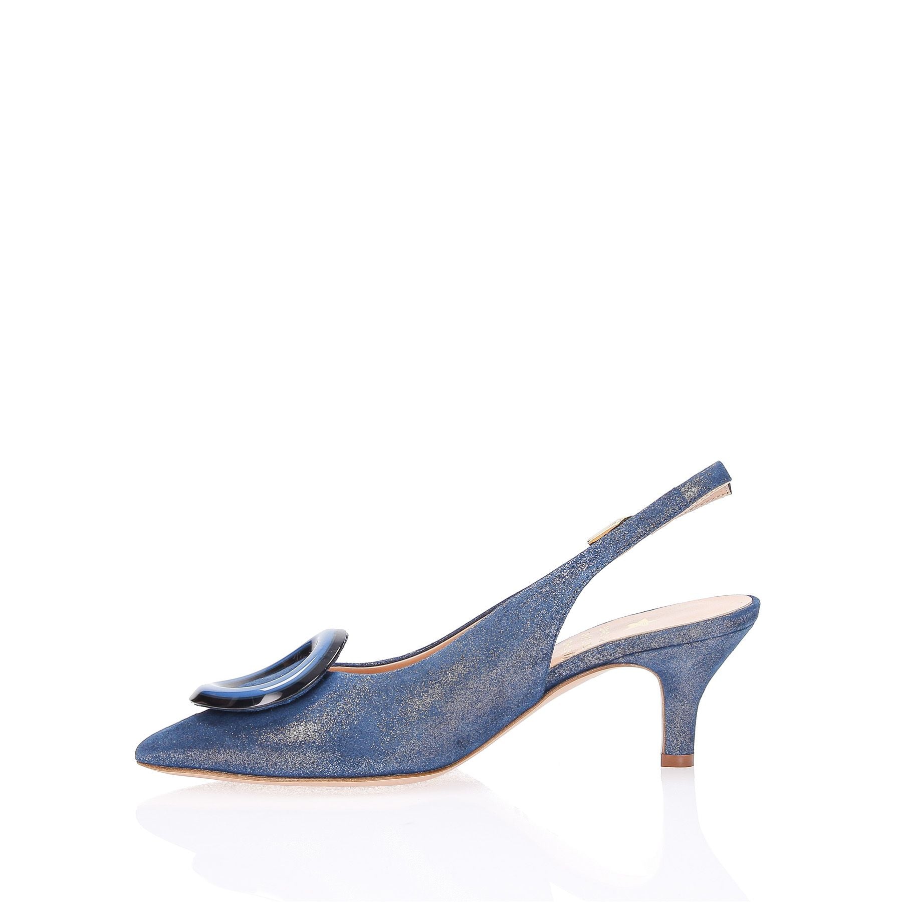 Chanel-Pumps aus blau-gold laminiertem Leder mit rundem Accessoire, 50-mm-Absatz, Ledersohle.