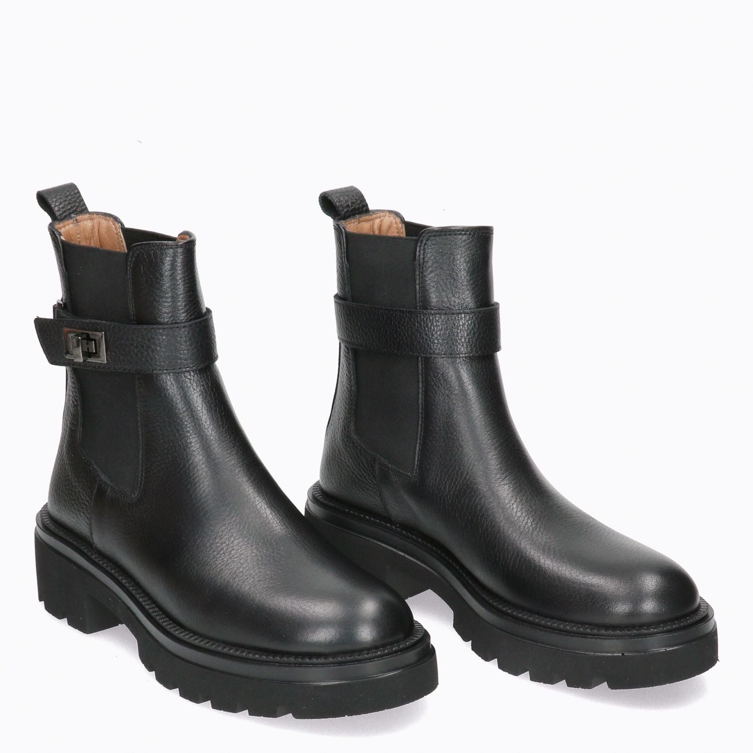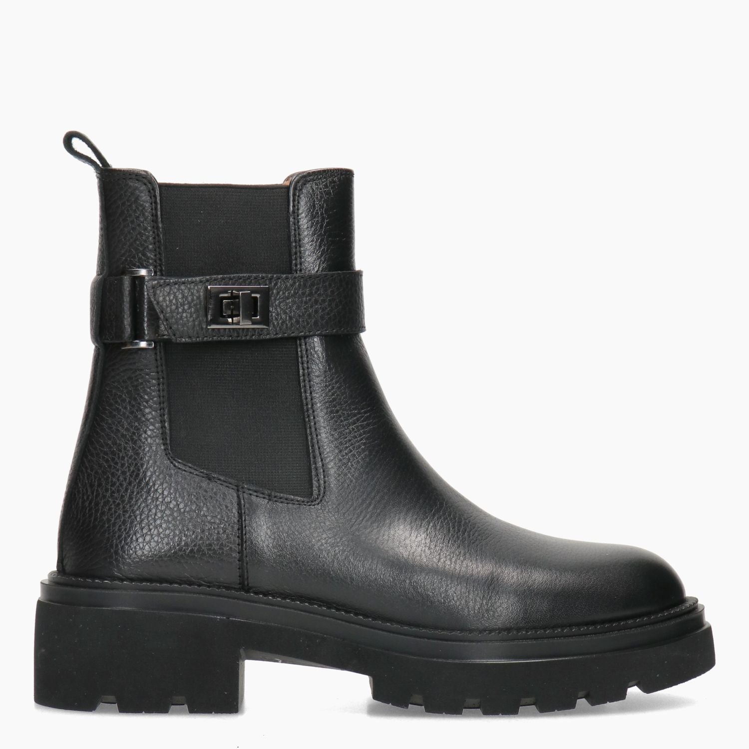 Black leather ankle boot with elastic sides. Side-fastening strap. Leather lining with non-removable insole. Rubber tread sole with 4 cm heel. Albano women's Fall/Winter collection.