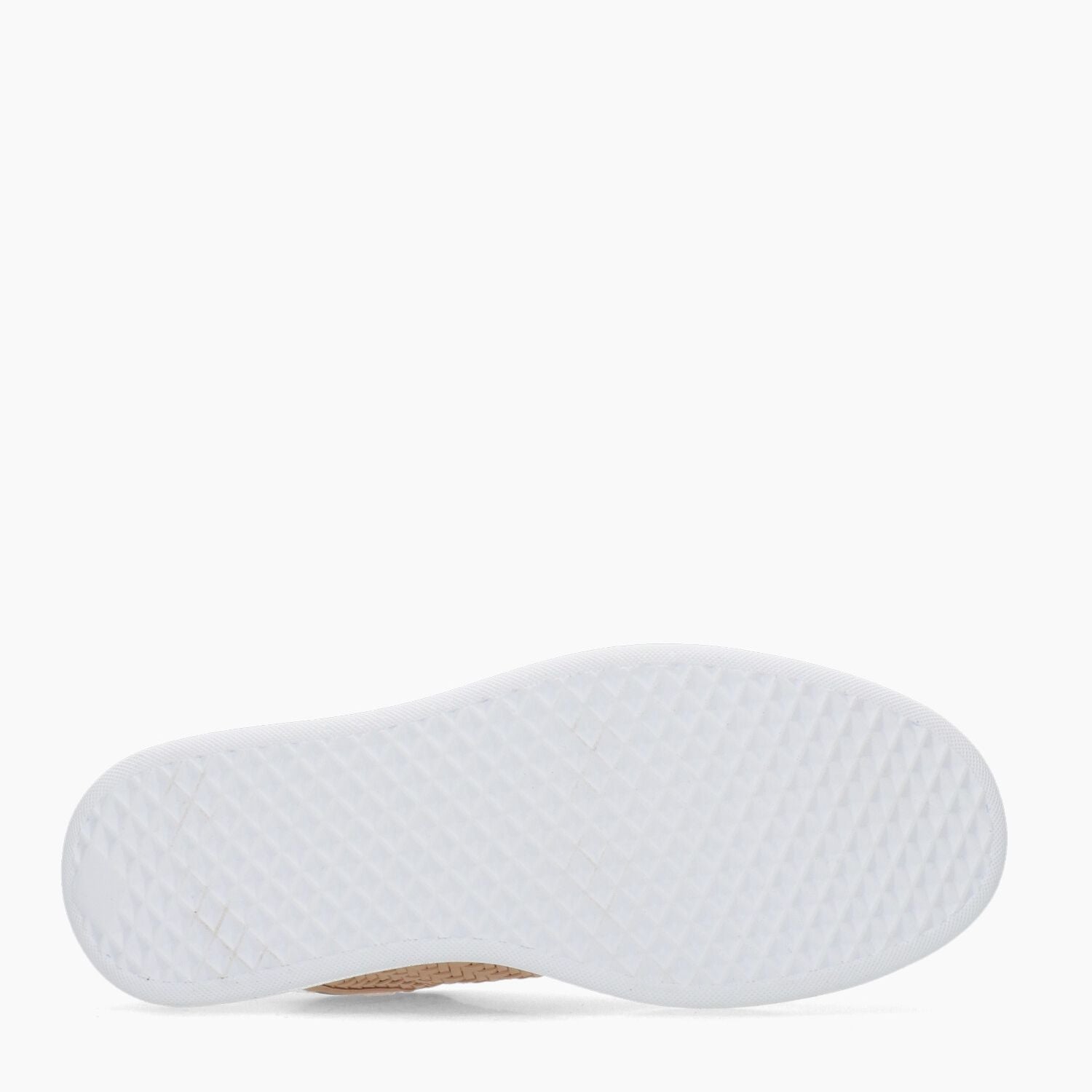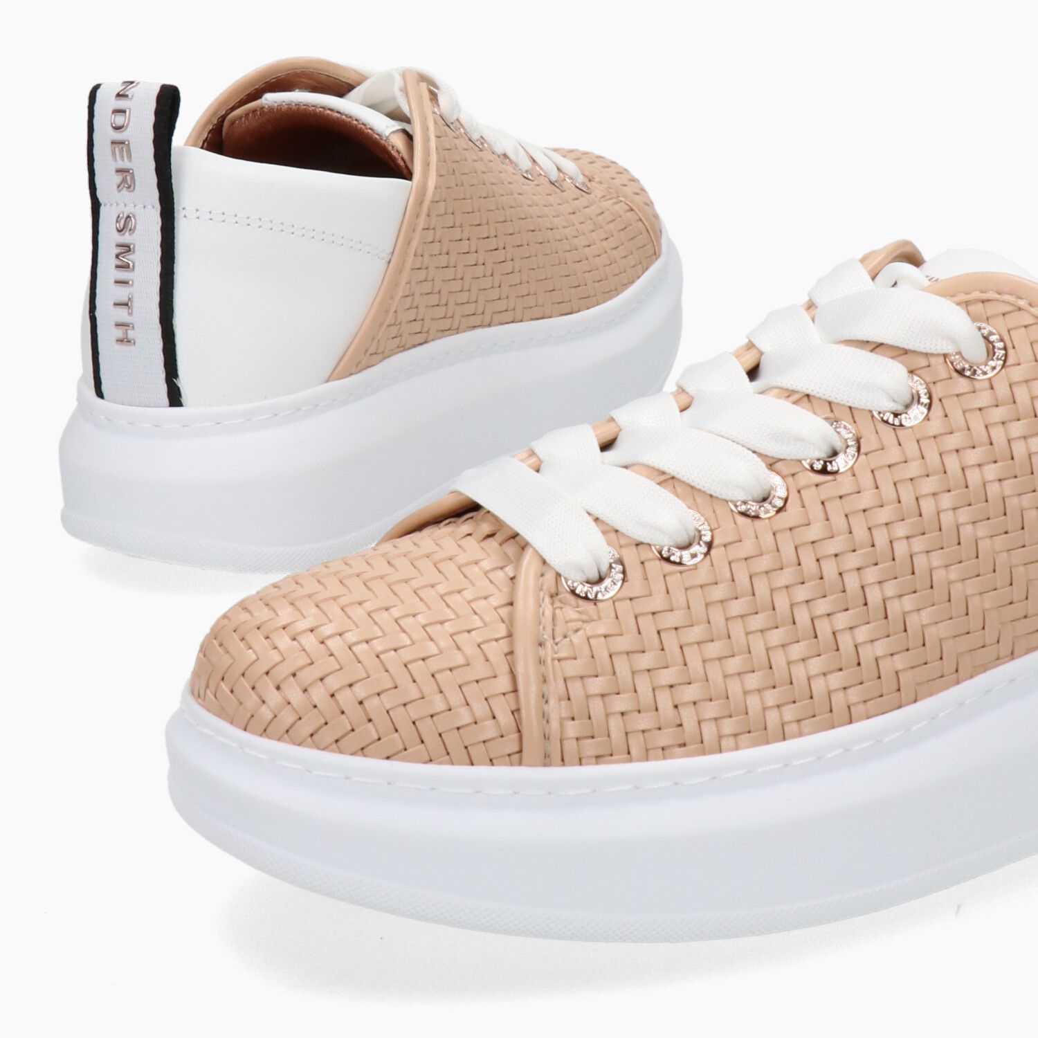 Nude woven leather sneakers with white leather heel, rubber sole.