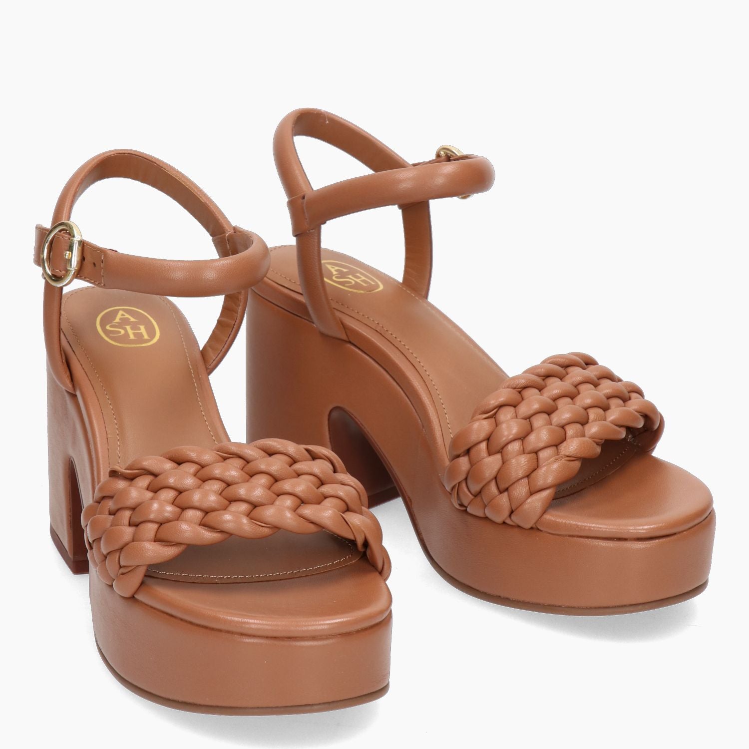 Tan leather sandal with braided strap. Ankle strap with adjustable buckle. Leather lining. Rubber sole with 8 cm heel and 3 cm platform. Ash Spring/Summer collection.