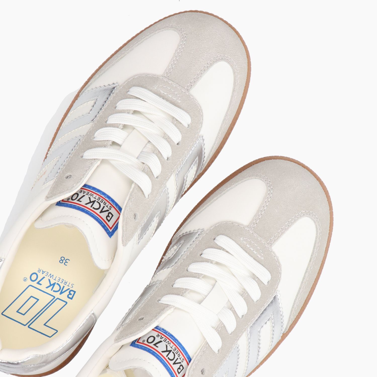 White leather sneakers with light gray suede inserts. Silver laminated leather side logo. Fabric lining with removable insole. Putty-colored rubber sole. Back 70 women's spring/summer collection.