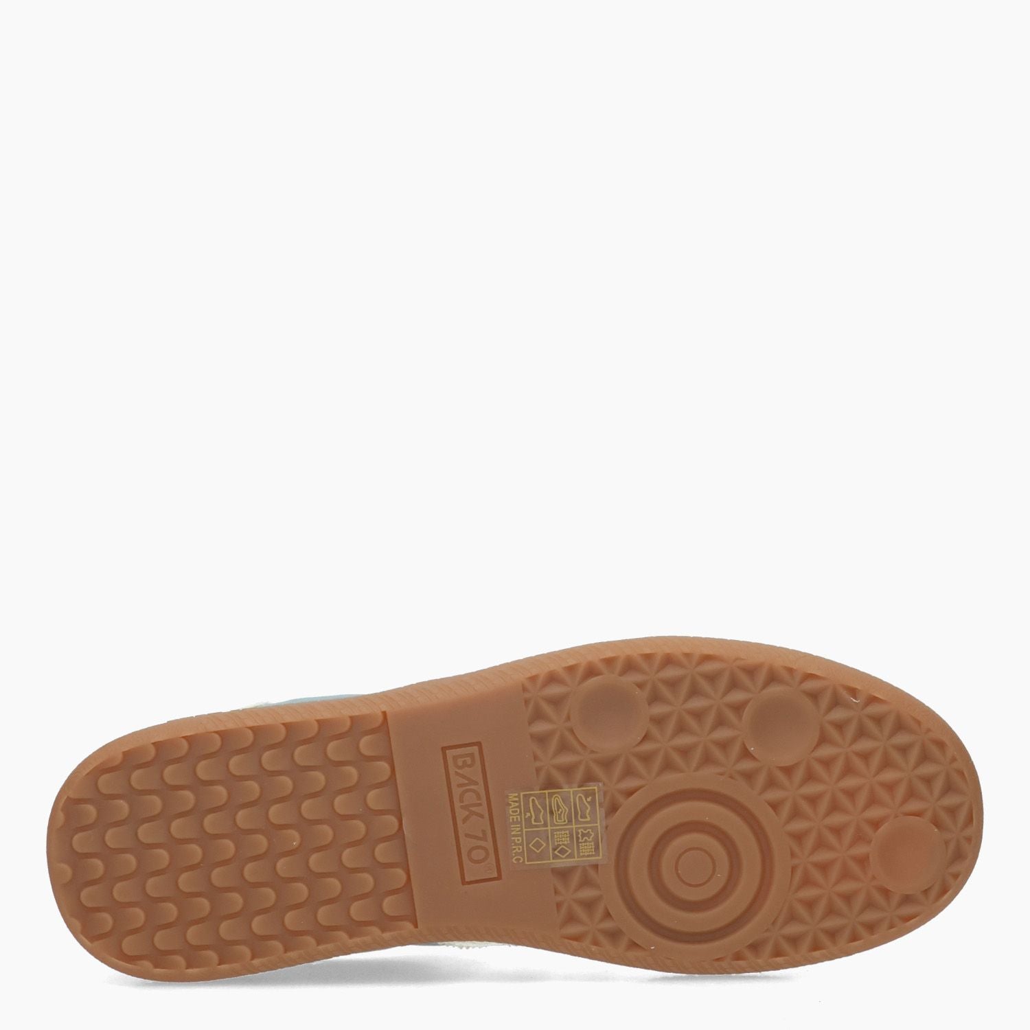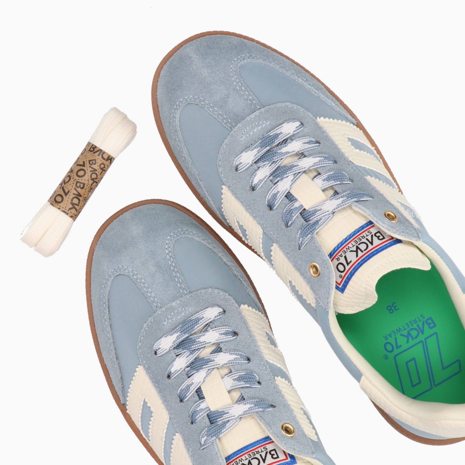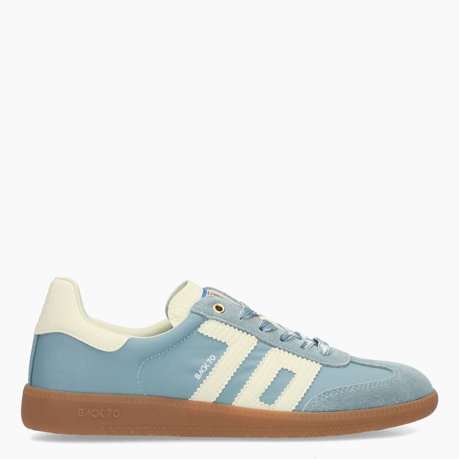 Light blue nylon sneakers with matching suede inserts. Ivory leather side logo. Patterned lace-up closure with a spare pair of ecru cotton laces. Fabric lining with removable insole. Putty-colored rubber sole. Back 70 women's spring/summer collection.