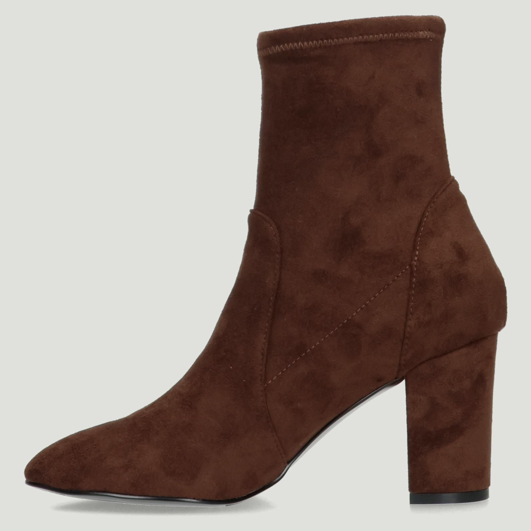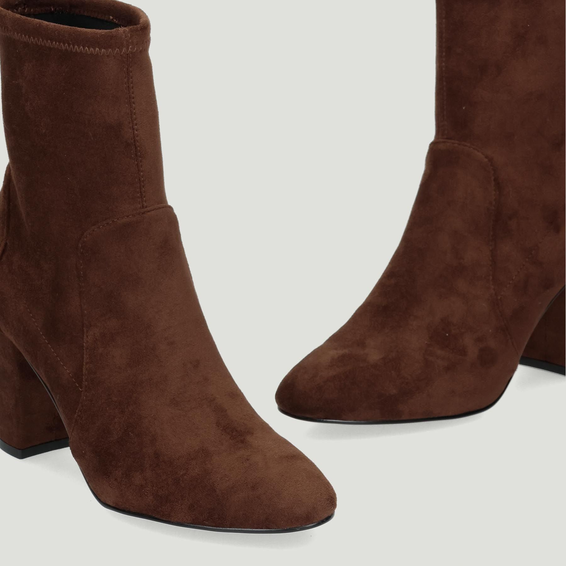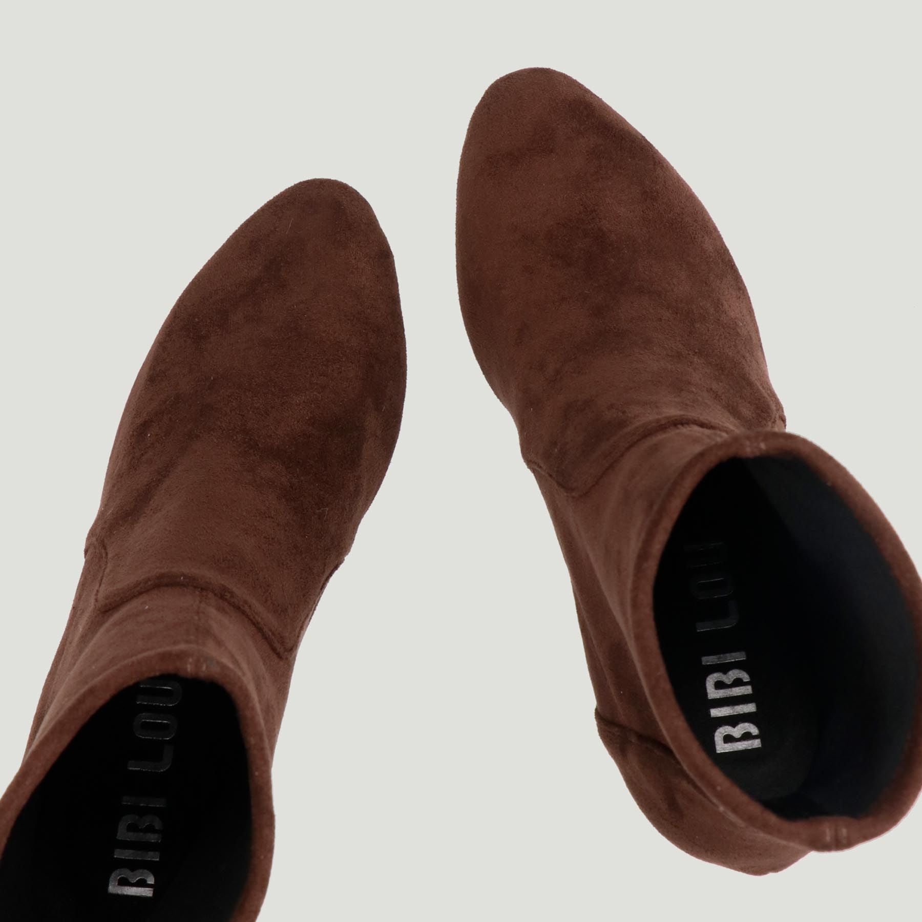 Brown faux suede ankle boot. Leather lining. Internal zip closure. Rubber sole with 7.5 cm heel. Bibi Lou women's fall/winter collection.