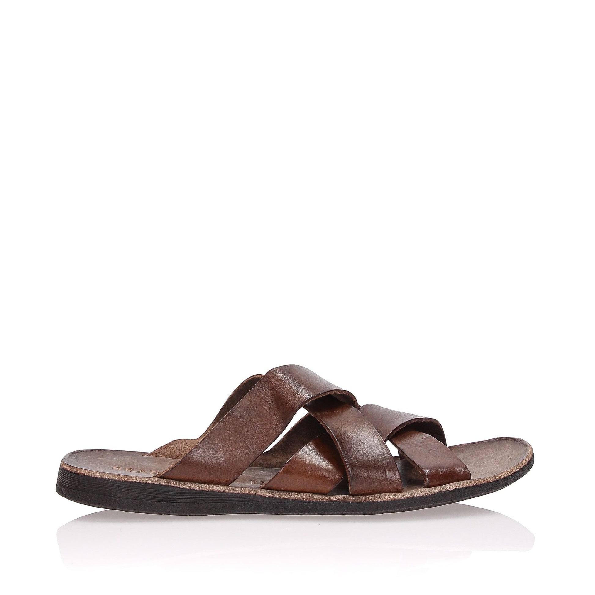 Slipper with crossover strap. Brown leather upper with crossover leather straps. Open toe. Brown leather lining. Black rubber outsole. 2 cm sole. Brador men's Spring/Summer collection.