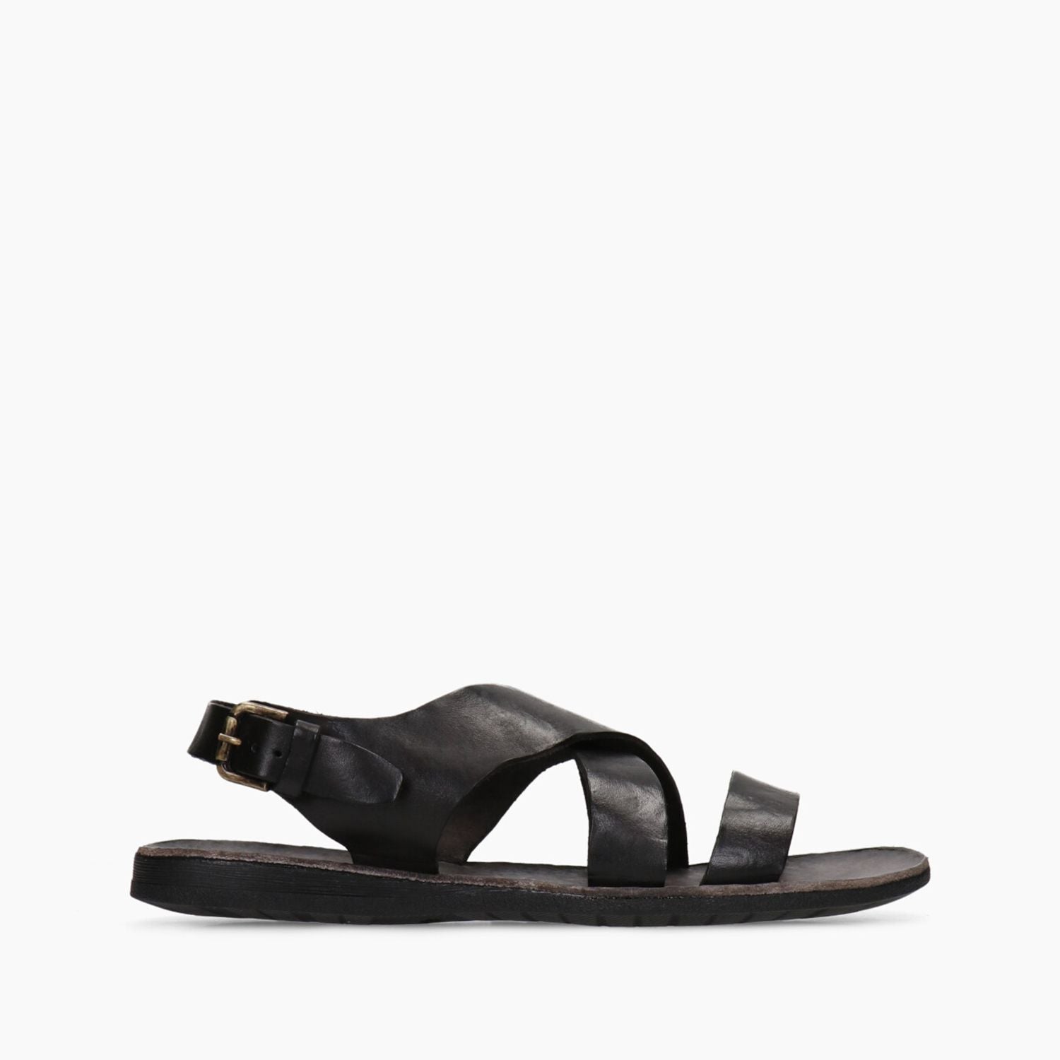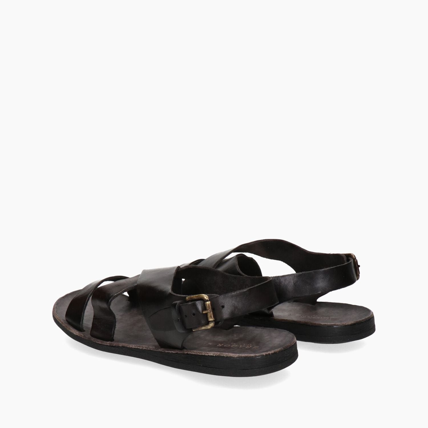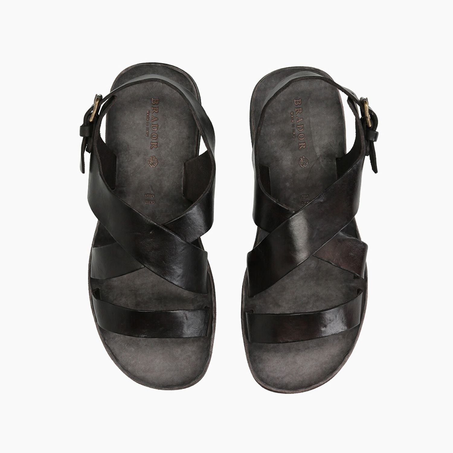 Garment-dyed brown leather sandals with a double crossover strap and buckled heel strap. Leather insole. Rubber sole. Brador men's Spring/Summer collection.