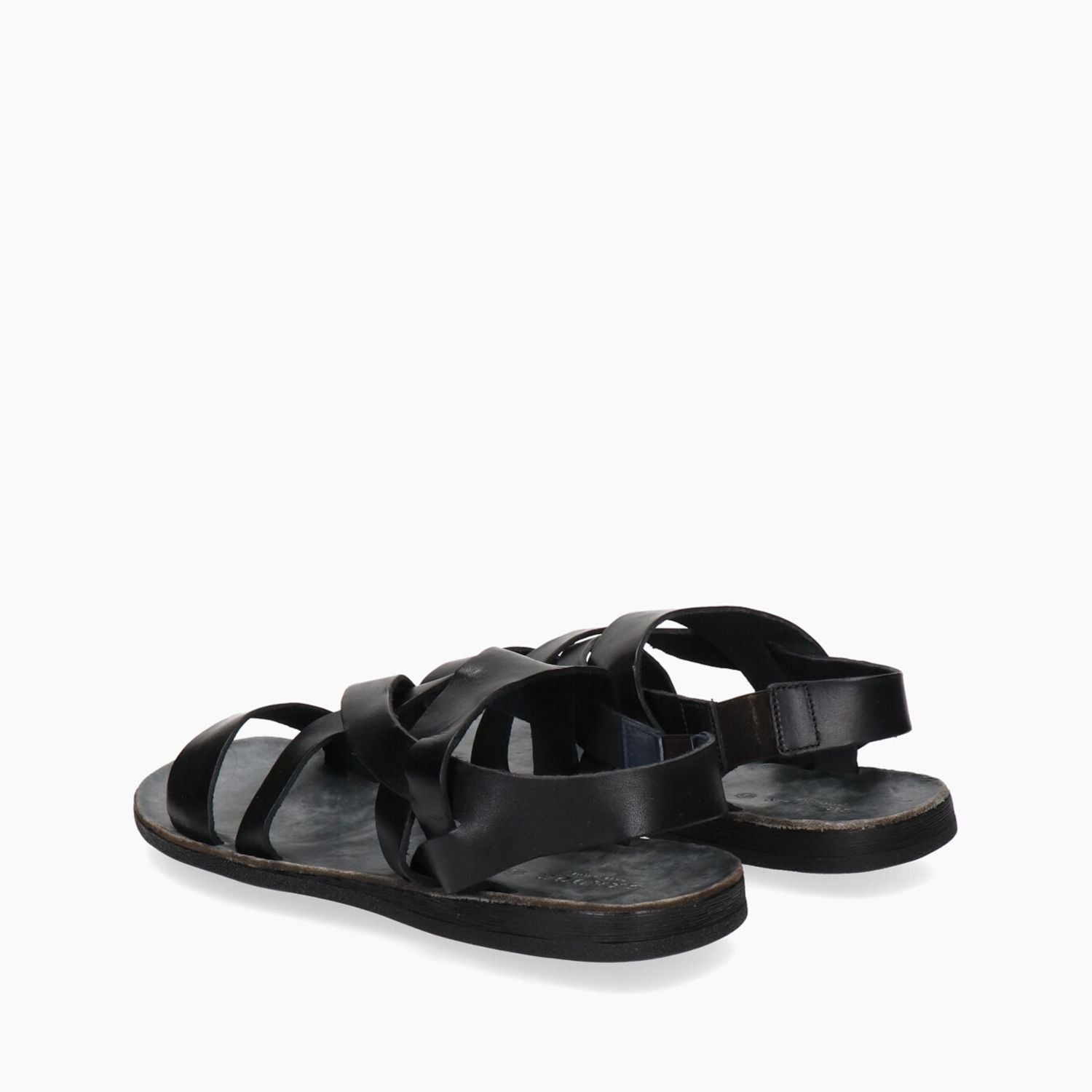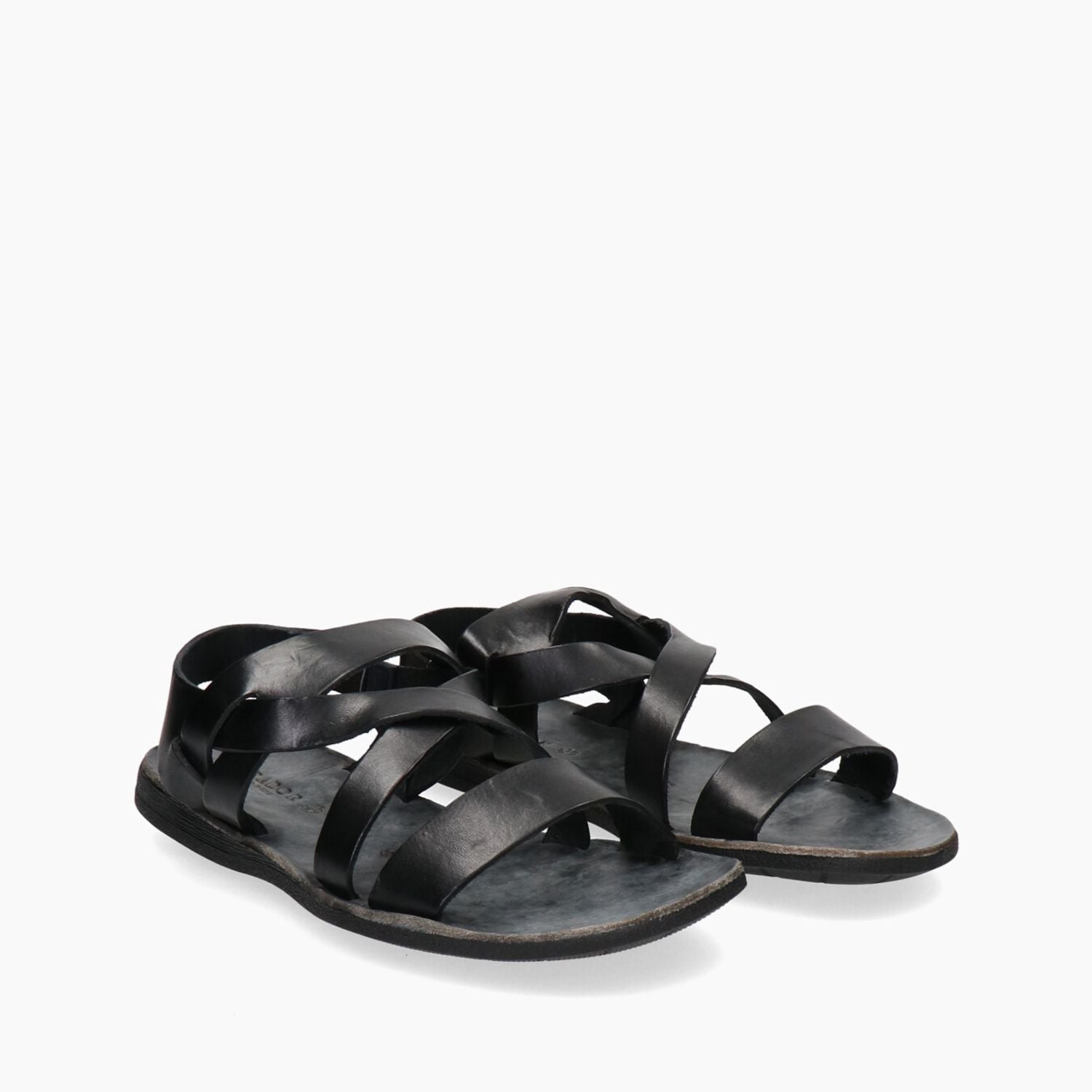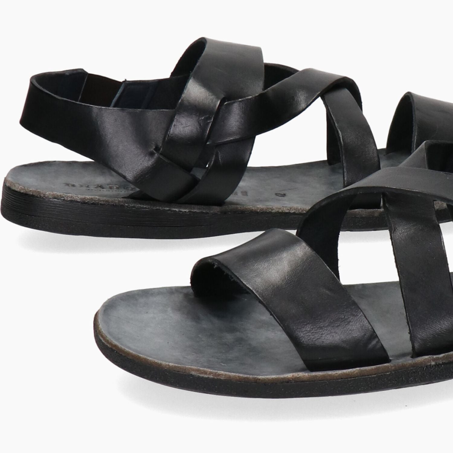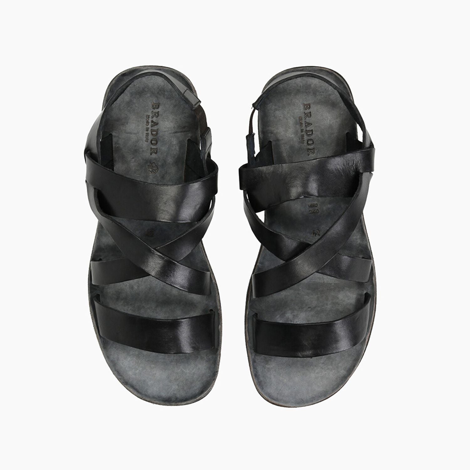 Garment-dyed black leather sandals with a double crossover strap and elasticated heel strap. Leather insole. Rubber sole. Brador men's Spring/Summer collection.