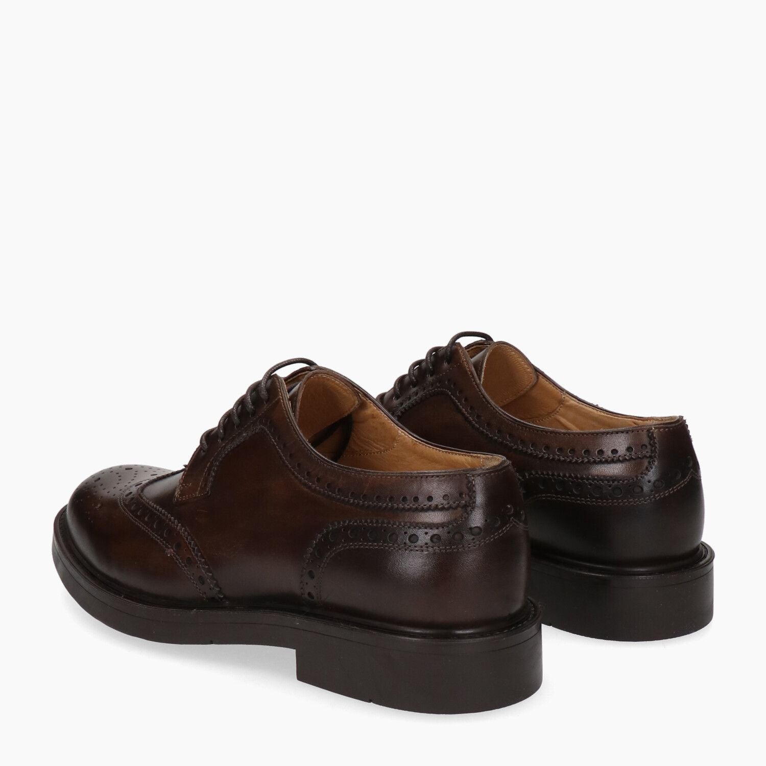 Derby in aged dark brown leather with English swallowtail, stitched rubber sole.