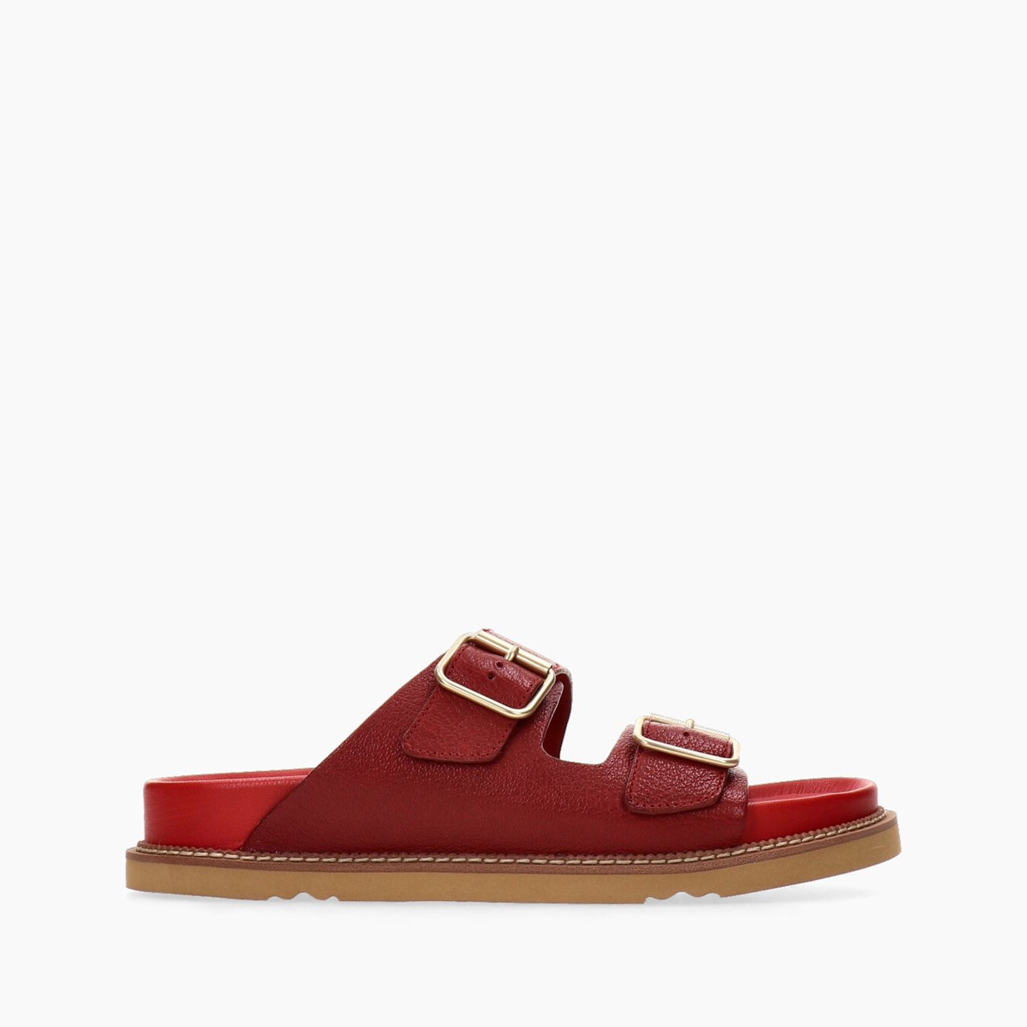 Red leather slippers with leather-covered footbed, double gold buckle, rubber sole.