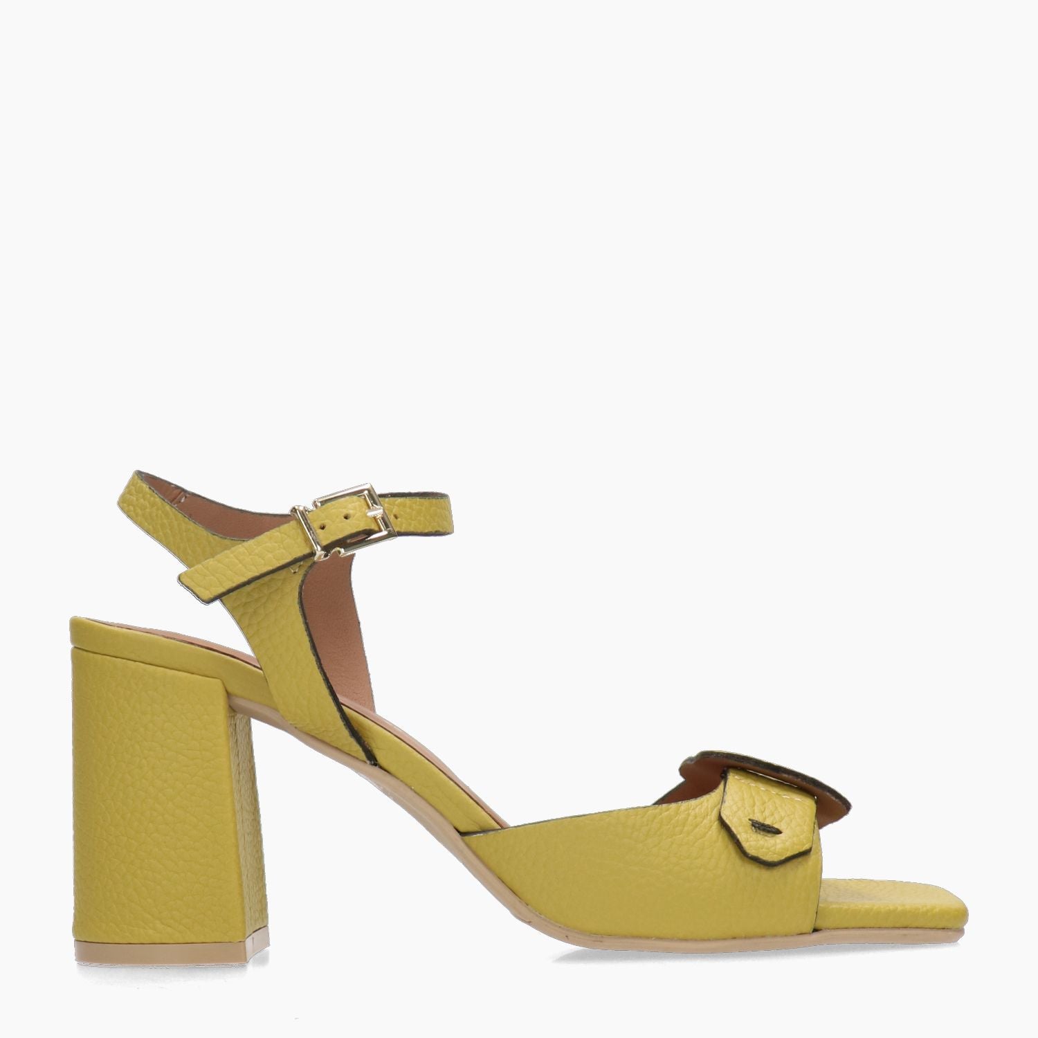 Curry-colored hammered leather sandal. Adjustable ankle strap. Rubber sole with 7 cm heel. Carmens women's spring/summer collection.
