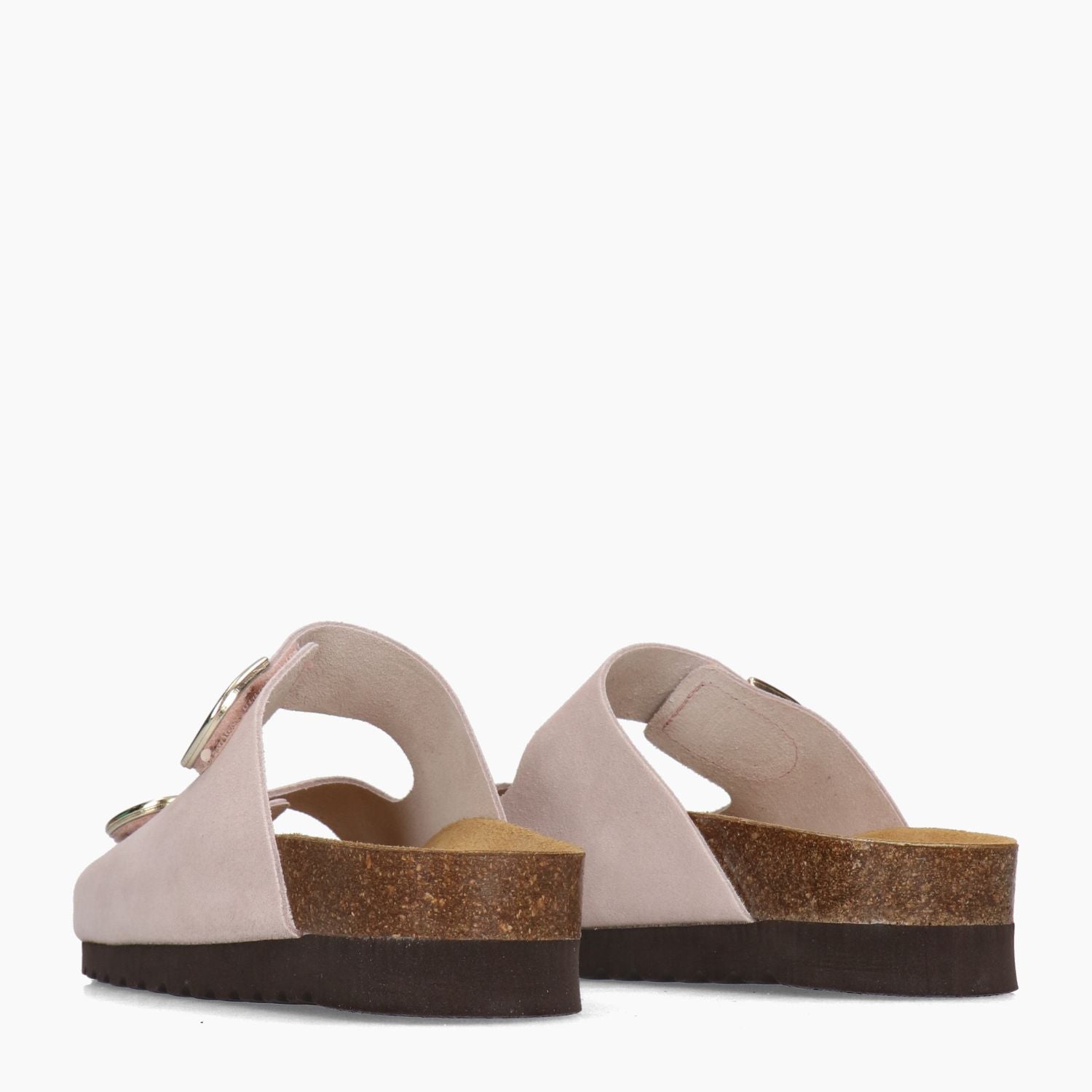 Grunland slipper with a powder pink suede upper. Double Velcro closure. Leather lining with padded insole. Rubber sole with a 4 cm wedge. Grunland women's Spring/Summer collection.