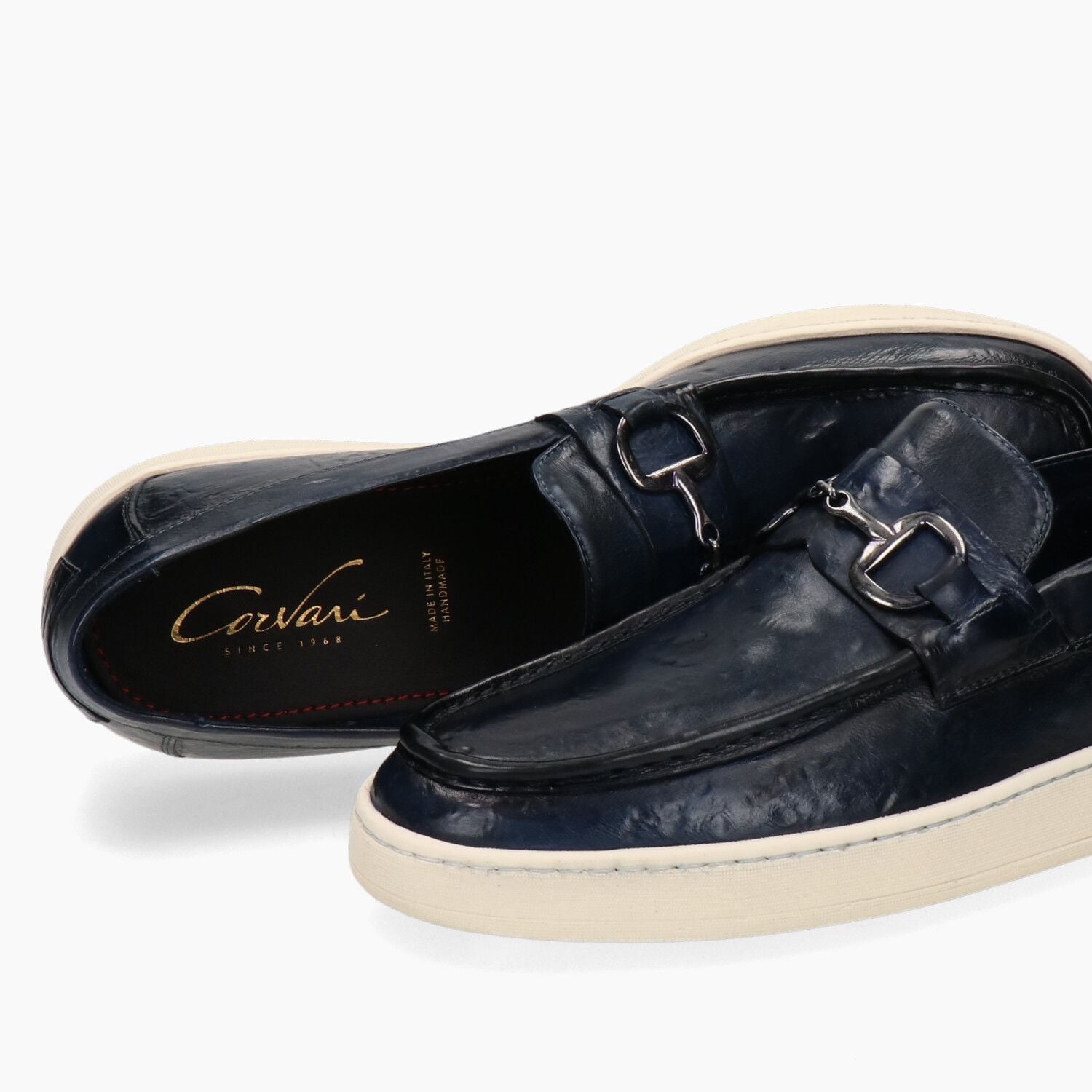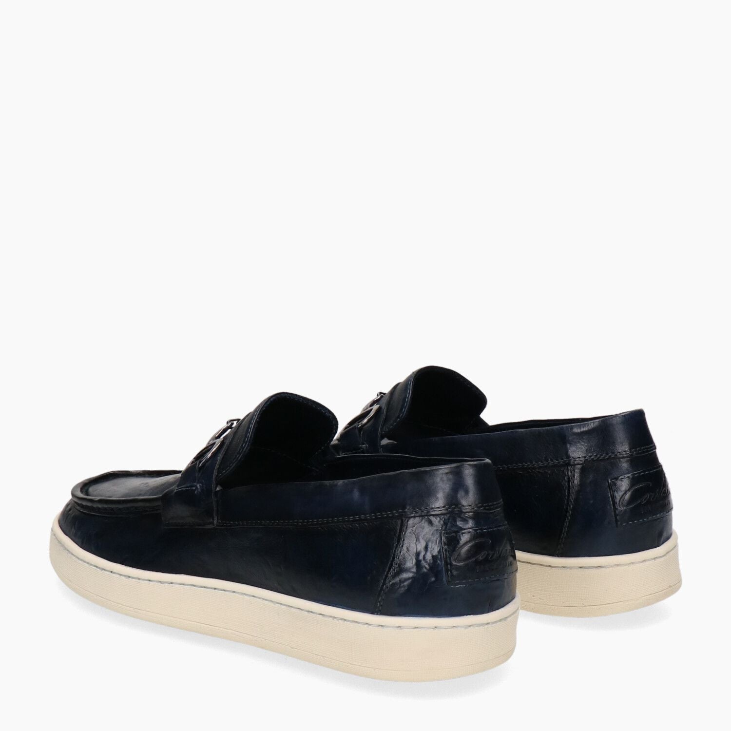 Slip-on sneaker in blue leather with metal clamp, rubber sole.