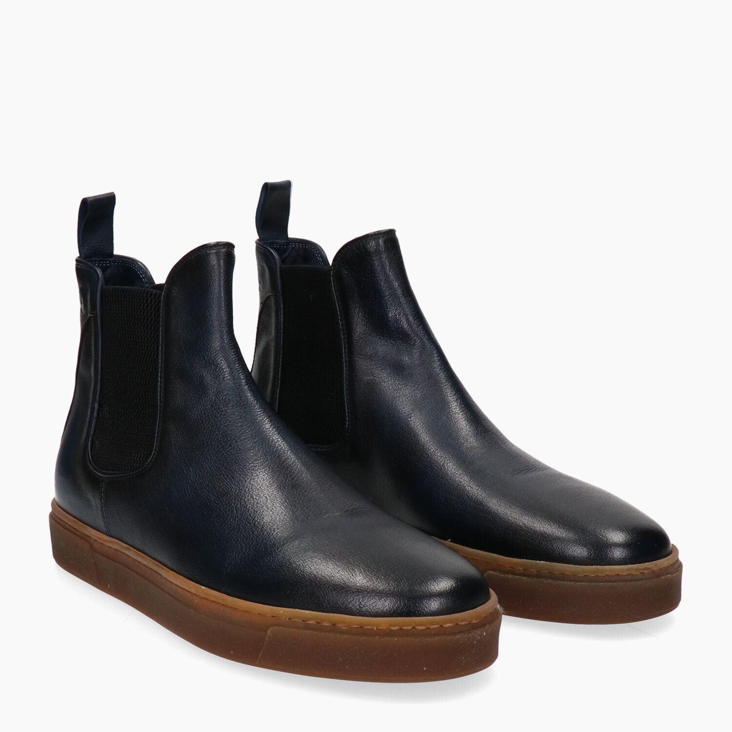 Ankle boots in aged blue leather with elastic sides, natural latex sole (Lactae Hevea).