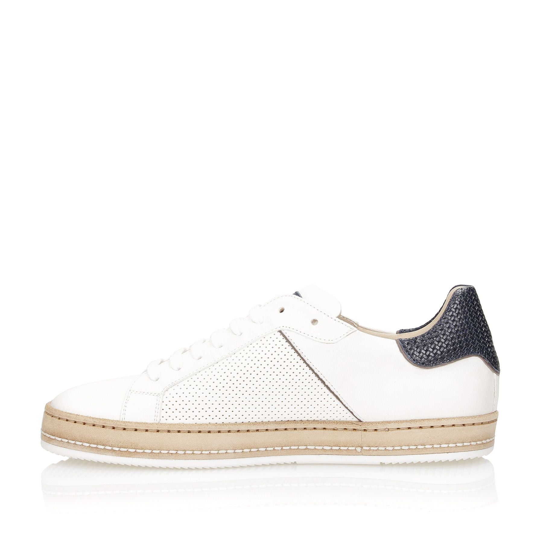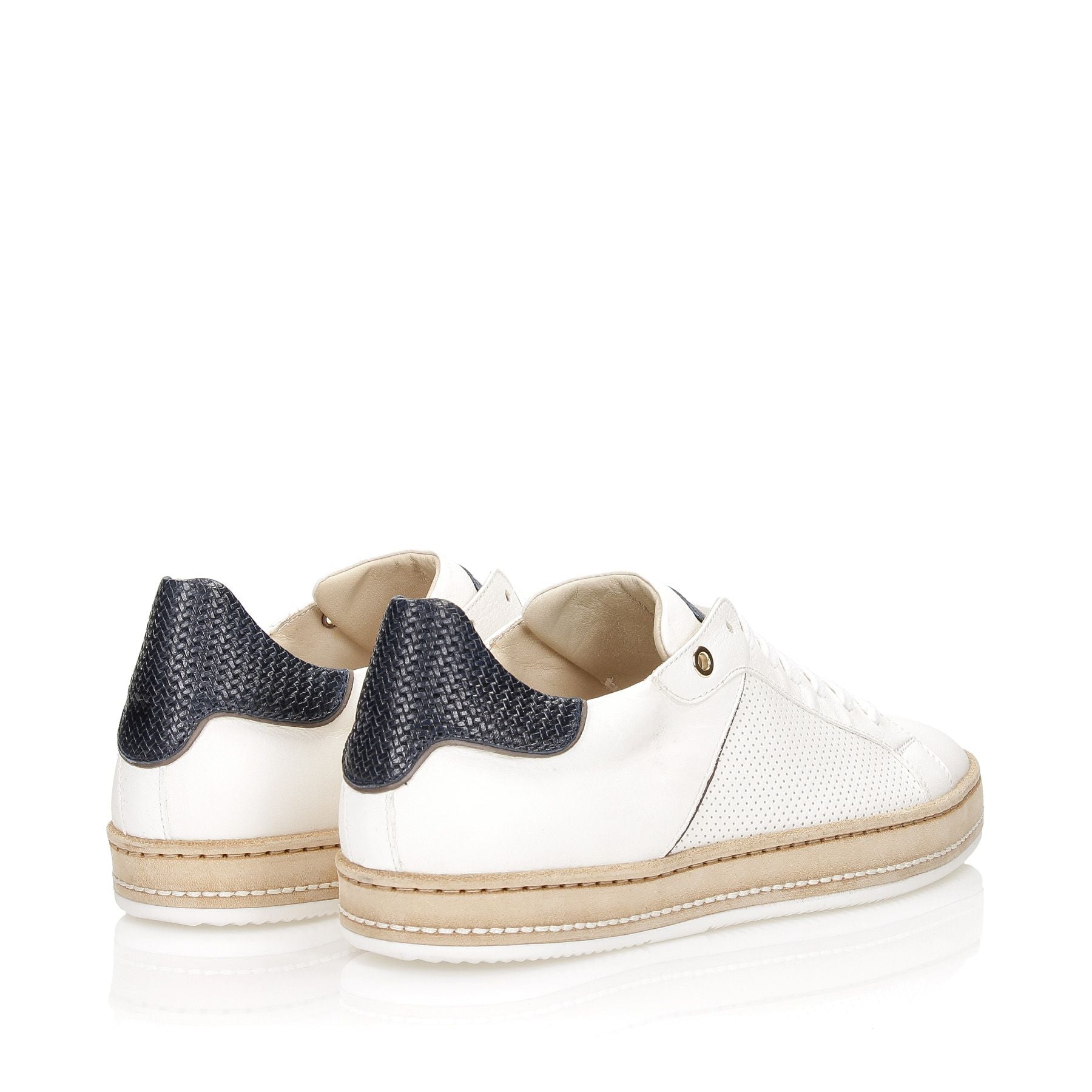 Sporty off-white leather shoe with stitched leather welt, dark blue heel, rubber sole.