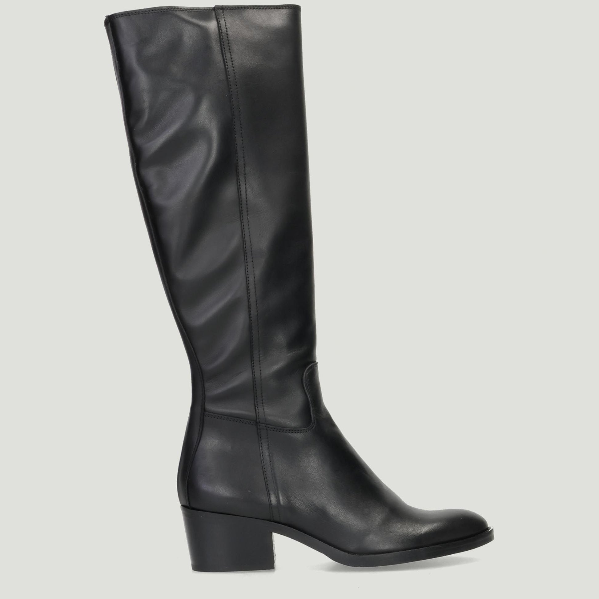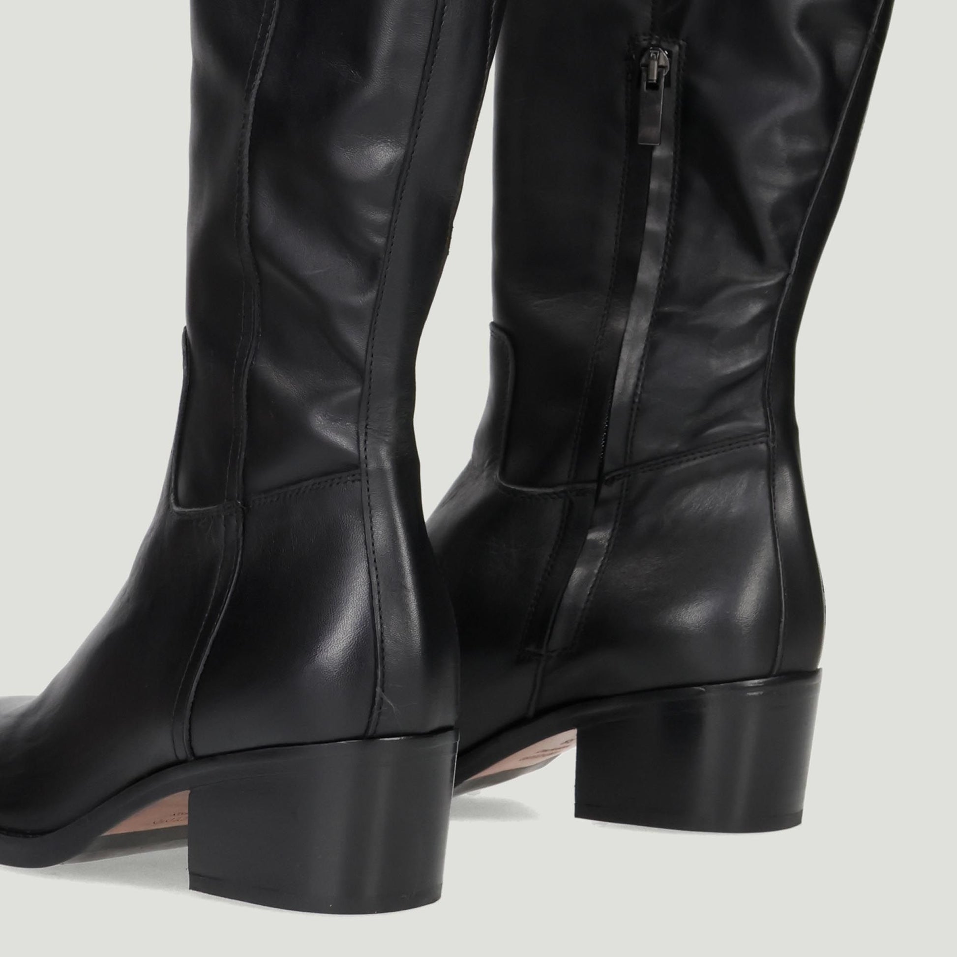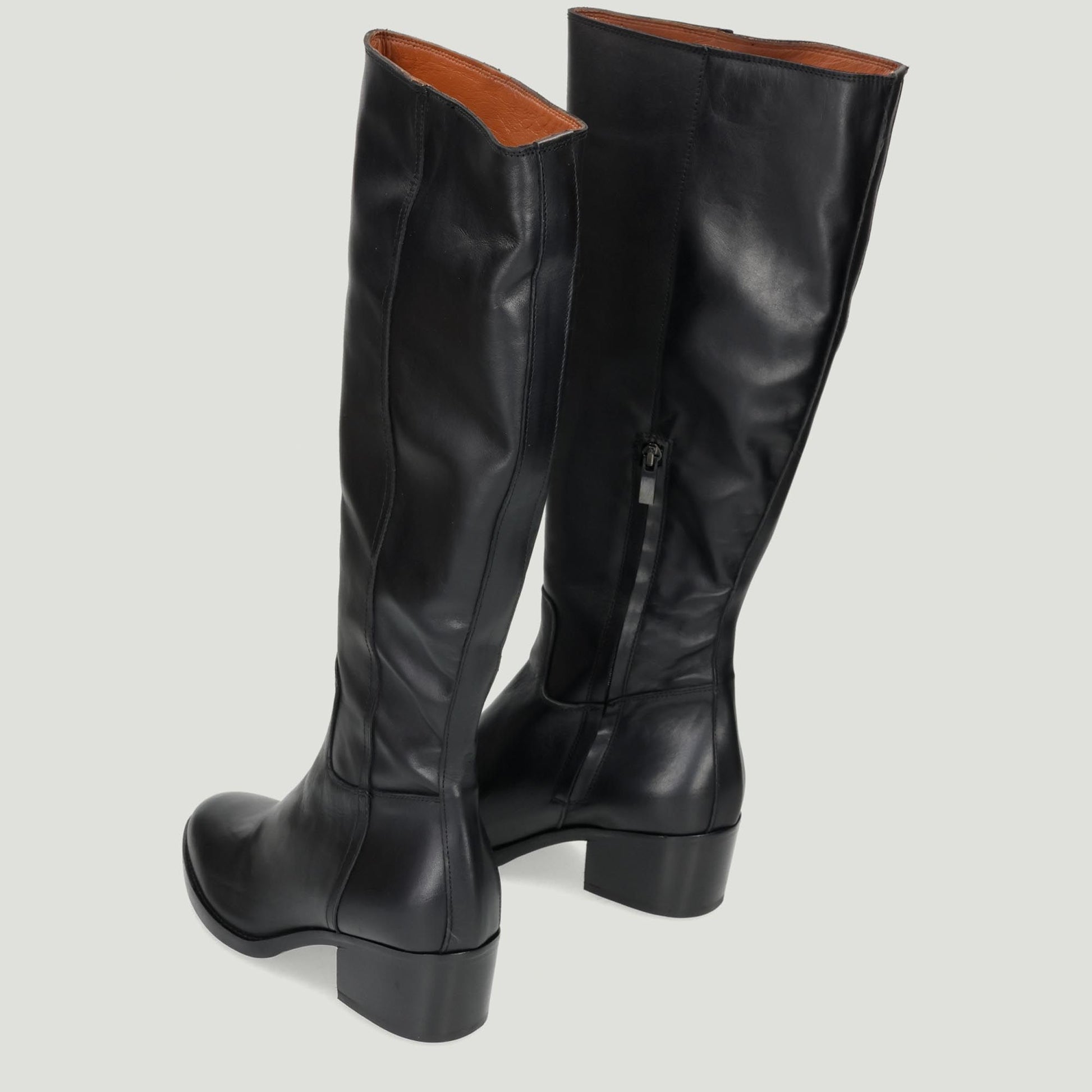 Boots with black leather upper. Shaft height 38 cm measured from the heel (size 40). Short side zip closure. Leather lining. Leather and rubber sole with 4 cm heel. Women's Curiosite' Fall/Winter collection.