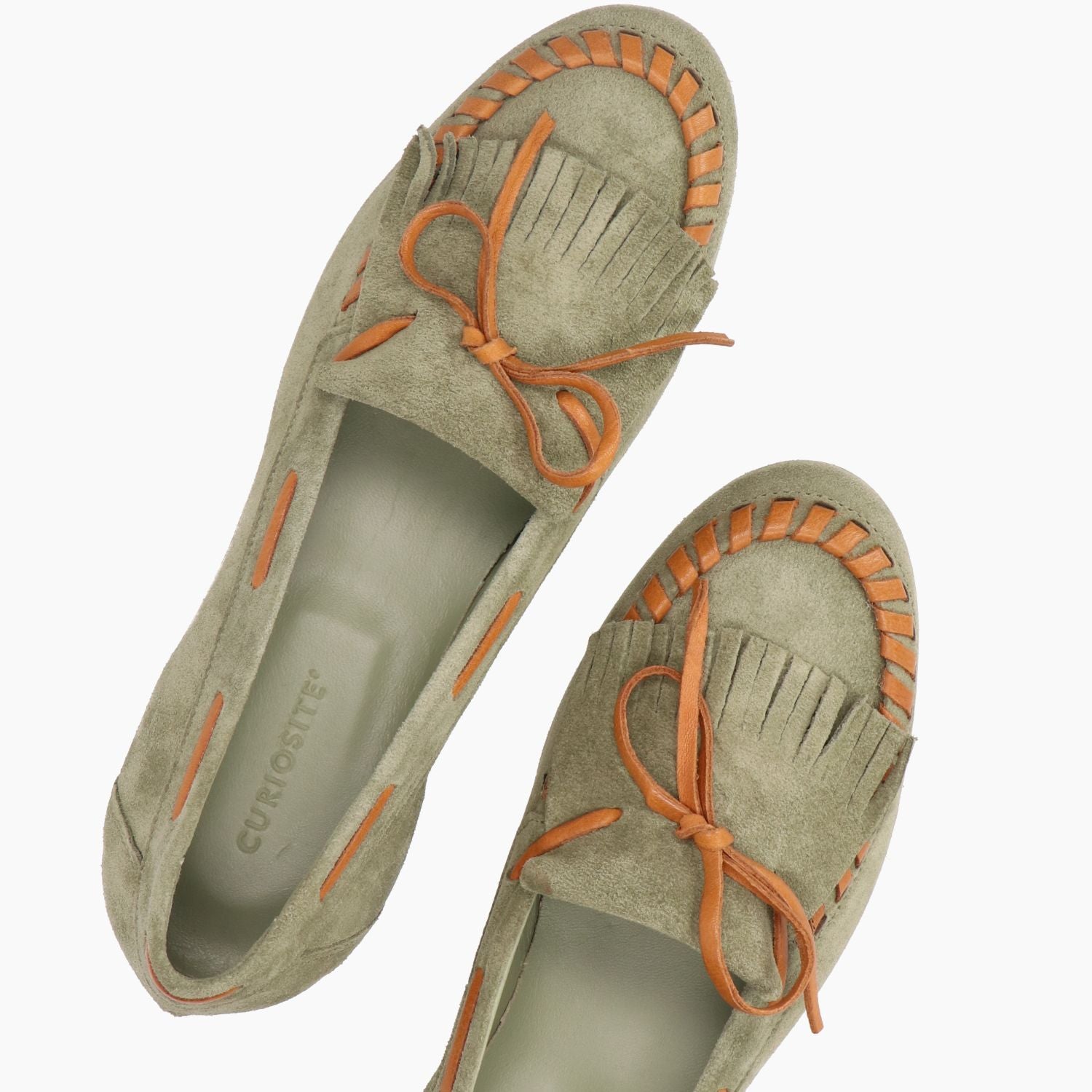 Green suede moccasin with tan leather inserts and fringe. Leather lining. Non-removable insole. Leather sole with rubber insert and 1 cm heel. Women's Curiosite' collection.