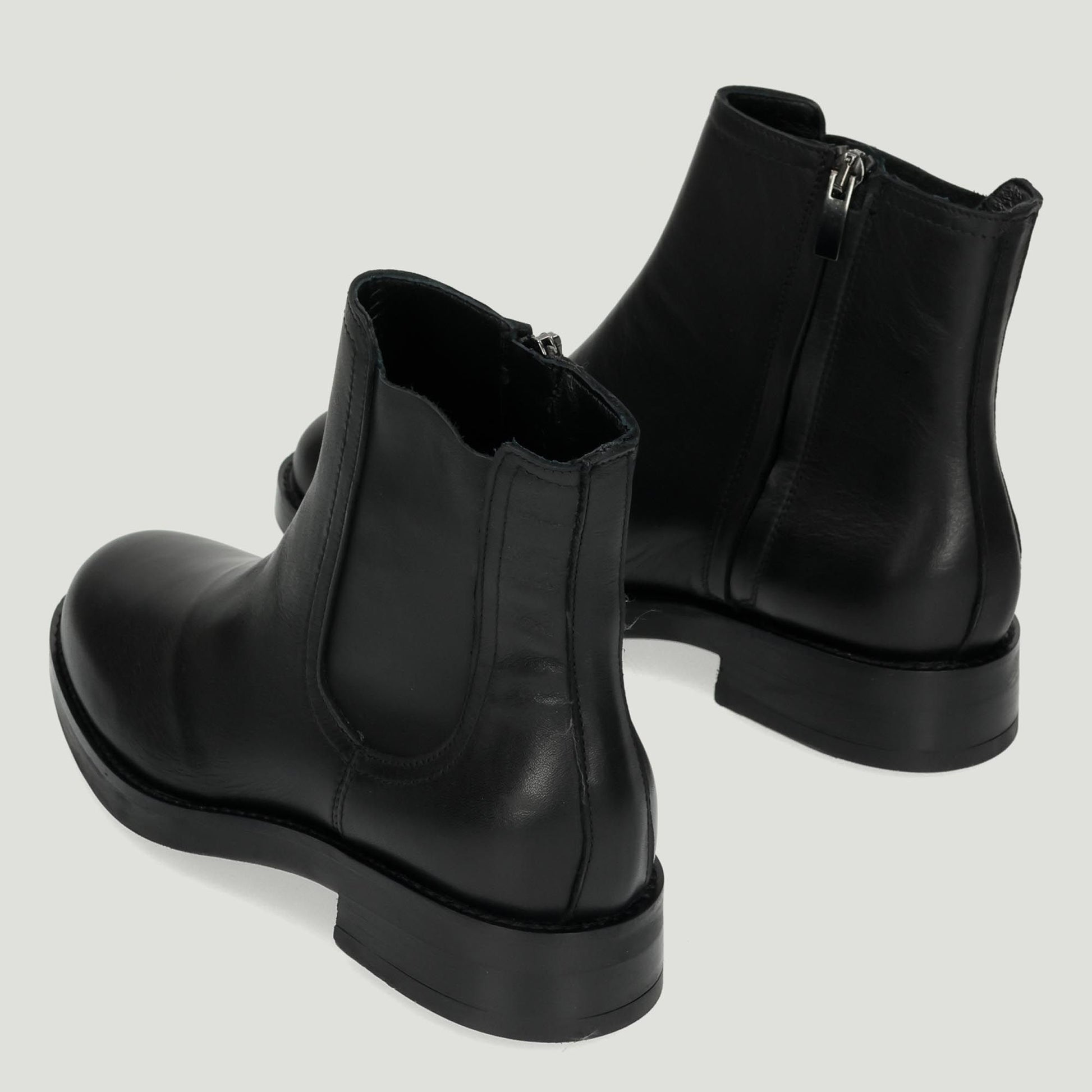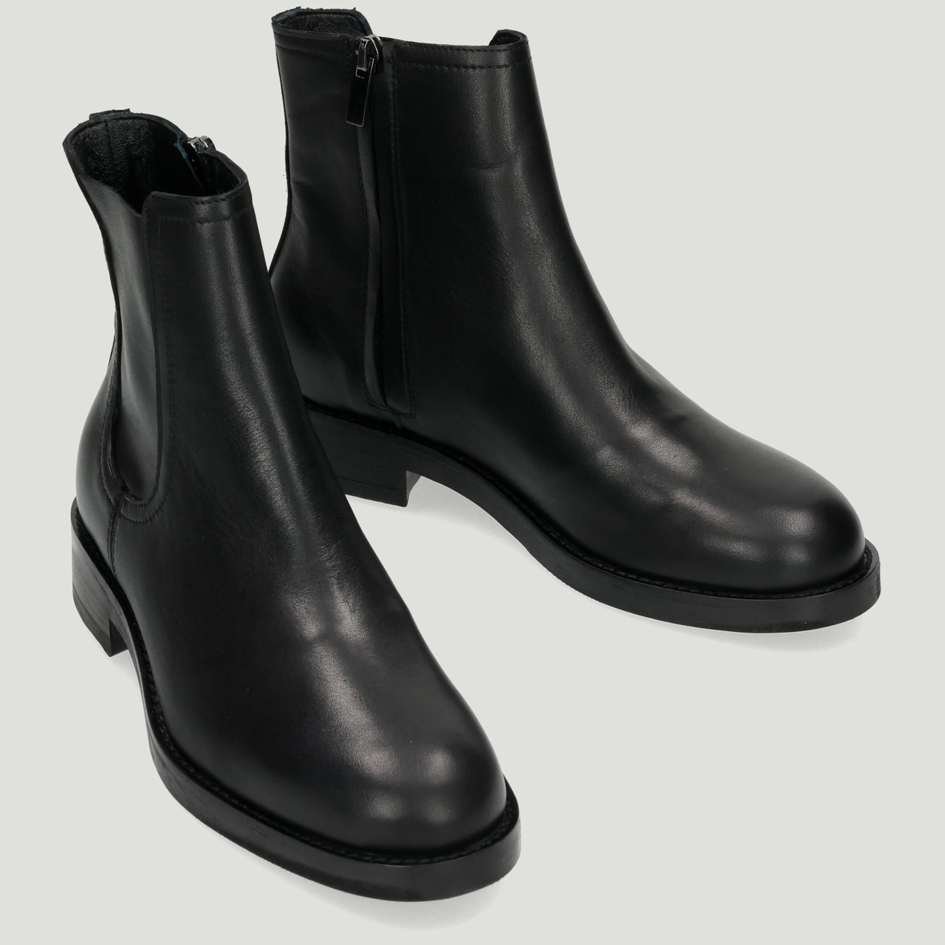Ankle boot with black leather upper and Beatles-effect. Side zip closure. Leather lining. Rubber sole with 3 cm heel. Women's Curiosite' Fall/Winter collection.